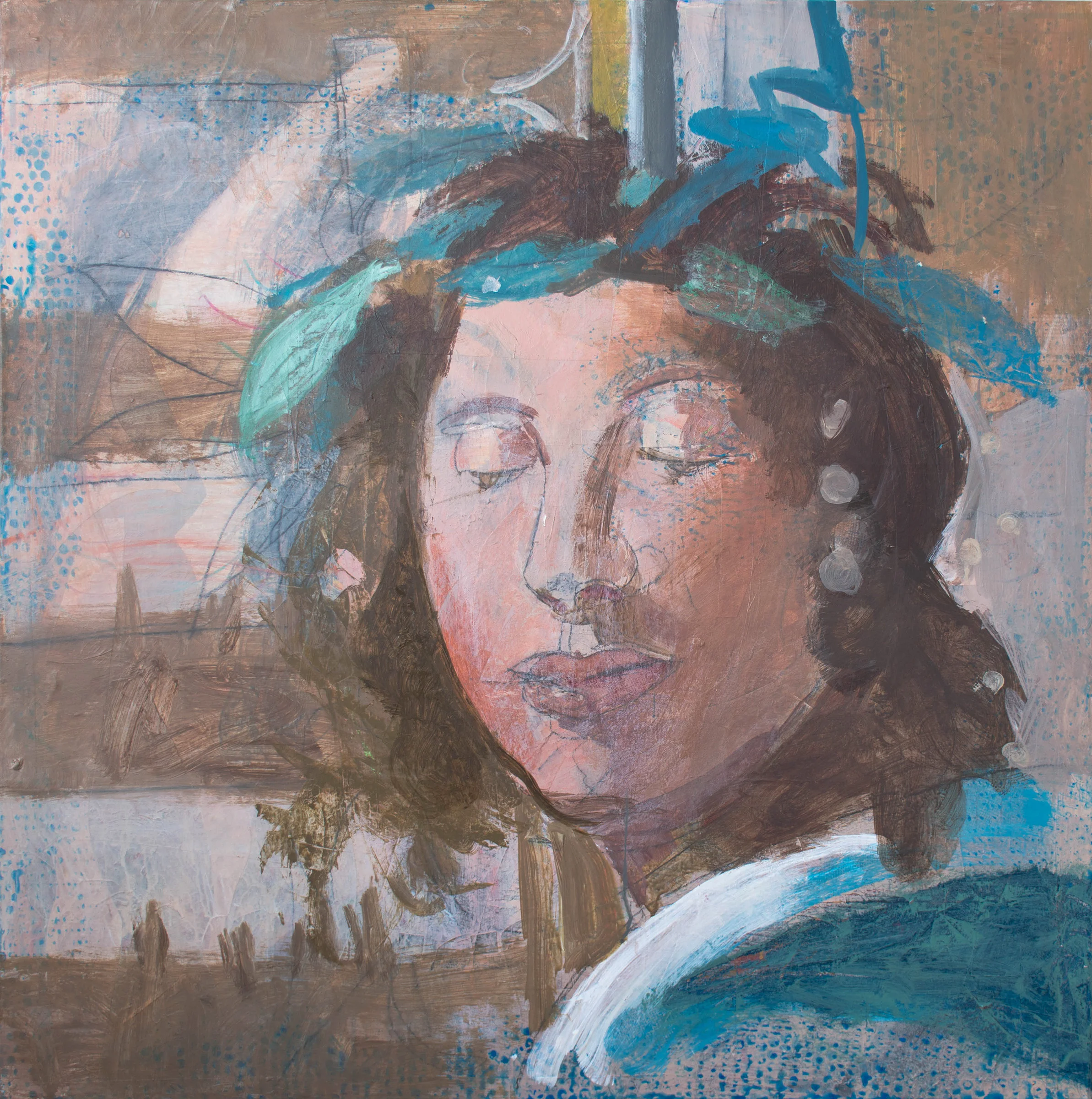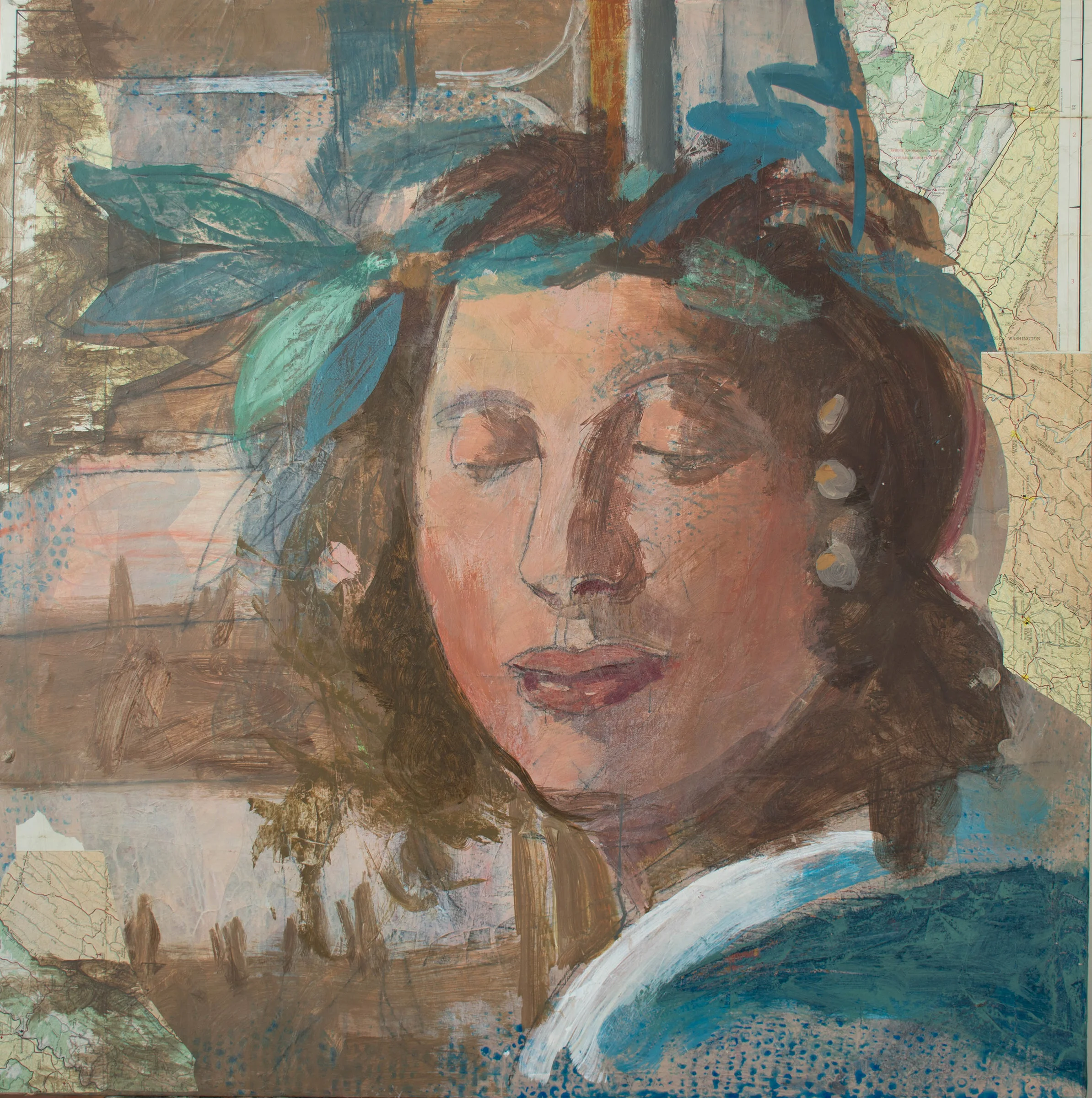 1:26 PM: i contiinue work on gaze 34 today. for the moment, i am still drawing from the model in vermeer's the art of painting. her almost beatific, one might say, expression combined with his masterly use of oil paint makes this painting stand out. thus far, none of the underlying collage elements are visible, having been painted over. but a map could appear at any moment! and now, back to work while i still have my morning energy.