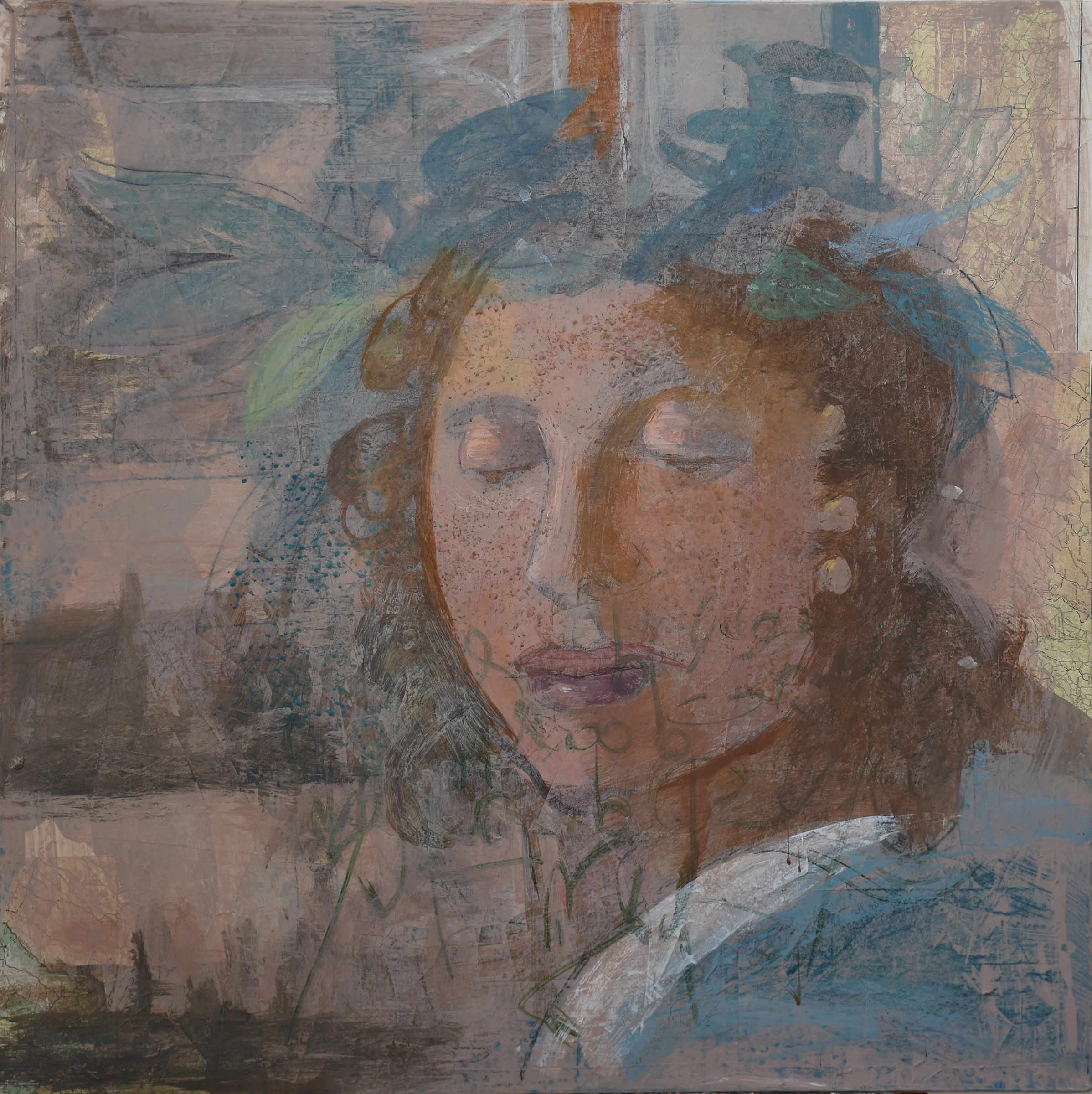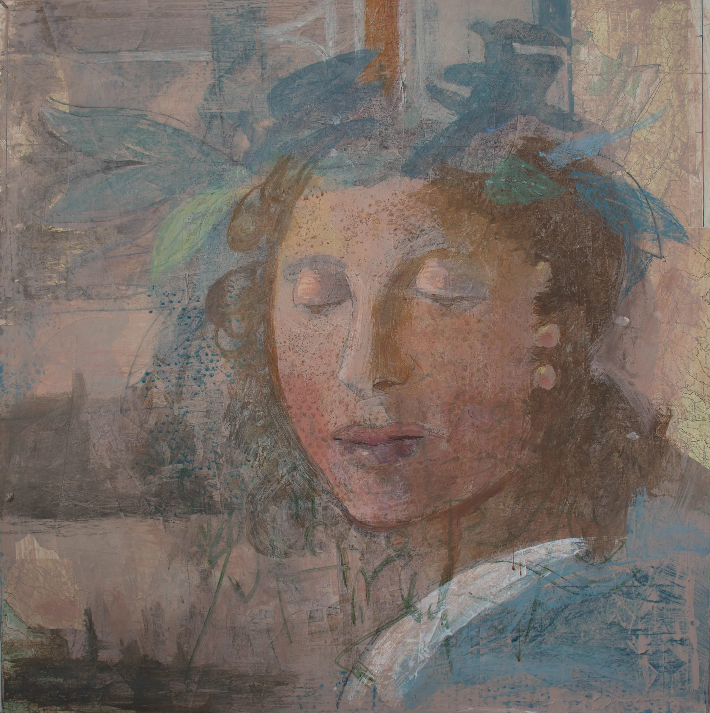 3:46 PM: after the plein air, i returned to the studio, where i invited mikela over to give me feedback on gaze 34. she loves the painting, but felt the green calligraphic marks on the face itself were taking her attention away from the sensitivity of her expression. i concurred,and proceeded to remove almost all traces of them, except for the area beneath the face, where i feel they add to the strength and complexity of the composition.