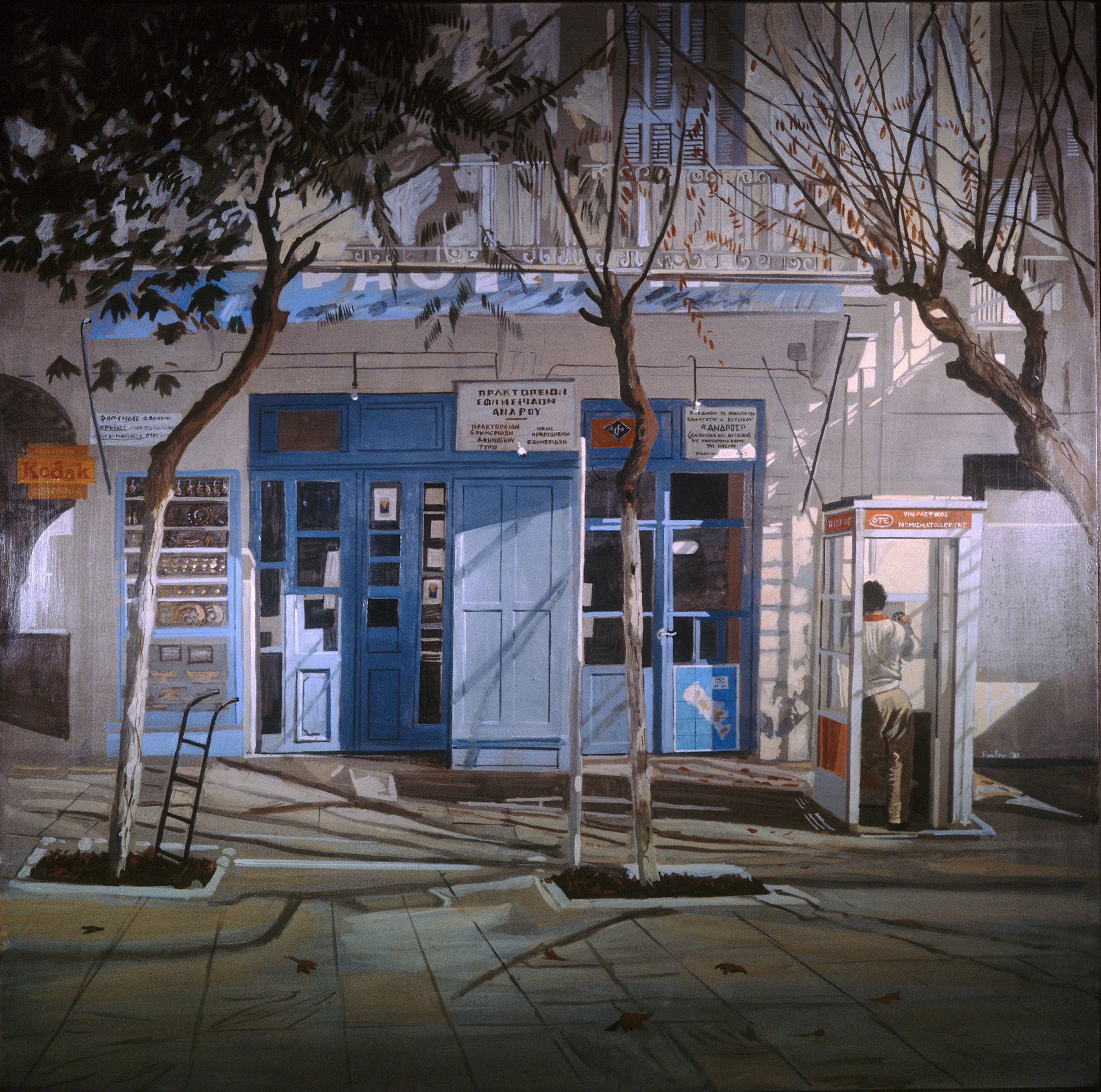 the long distance call egg tempera on board 16x16" 1978 private collection, athens, greece