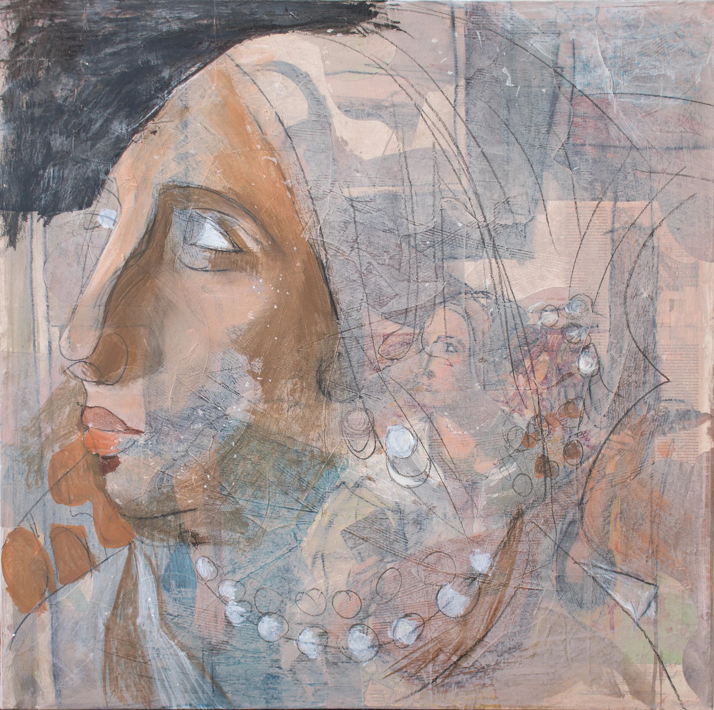 she came over a second time, when she had just completed her work. the moment she opened the studio door, i was declaring gaze 35 resolved. the true test will be tomorrow morning, after i've brought it back to the house & hung it. right now, i'm considering this a breakthrough painting in the series. one of the reasons for this is the interplay of the ghost image peeking through on the right, which works both as content: revealing the story behind the face, and as form, creating a subtle interplay of biomorphic shapes that, i believe, allow the suggested forms to become equal in importance to the realist content of face, necklace, letter and so on.