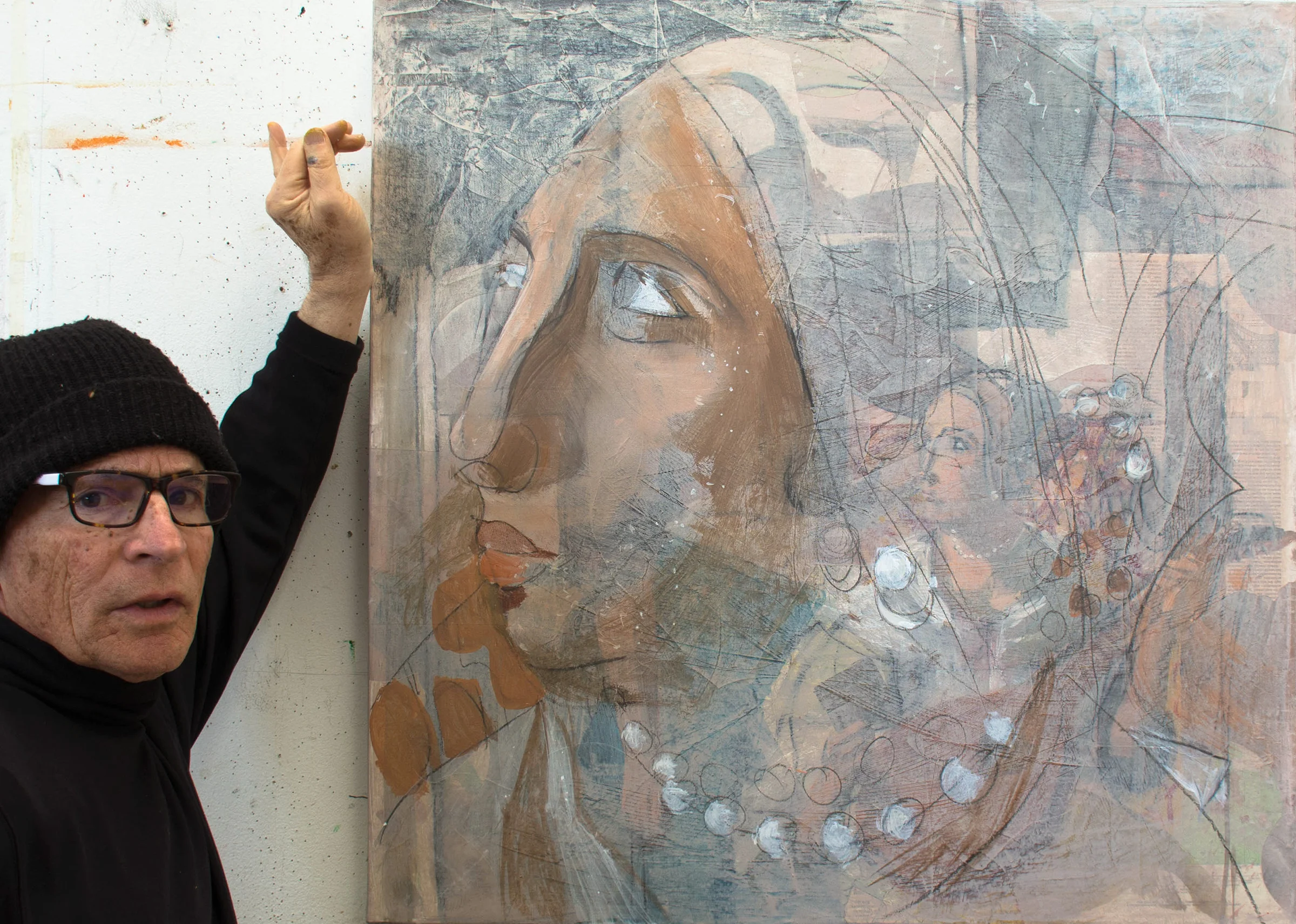 if you study the two images below; yesterdays version on the left, today's on the right, i think you'll agree with me that what i did this morning has made a big difference. i "pushed back" that dark area on the upper left. as a result, and see if you agree, your eye is no longer drawn to that area and instead is free to peruse the entire surface, as well as more deeply appreciating the "ghost image" to the right and the unforeseen suggestive forms created by the biomorphic shapes of the collaged paper. the only other intervention i made was to slightly heighten the whiteness of the earring and a few pearls on her necklace.