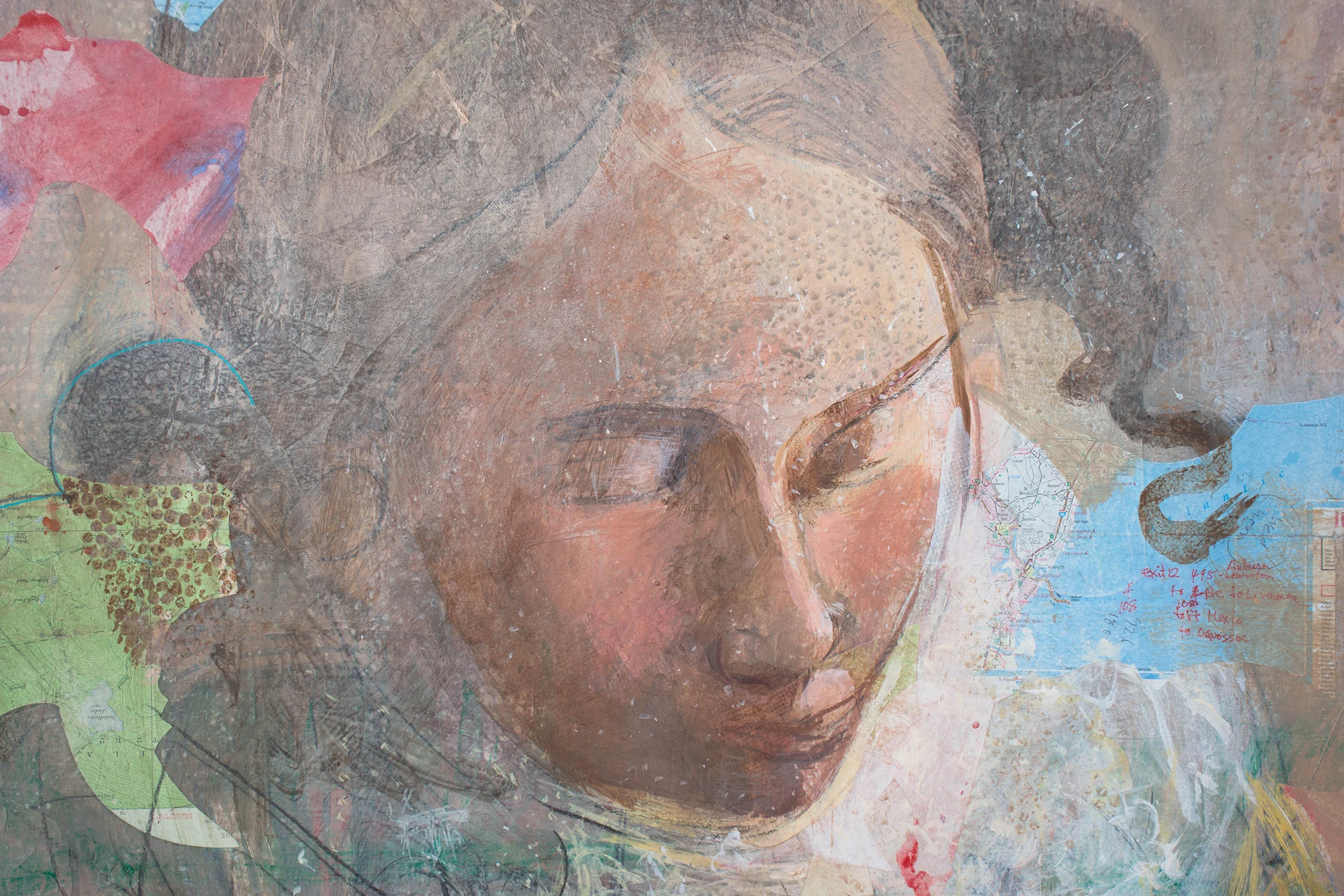 1:55 PM: i say persisting because i'm a bit exasperated with the nose & mouth in this painting. because she's looking down, her nose is foreshortened. it's very tricky not to make it look like she has a huge nose. but it also affects her mouth/ i may have to let it sit for a while & work on something else. yesterdays version is on the left; todays on the right. still not there. better, but not resolved. i think the bit of red i collaged onto the center area is a distinct improvement, compositionally.