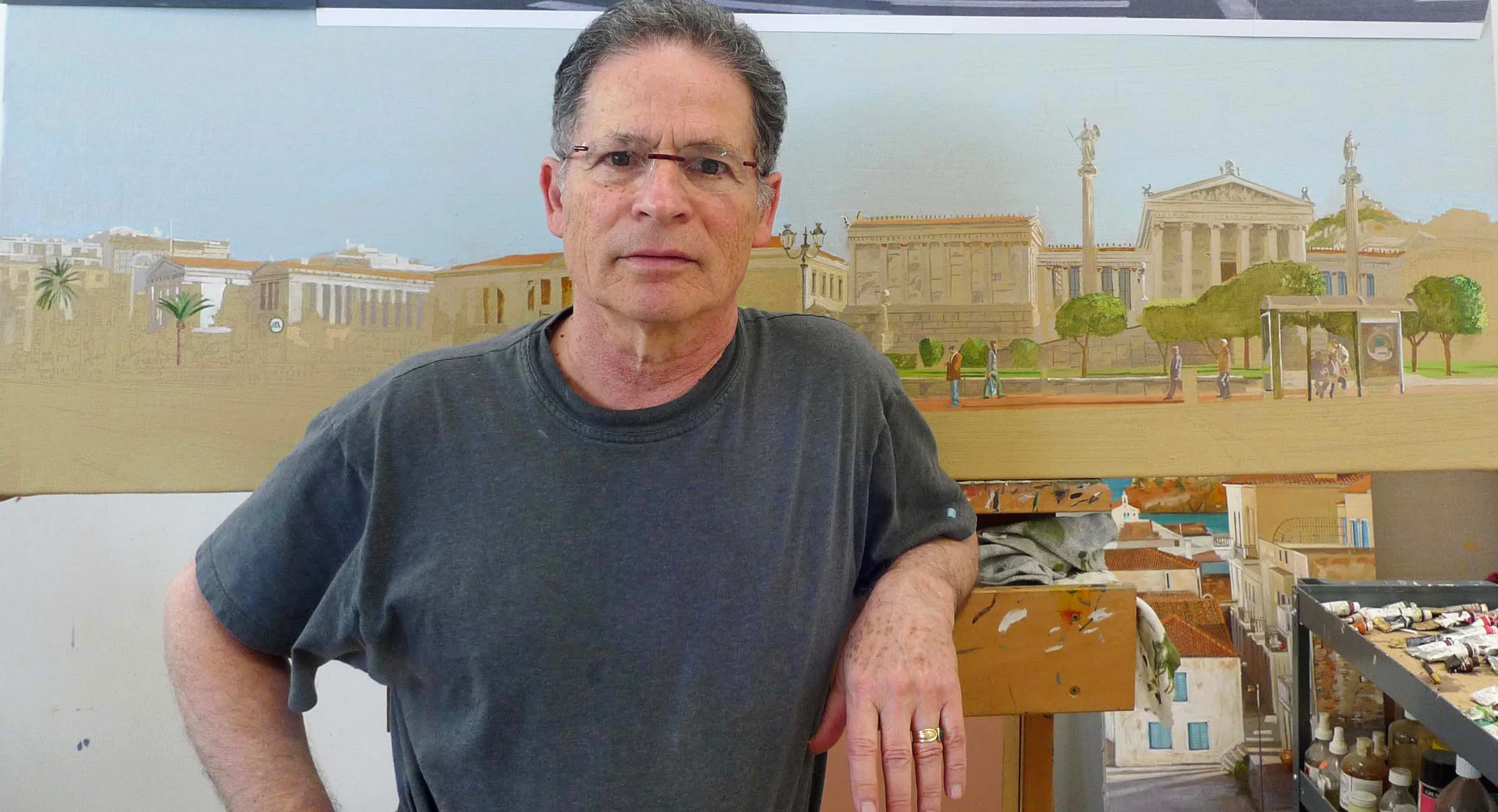 11:11 AM: i was going through my highly disorganized files and came across this photo, shot on june 11, 2010. i am standing in front of a partially completed painting titled university, in oil on linen. it's based on photos i took of athens university the previous year, and was shown in my 2010 solo exhibition at skoufa gallery in athens.