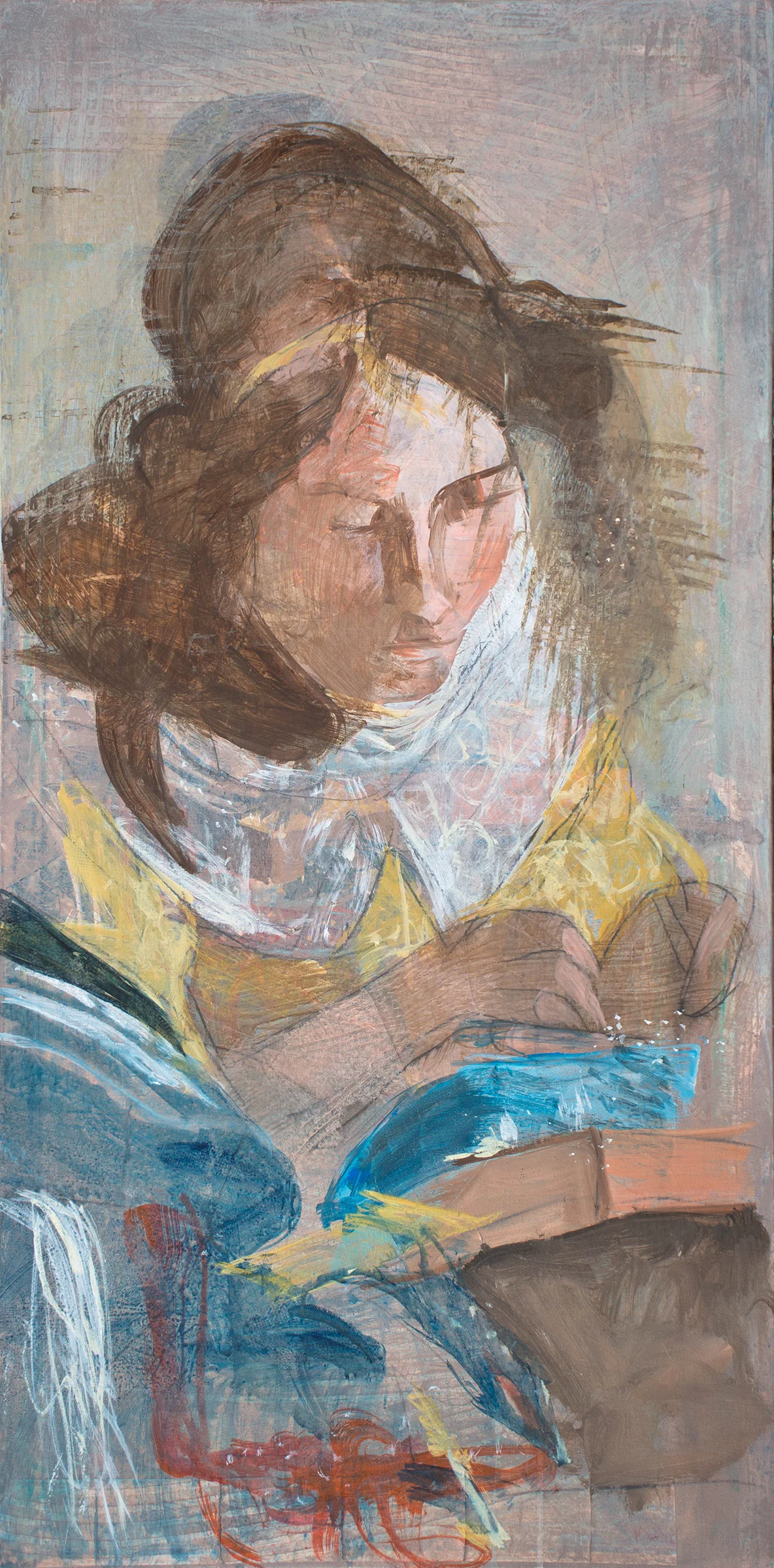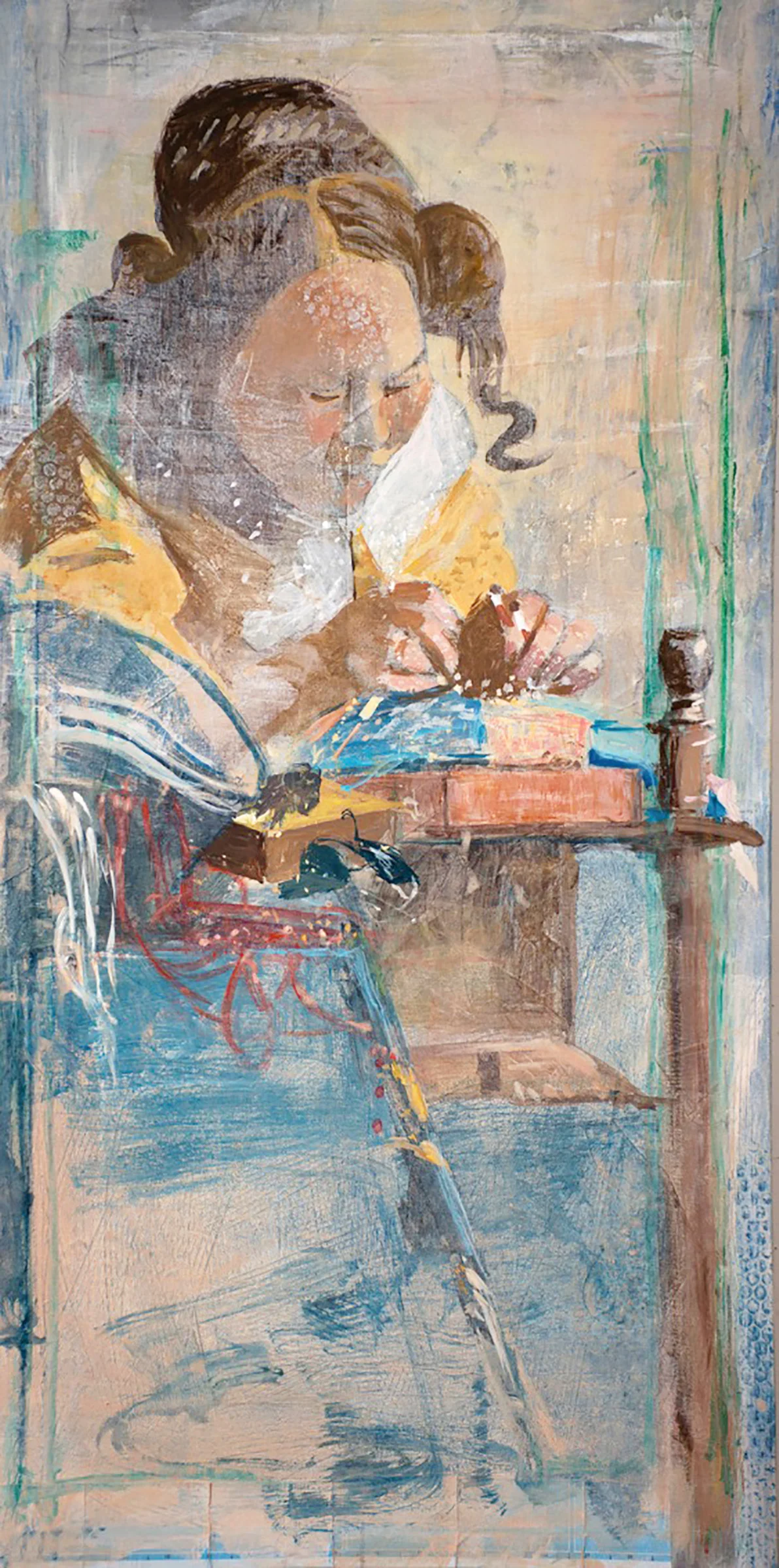 i brought gaze 1 over to the house, where we'll live with it for a few days and i'll decide whether or not it needs more work. so today i'm going to focus on another early gaze painting, gaze 2, which you see on the left, which needs work. it too is inspired by vermeer's the lacemaker.