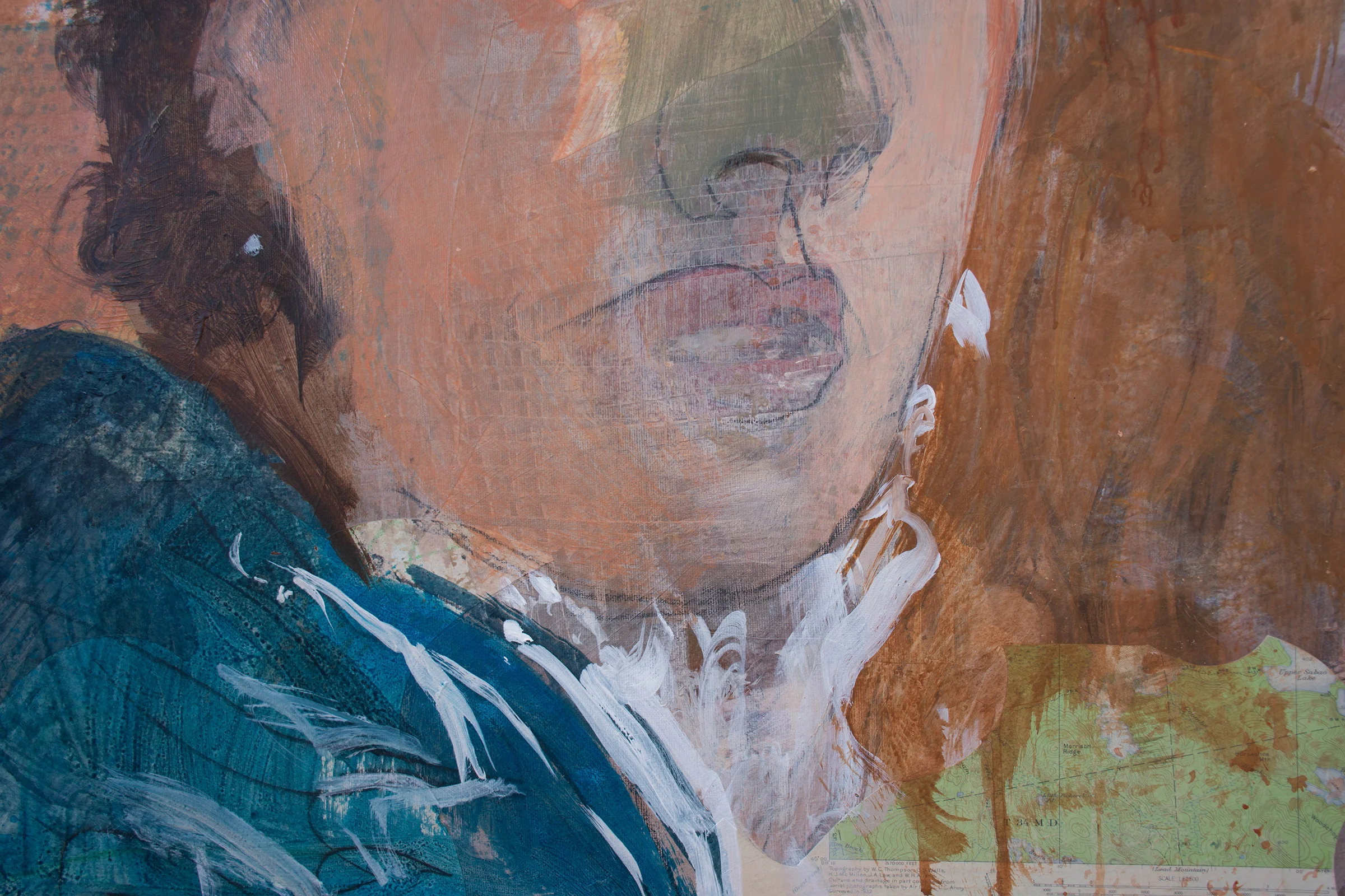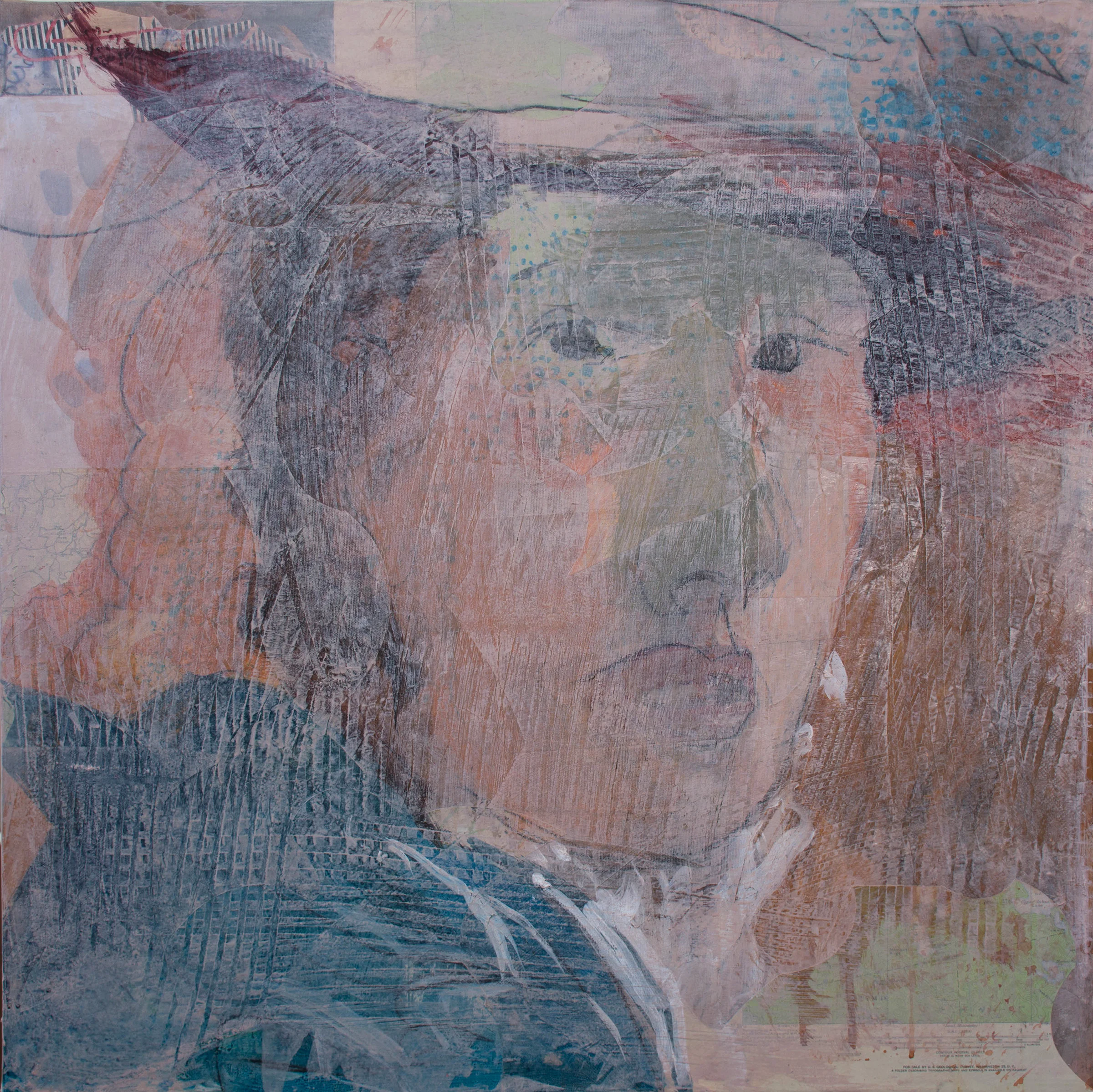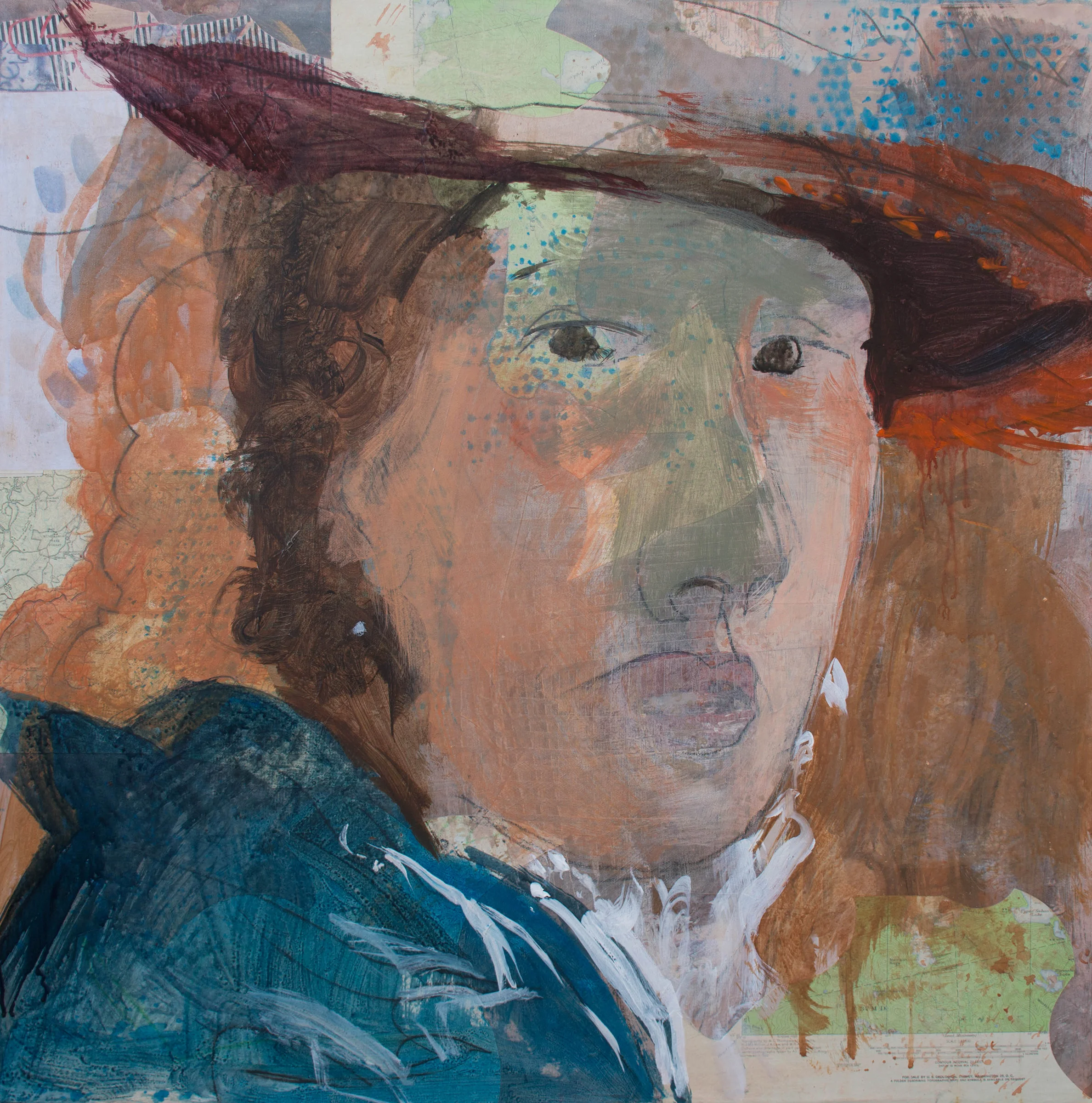 1:05 PM: this morning i painted into the collaging & scrumbles i did yesterday, giving the face a lot more definition, which will eventually give way to more subtlety & mystery. the mystery's the thing. a tantalizingly placed bit of green maine map emerges on the lower right & above her hat.