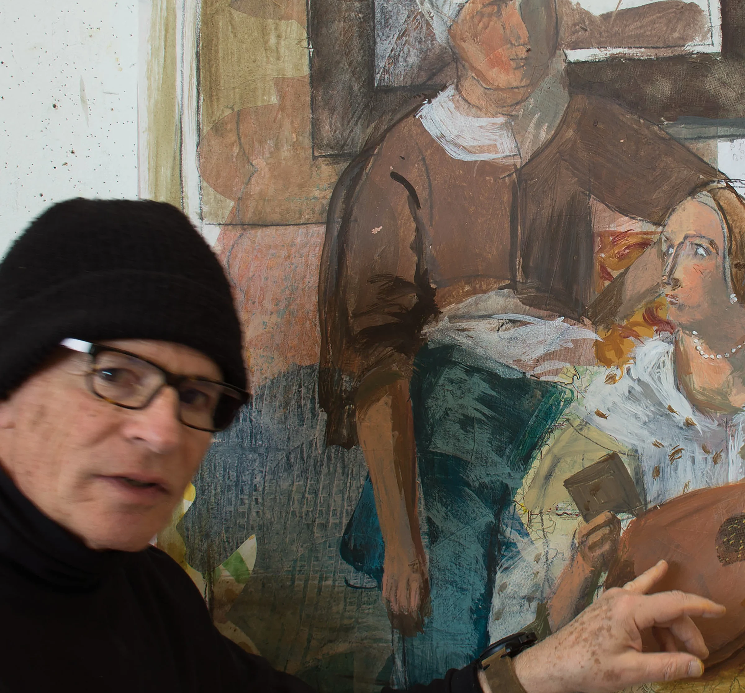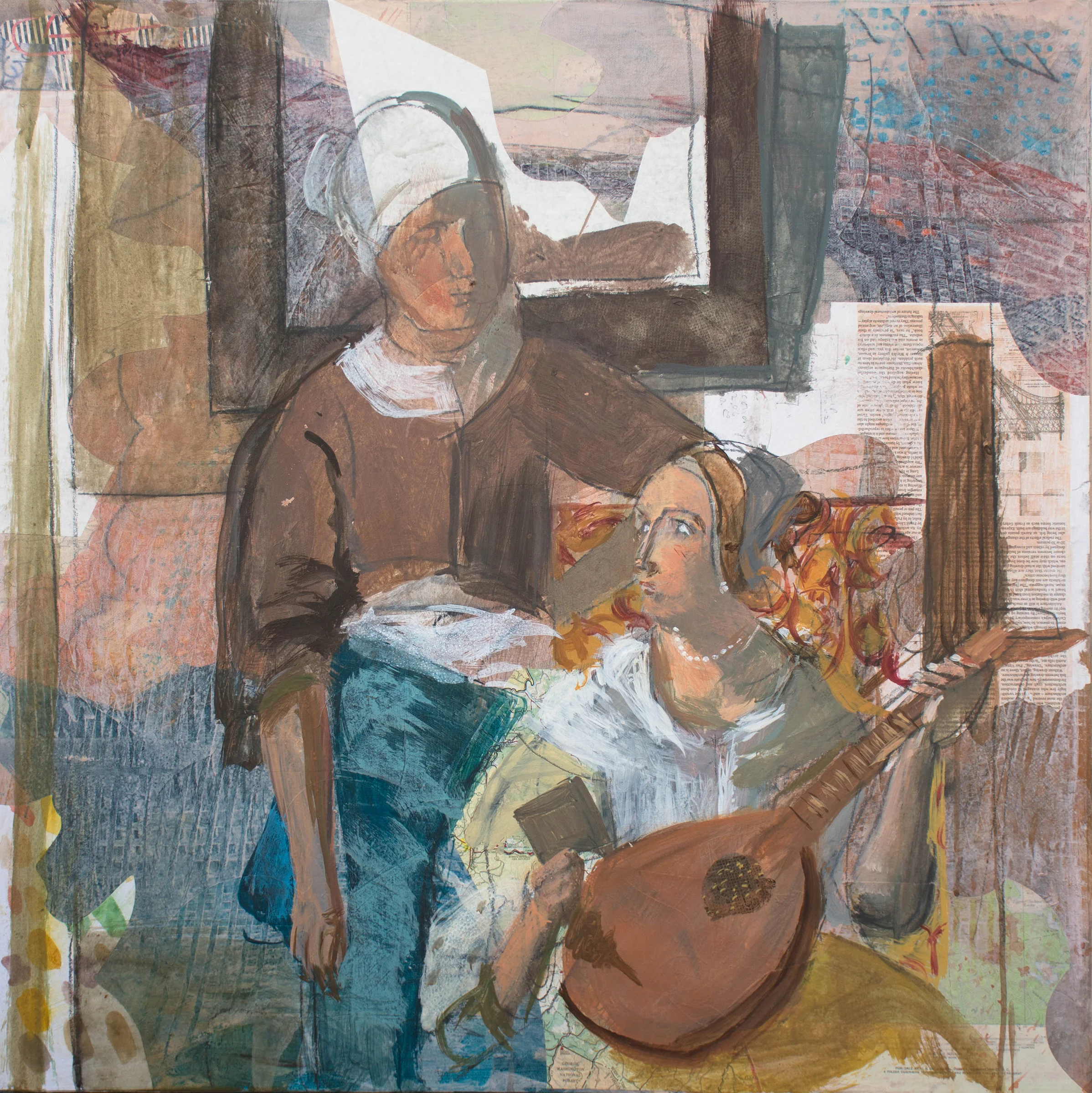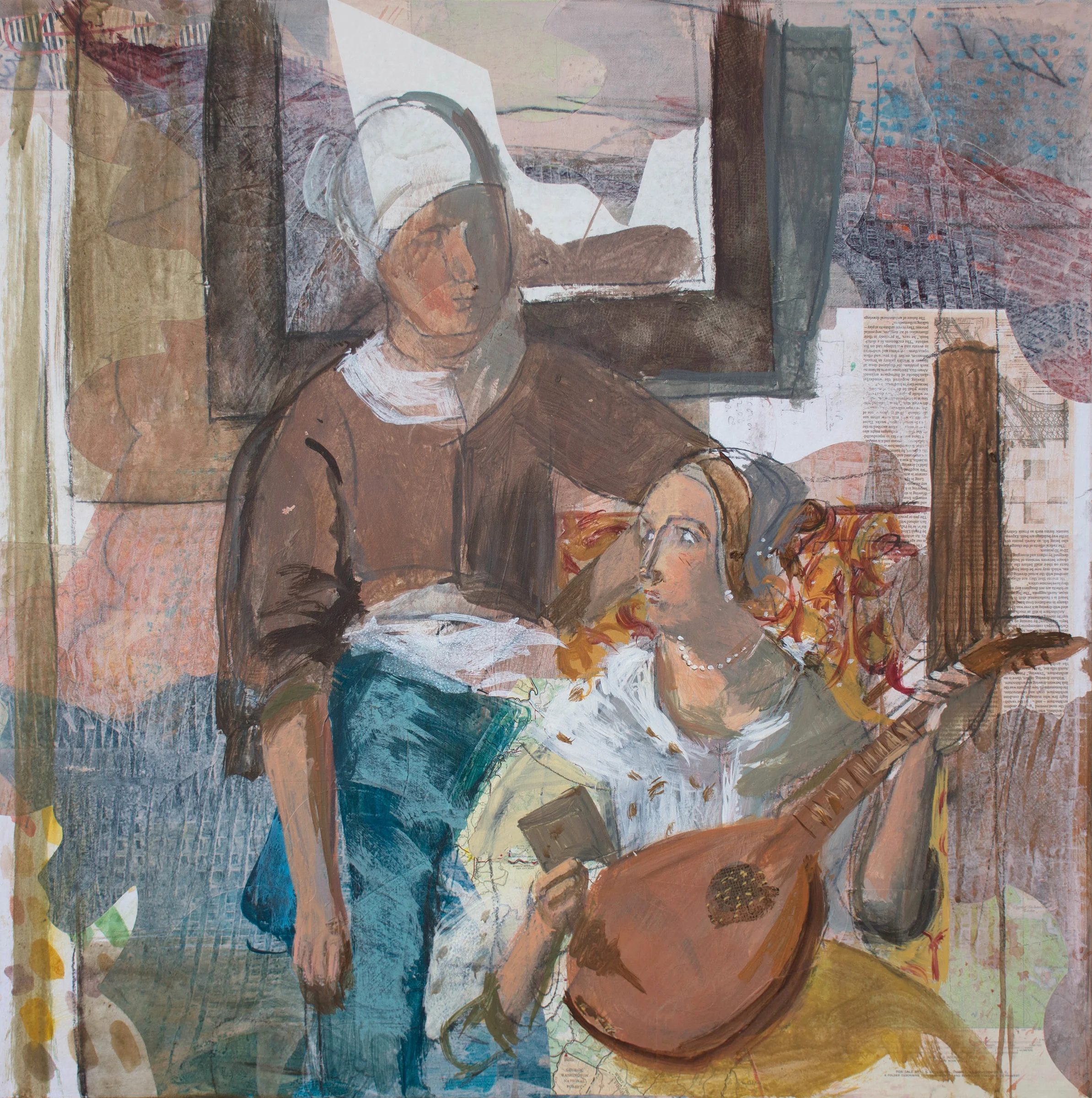 2:24 PM: there's something keeping me from doing my usual radical re-work of this painting. so all i did was some work on the hands & arms, the lute & the maid's apron. the dabs of color from a collaged sheet of paper on which i had been testing my watercolors was bothering me. it popped too much. so that's been pushed back. but most of the major elements and the shapes created by previous collaged areas are intact. they create a counterpoint to vermeer's own carefully weighed and balanced shapes.