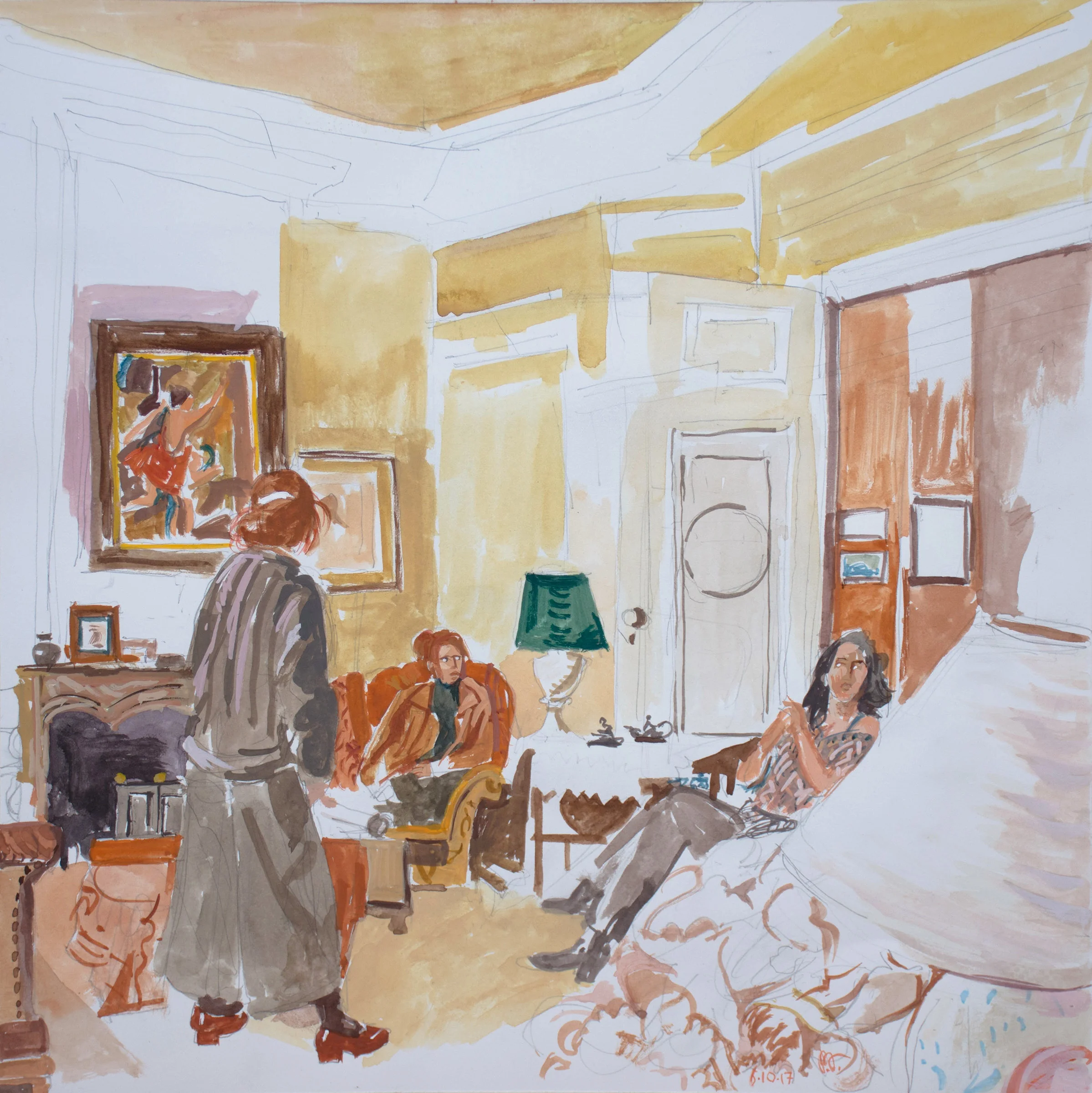 1:14 PM: after a few final tweaks, i just now completed gouache interior 4. mikela rightly pointed out that it was leaning a bit to far towards the beiges, so i introduced a few subtle but critical blues that made all the difference. so now, she sings! as time goes on, my marks become more economical, so that what might seem to the onlooker to be very minor adjustments can critically shift the energy of the whole.