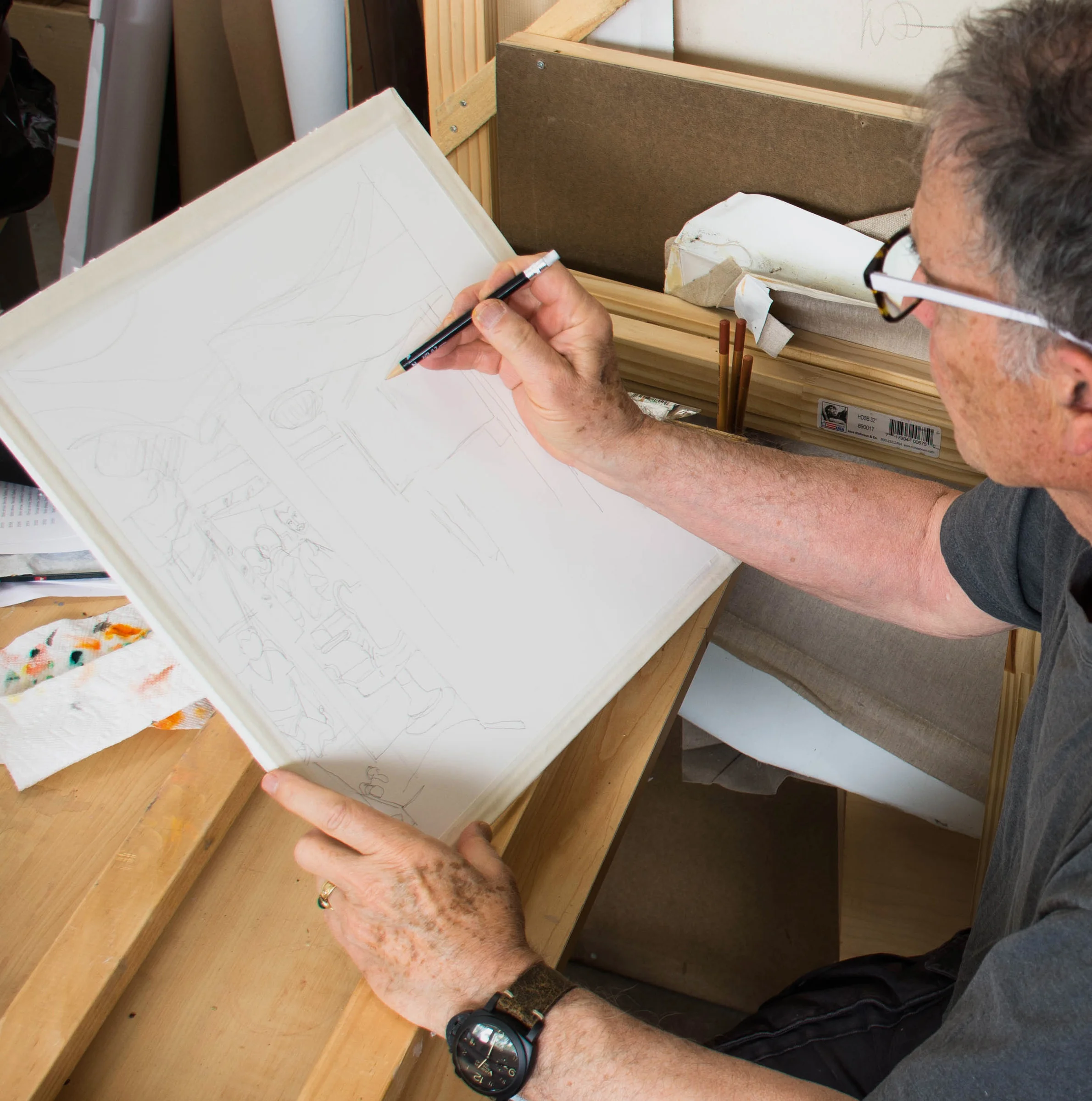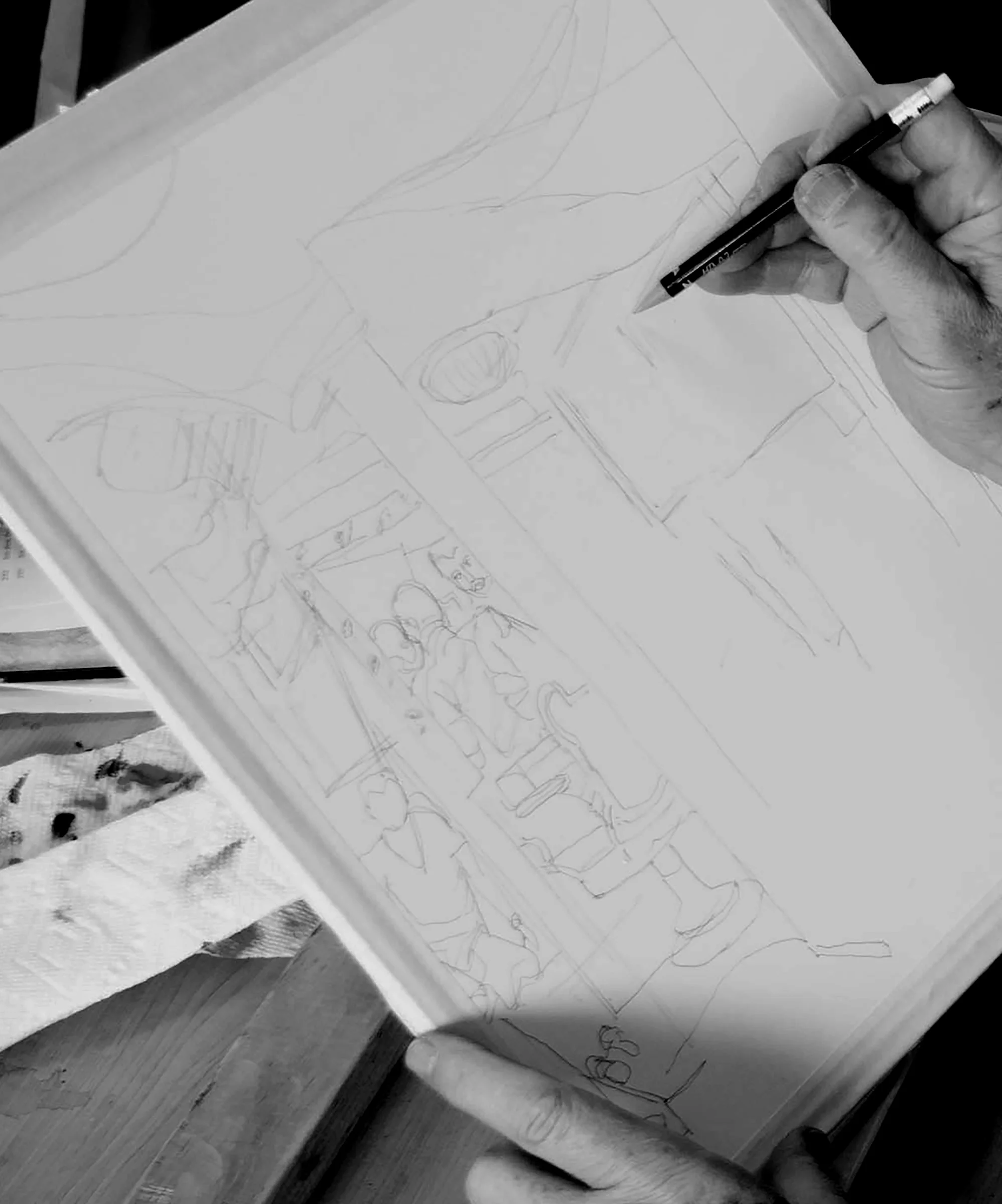 12:11 PM: i'm at work on the drawing for the next gouache interior 5. this one is inspired by a photo collage i shot in rajistan, india in the '90's. it's a colorful half indoor half outdoor barber shop.