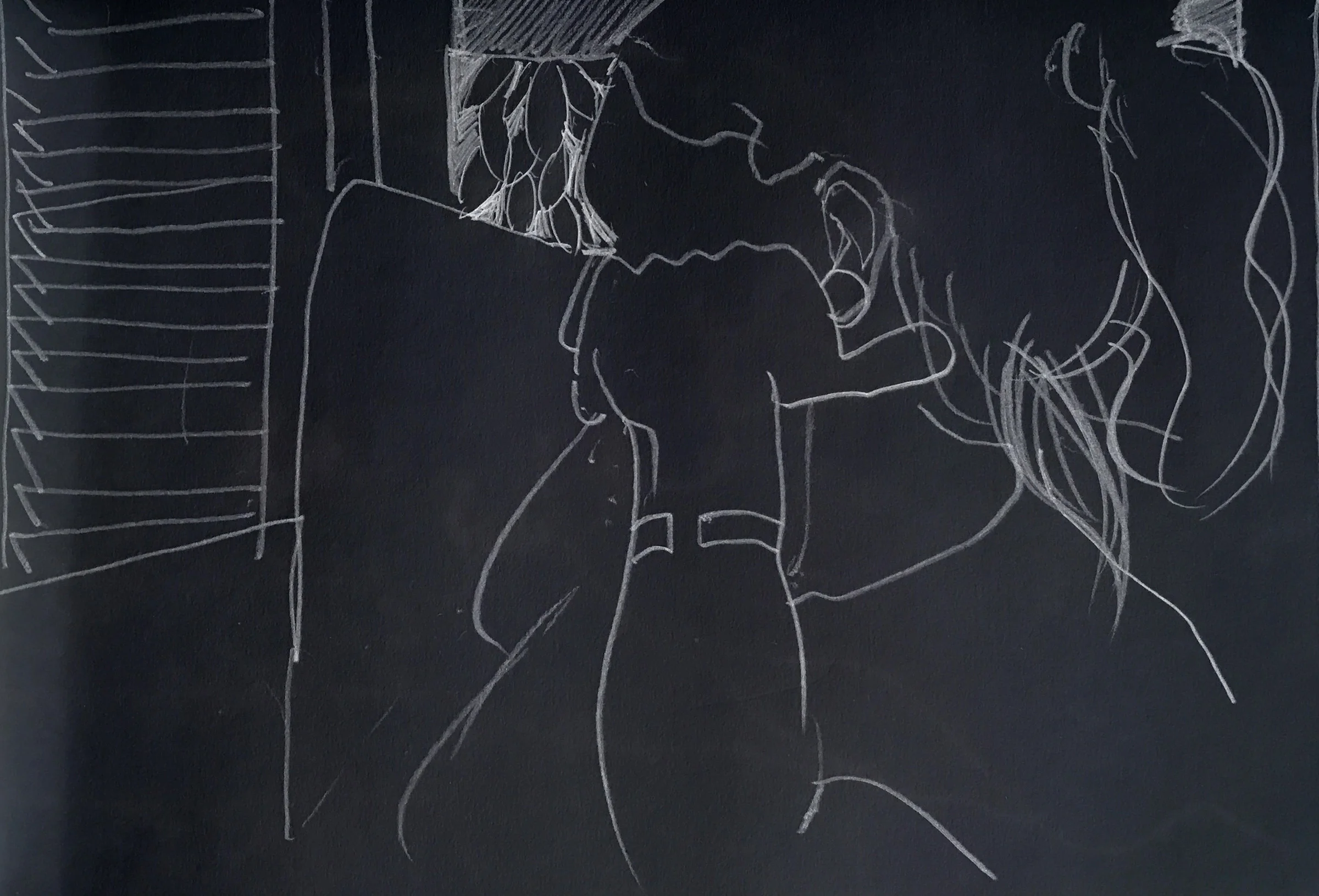 11:39 AM: i had the Blue Light treatment on my face yesterday, so my face is red, swollen & painful. just found this 1988 drawing of mikela in an old sketchbook. as i was adjusting it, i accidently inverted it, and i think it looks kind of cool!