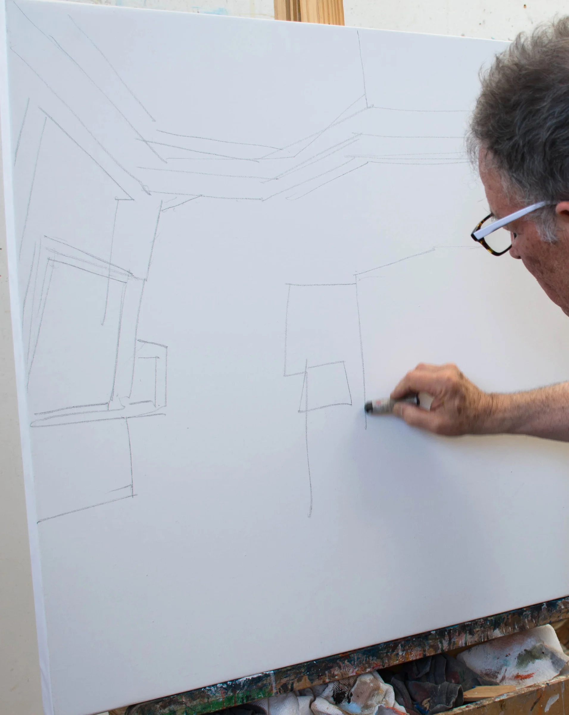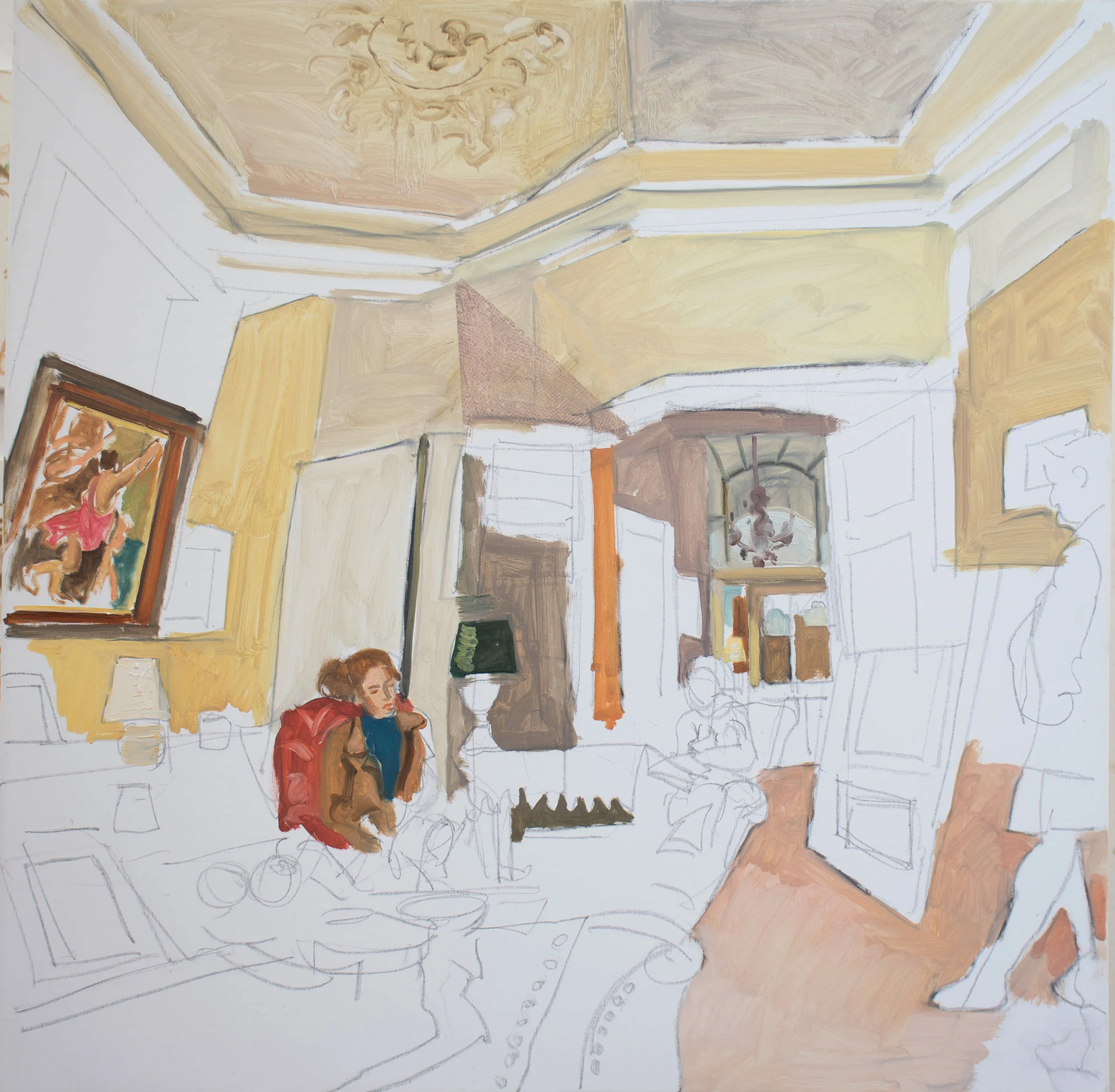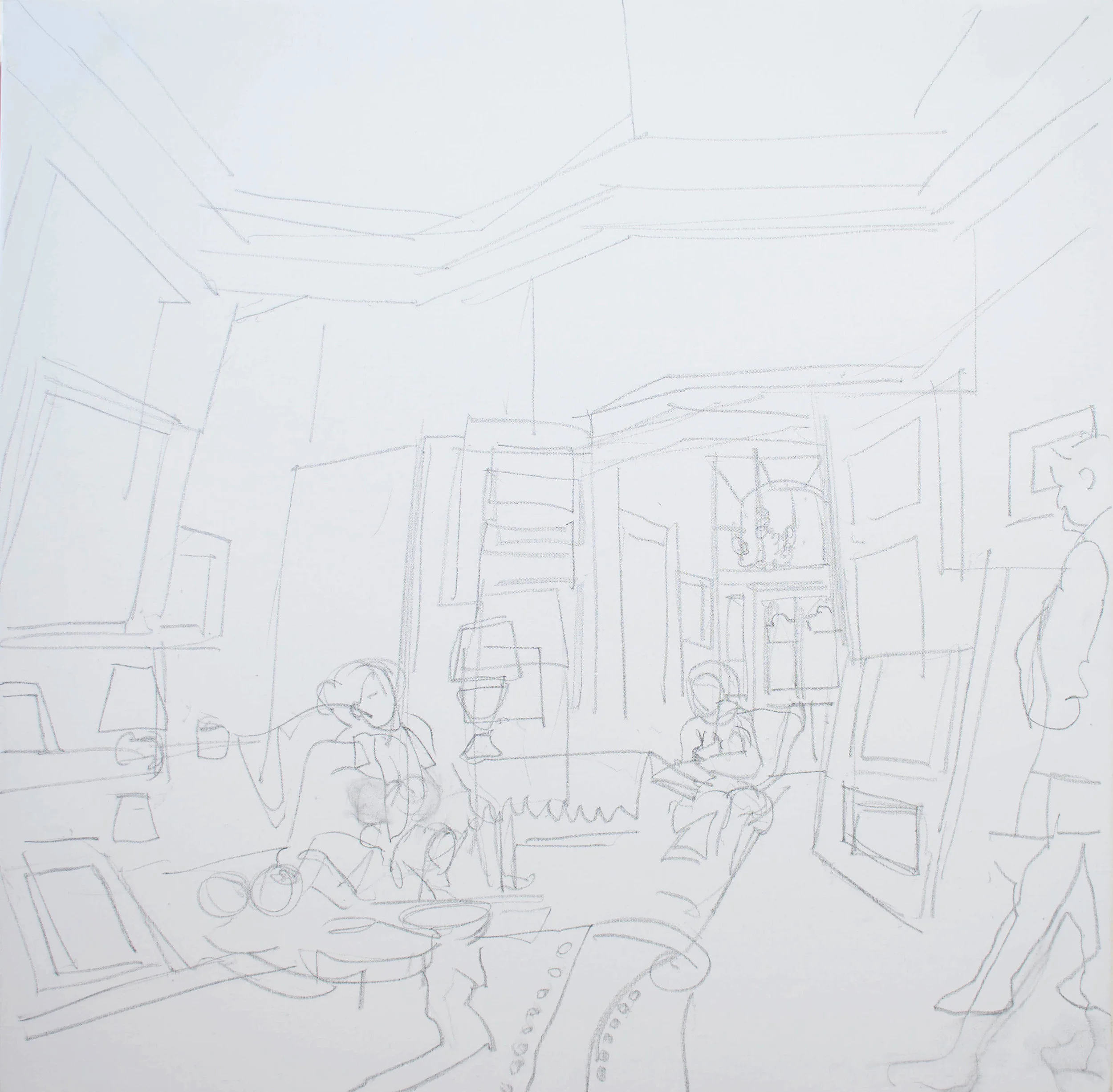 11 am: i just completed the drawing for oil interior 1, which will be in oil on linen, 32x32" it's a larger version of gouache interior 1. below are 3 stages of the drawing. i'm about to squeeze my paints onto the palette, and will post pics as available.