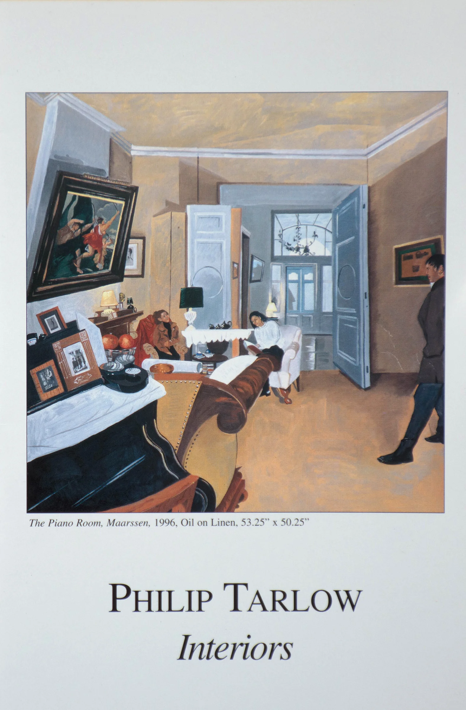 3:39 PM: here's where i'm stopping for the day. if you compare with the image from the gremillion invitation below, you'll see what i meant in my 1:48 pm comments. the brush strokes in the painting thus far are much looser and the composition more abstract; in the sense that the whole picture plane is seen as a play of shapes and colors. they are given specificity and meaning by the context: a living room with 3 figures interacting. but the painting is no longer about this subject matter. rather, it's in a kind of dance. working straight onto the white primed portrait linen is making a huge difference. it's as if all those years of painting in oil on a tinted ground were foreplay, and now i'm having real sex.