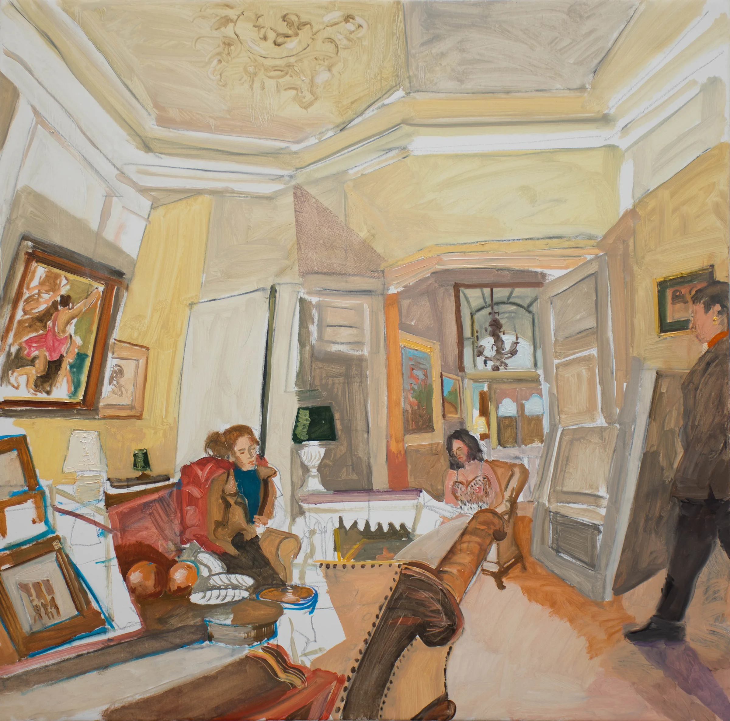 this morning i did quite a bit of work on the figure on the right, which was too large & dominant, as well as painting into many of the remaining white spaces where blank canvas was showing through. portrait linen works best with a light touch, so there's practically no buildup of paint to be seen. it's a very musical composition, with many diagonals guiding the viewers eye back & forth across the composition, with a richness & warmth of color characteristic, i believe, of much of my work over the years.