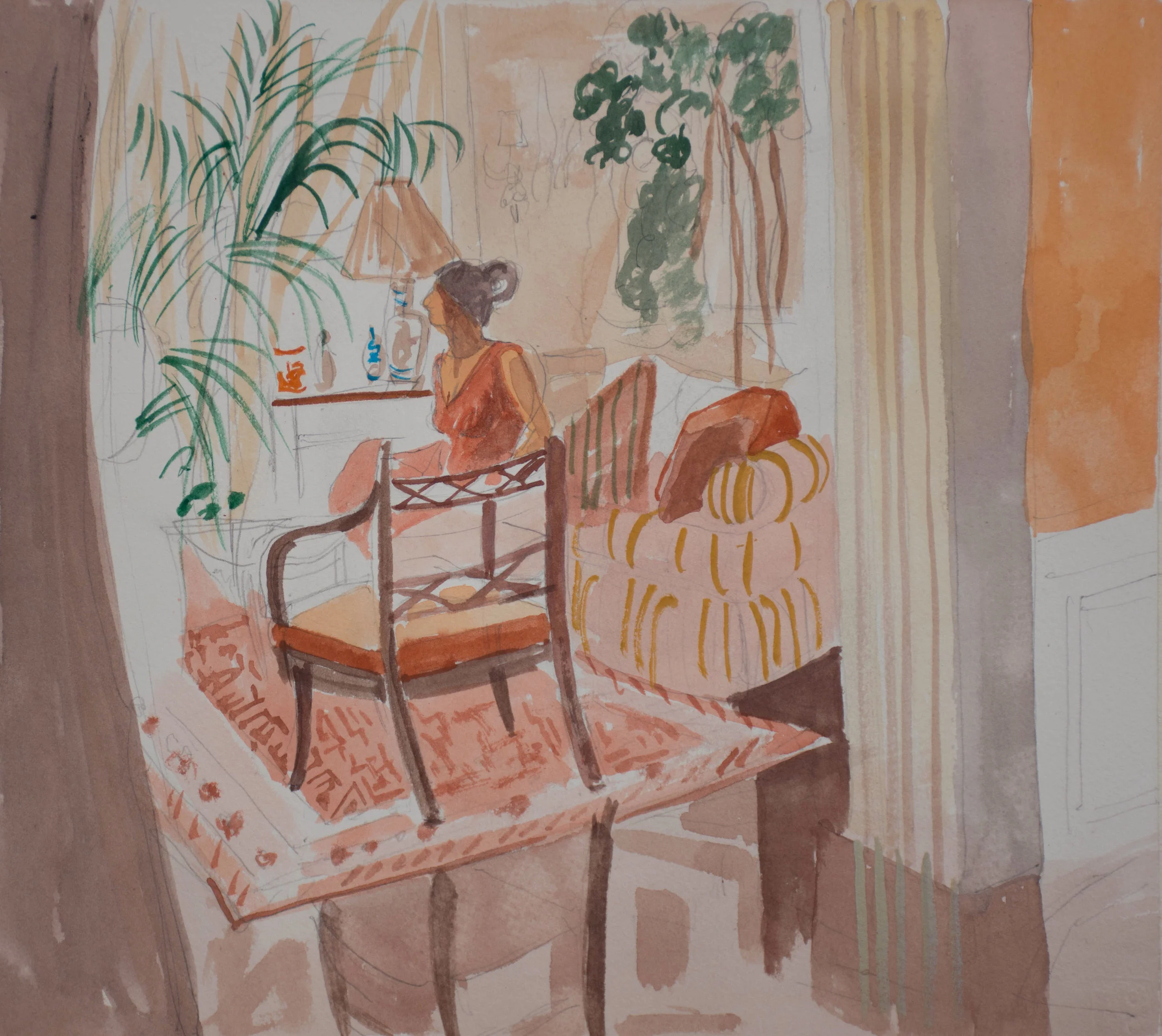 1:11 PM: once it became clear that oil interior 1 was a bad start and couldn't be salvaged, i'm moving on to a new theme, starting by making a gouache study. i'm taking it slow, and because i've been up since 3:30, am stopping here for the day. this gouache study won't necessarily become a larger oil. i'll make several, and go with the one that sings.