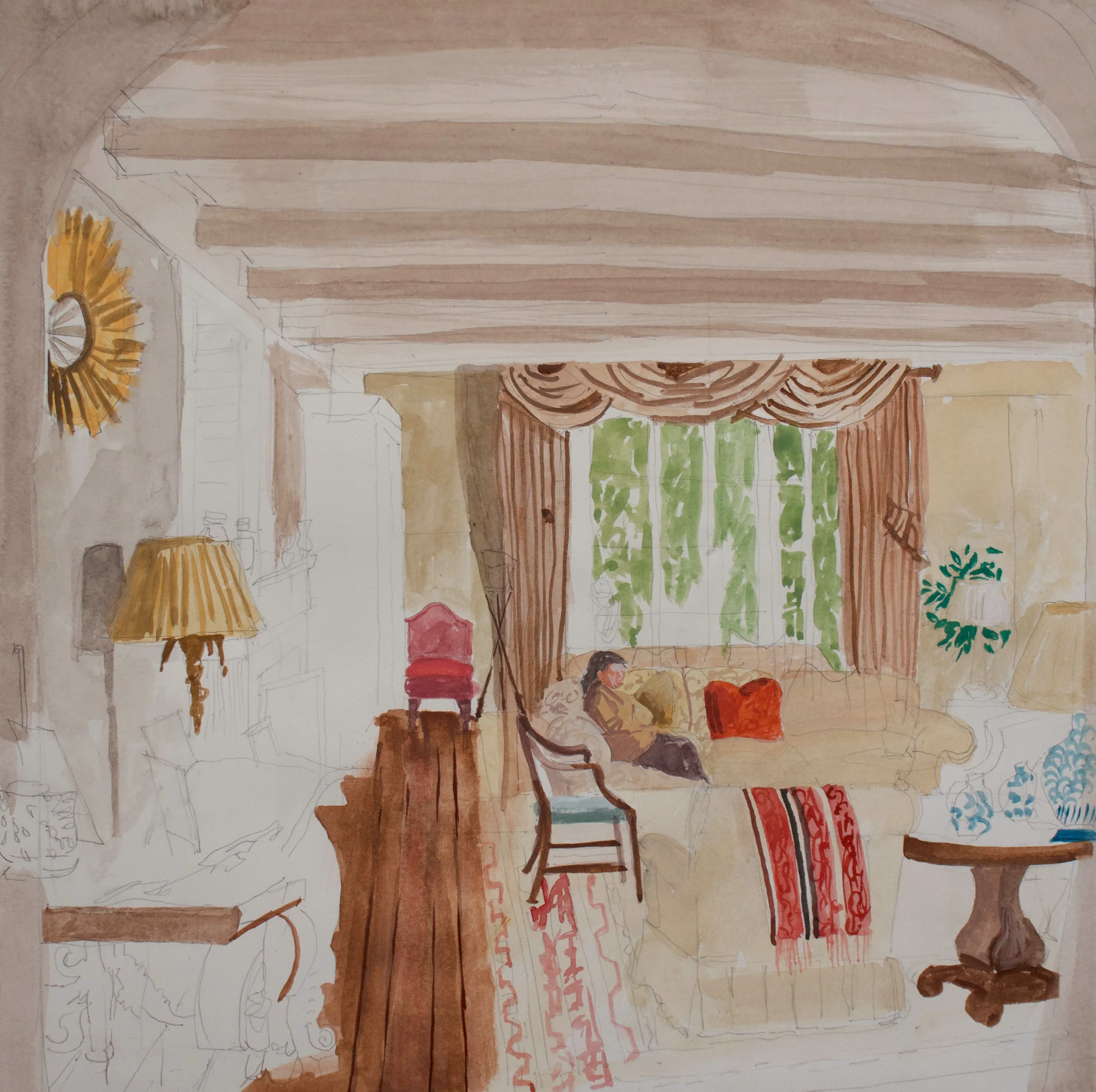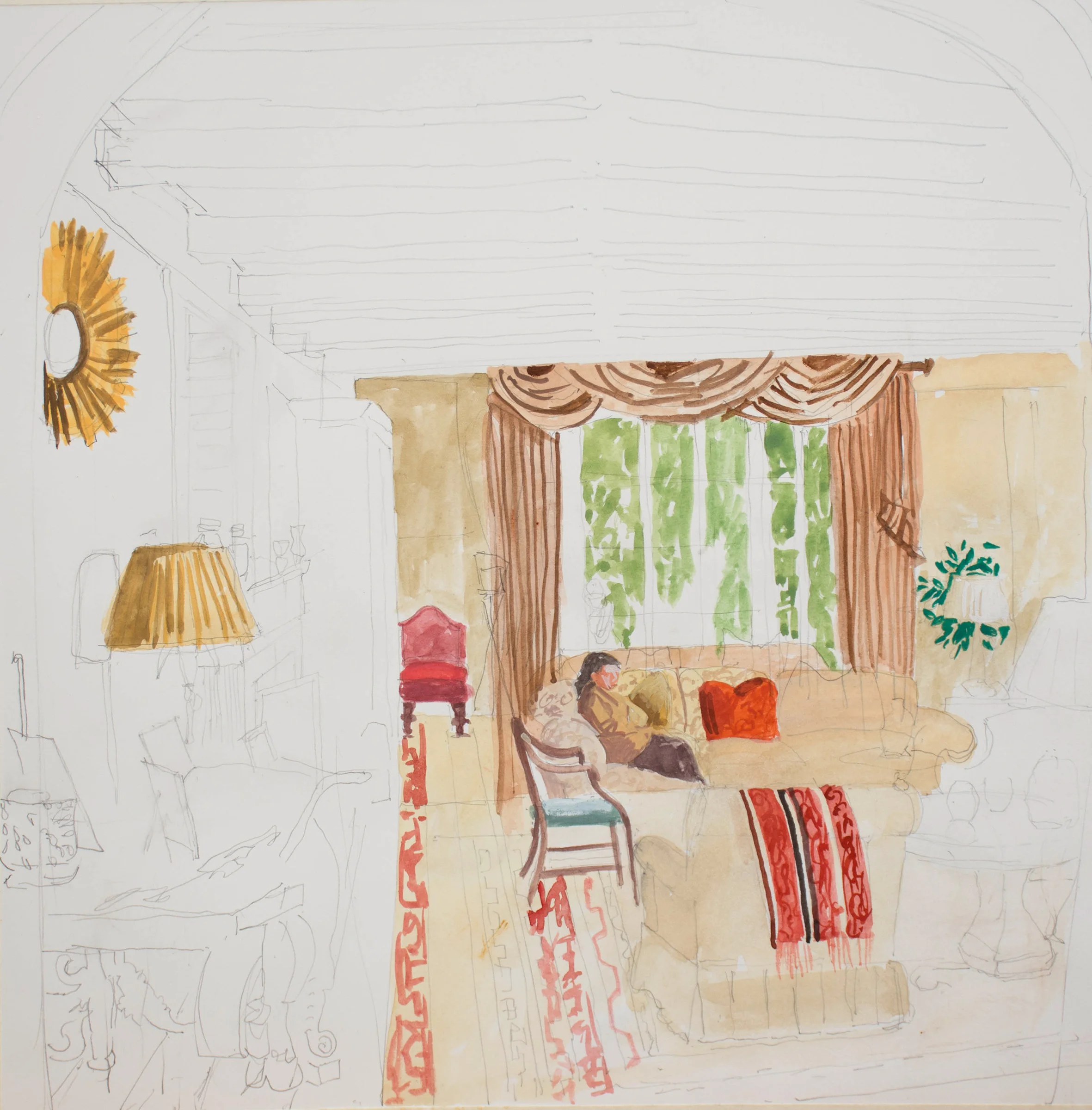 the wood floor seems rather dark in comparison with the rest of the composition, but that will balance out tomorrow, once some other darks are added on the left beneath & to the right of the lamp. completion of the rug on the very lower portion, beneath the couch with the throw, will also balance out the tones.