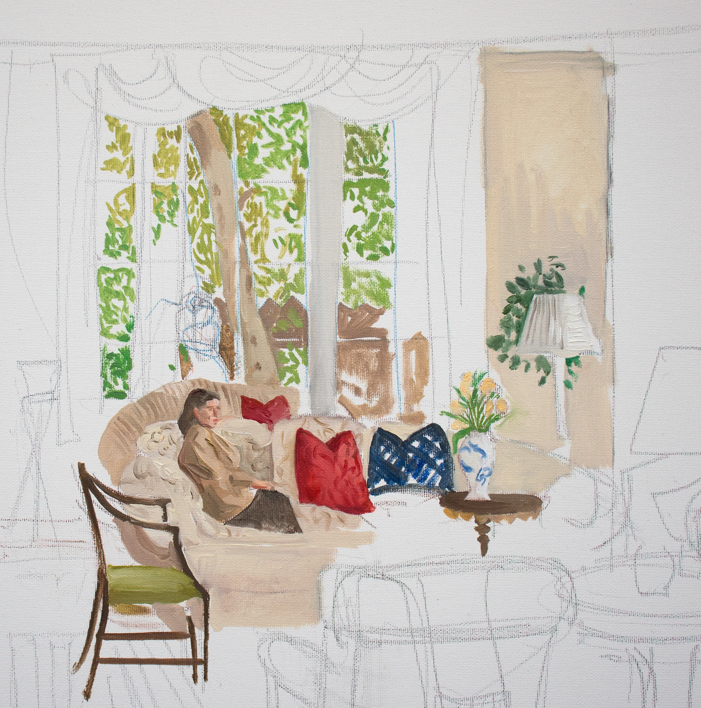 2:46 PM: as i said yesterday, using this high quality cotton canvas for this genre of painting was a gamble. i originally purchased it to use for my gaze series acrylic & collage paintings, reserving the far more expensive portrait linen for more delicate work, along the lines of the oil interiors. how would it be to work on this cotton surface? i started applying color before even finishing the drawing, so anxious was i to find out!