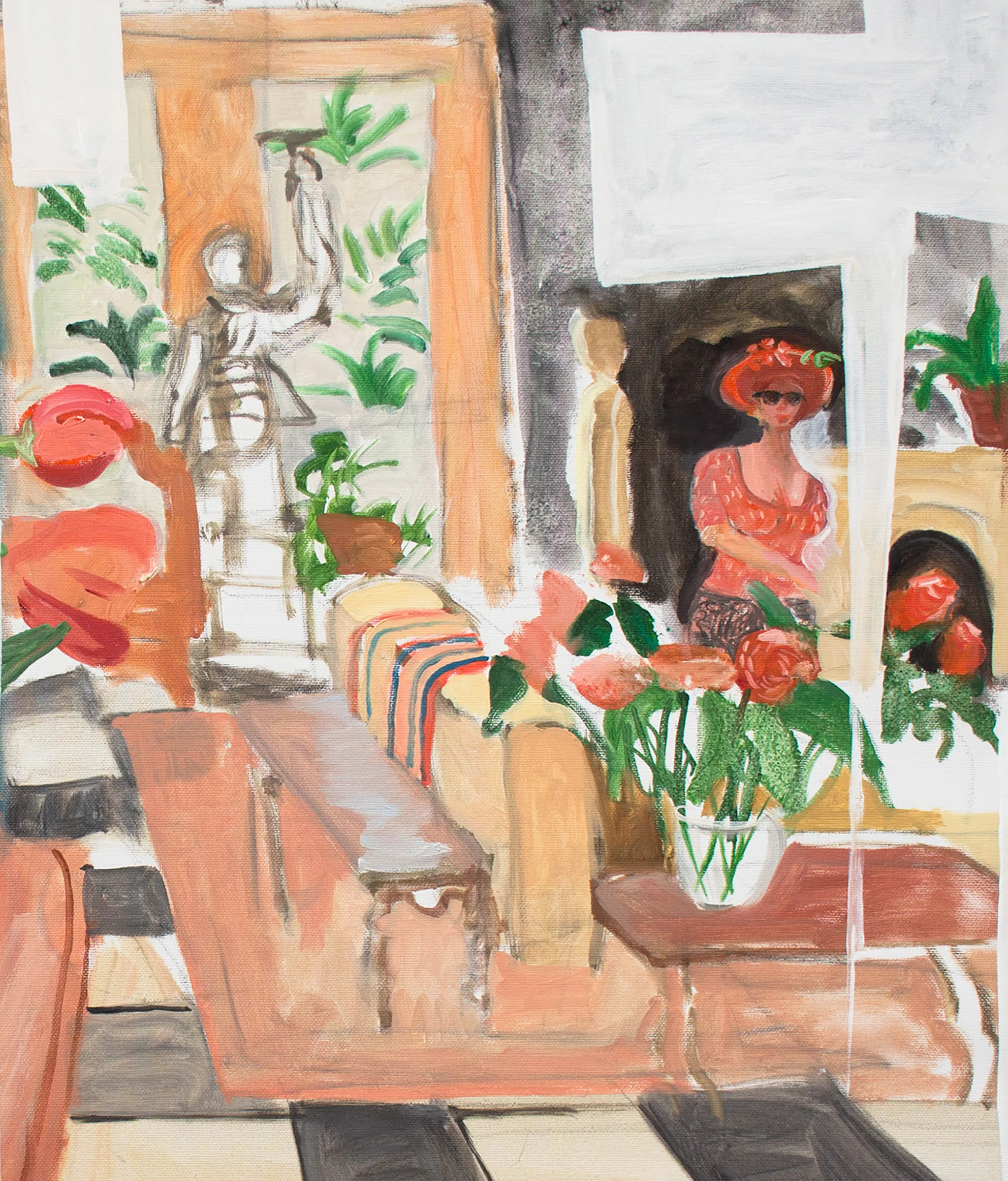 2:01 PM: we walked up the trail this morning, so i'm stopping early 'cause i hit my limit. about an hour into it, something felt off with oil interior 3. as i looked at the photo collage i'm using for this painting, i noticed the breaks in the image as a result of the collaging together of many individual photographs. i noticed that the resulting breaks in the entire image seemed completely natural to me. they didn't register as mistakes or flaws. on the contrary, they enlivened th image!