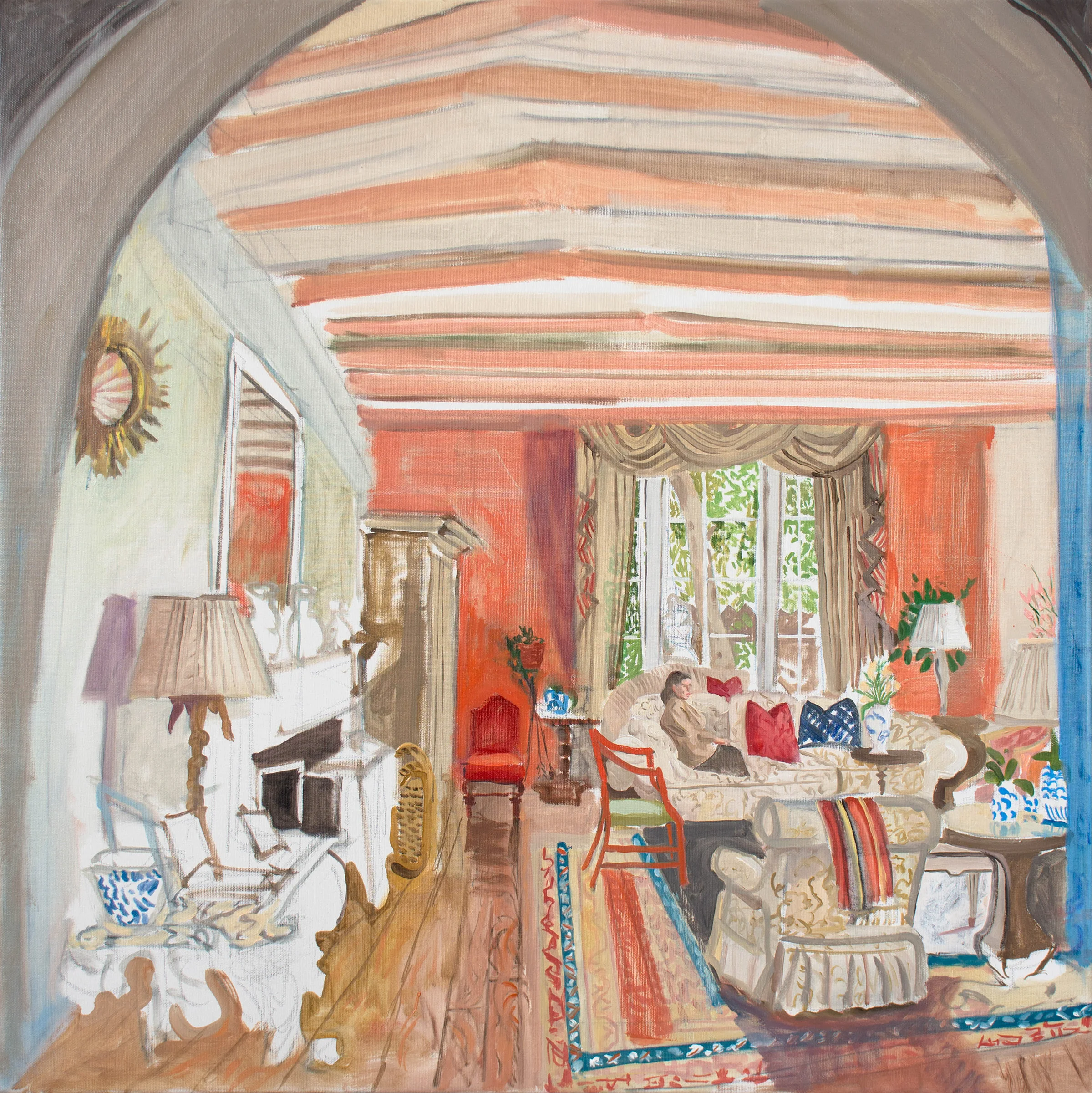 10:39 AM: first thing that struck me when i entered my studio and cast my all important first glance: the dark grey semi circular archway bits on the upper left & right grab way too much attention, right off the bat. next, i examined the sketchy bits on the lower left and liked them a lot. the rest of the composition seems a bit confusing. the blacks indicating the fireplace on the left, for example make a clear, unambiguous statement, whereas the blacks on the right, around the chair, are not sure what they want to be.