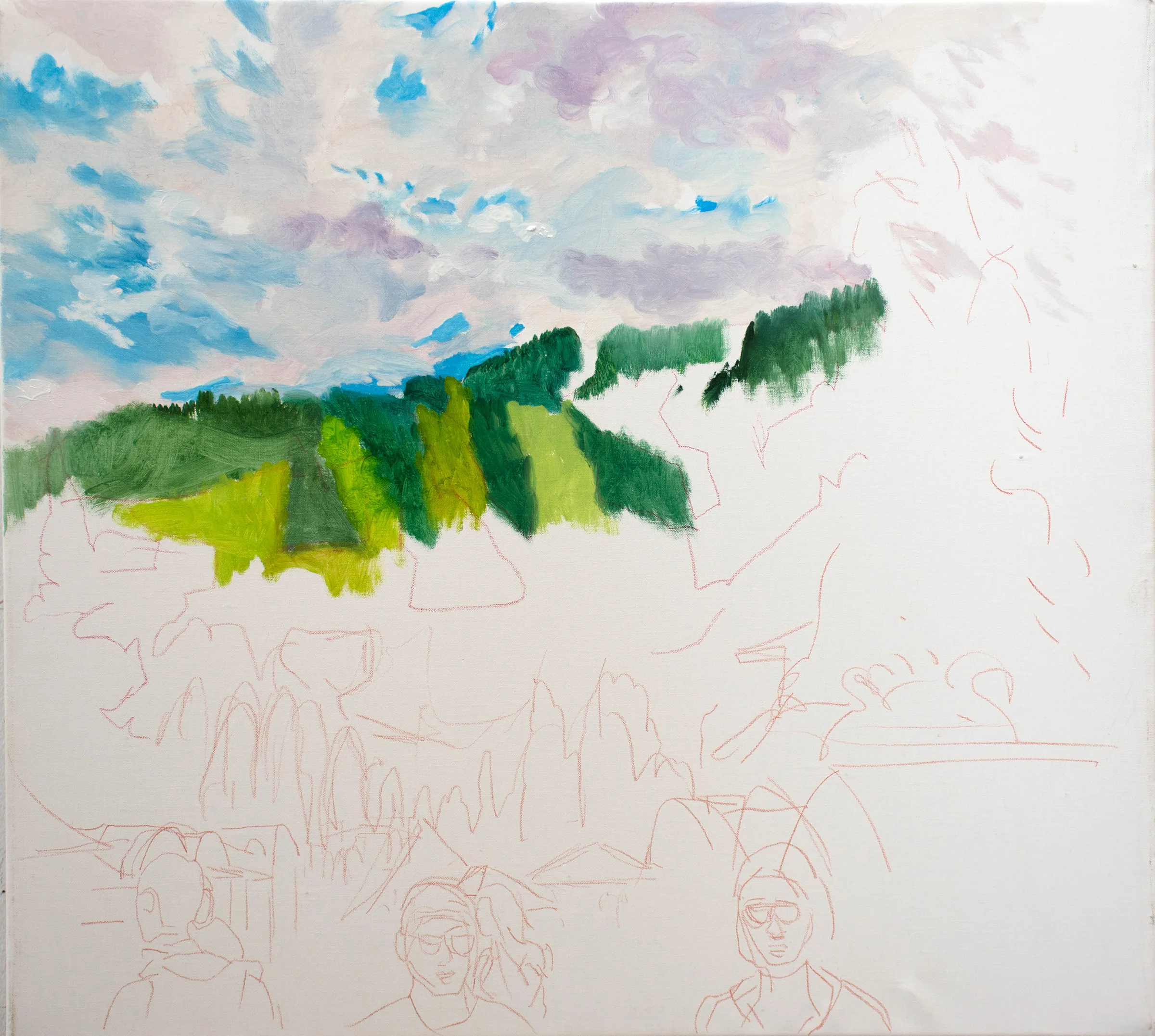 3:15 PM: this afternoon i unexpectedly began a small, 20x18" oil on portrait linen inspired by one of the photos i shot a few days ago at the aspen art fair. what grabbed me was the cool juxtaposition of the landscape in the background, with it's gorgeously patterned hills, and the art fair itself, with it's white tents and colorfully dressed attendees. i soon ran out of steam, since this is our first day back and we did a lot of driving yesterday. so i'll resume tomorrow morning.