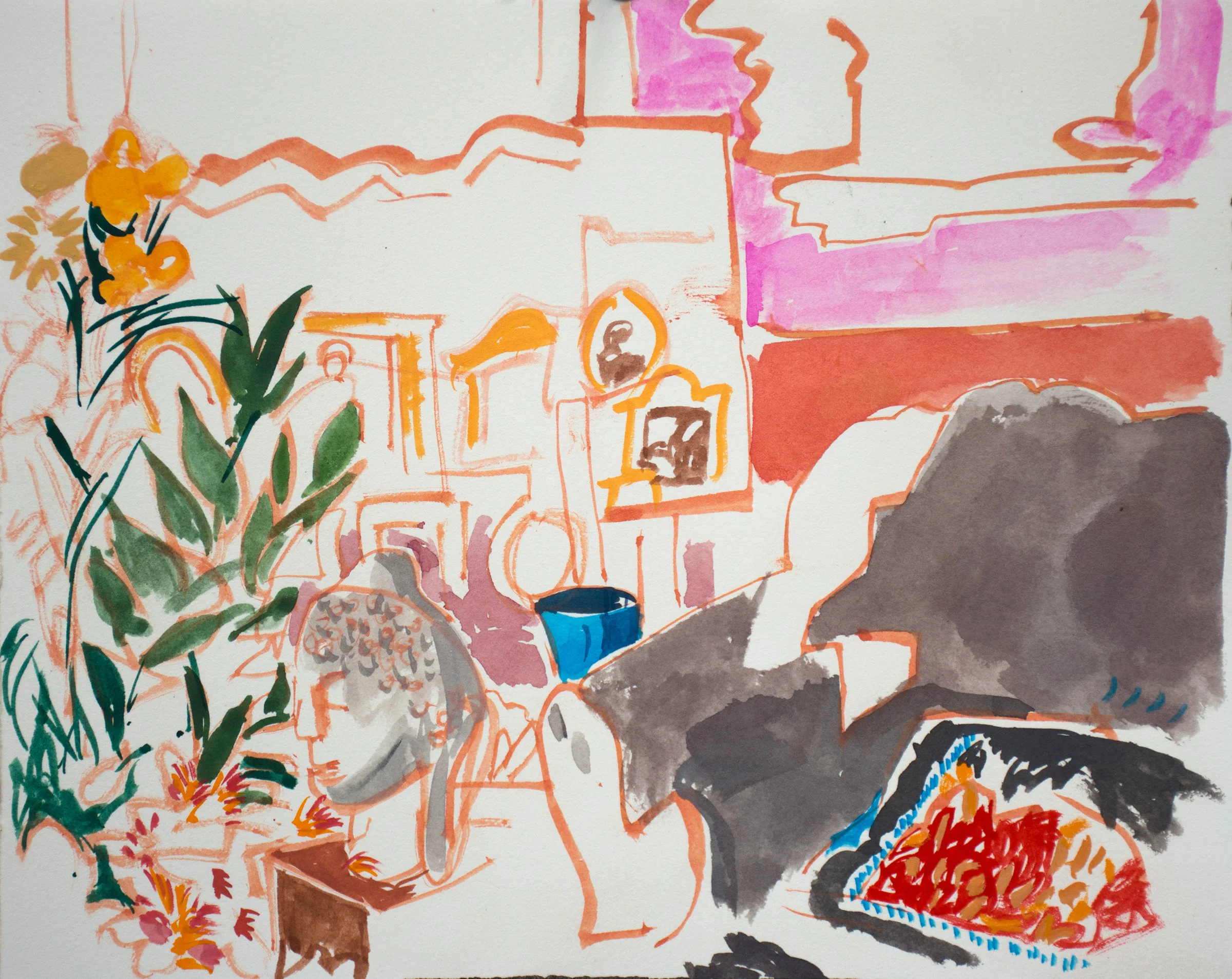 3:07 PM: today i started a small gouache as a study for oil interior 6. i'll complete it tomorrow, and perhaps make a second one to work out the composition which, in this one, is starting to look too busy. it will be more lively coloristically than the last few, and cropped more tightly than the earlier oil interiors. less descriptive, more patterned. i'm tempted to jump right into the already stretched 32x32' canvas tomorrow. but i know in my kishkes that i need to work out the color relationships, shapes and overall composition first.