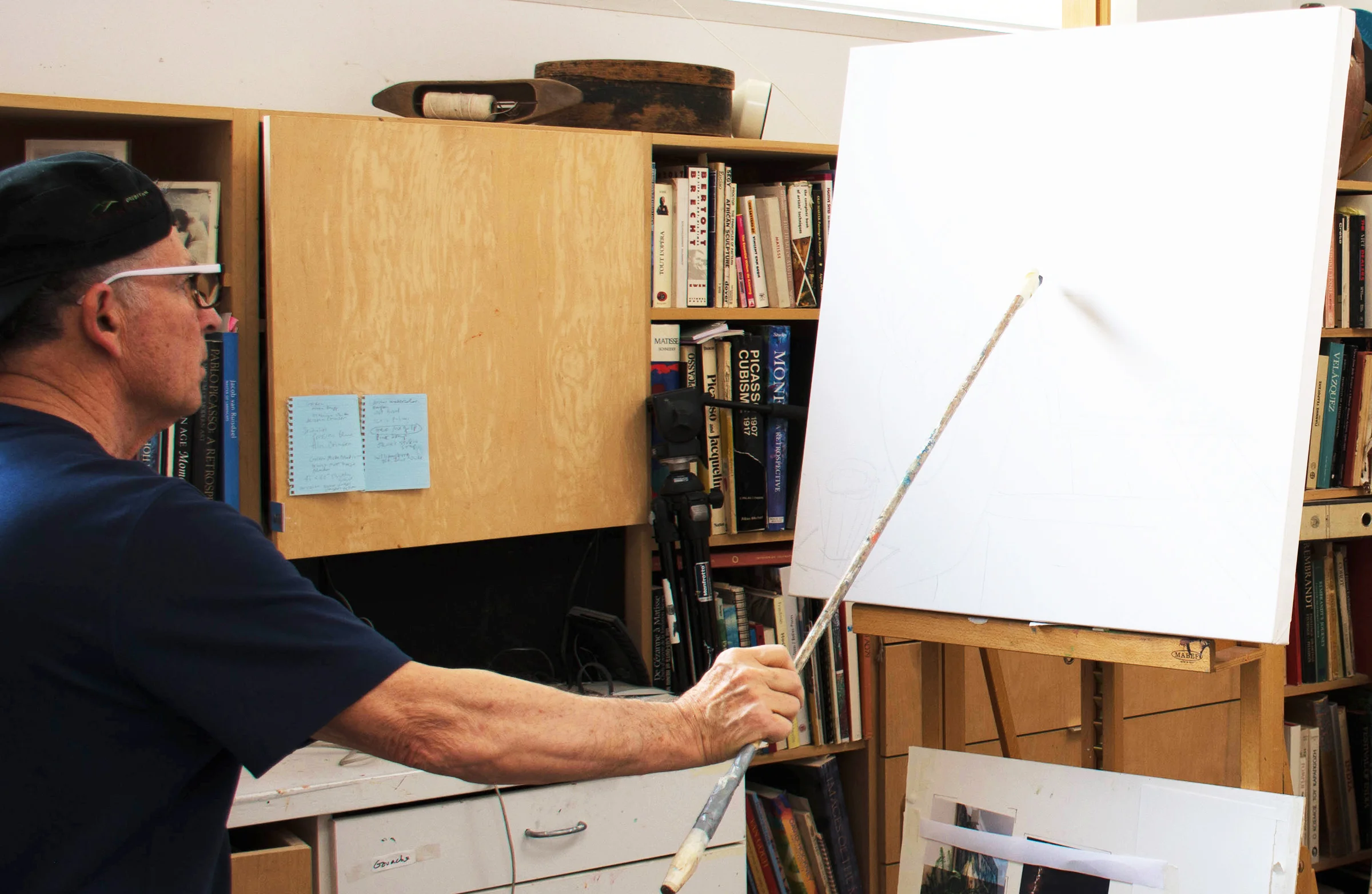 3:13 PM: i made the drawing for canvas 1 (of 2) for oil interior 3 & 4. i'm doing two as an experiment, to see if working on two in tandem allows more freedom and the ability to immediately transfer the discoveries & solutions i make in one to the second canvas. i attached my graphite crayon to a long pole to make the drawing; something i learned from matisse, who did it to let go of control and facility. so far i like it. it allows me to not get caught up in the details and literally get some distance.