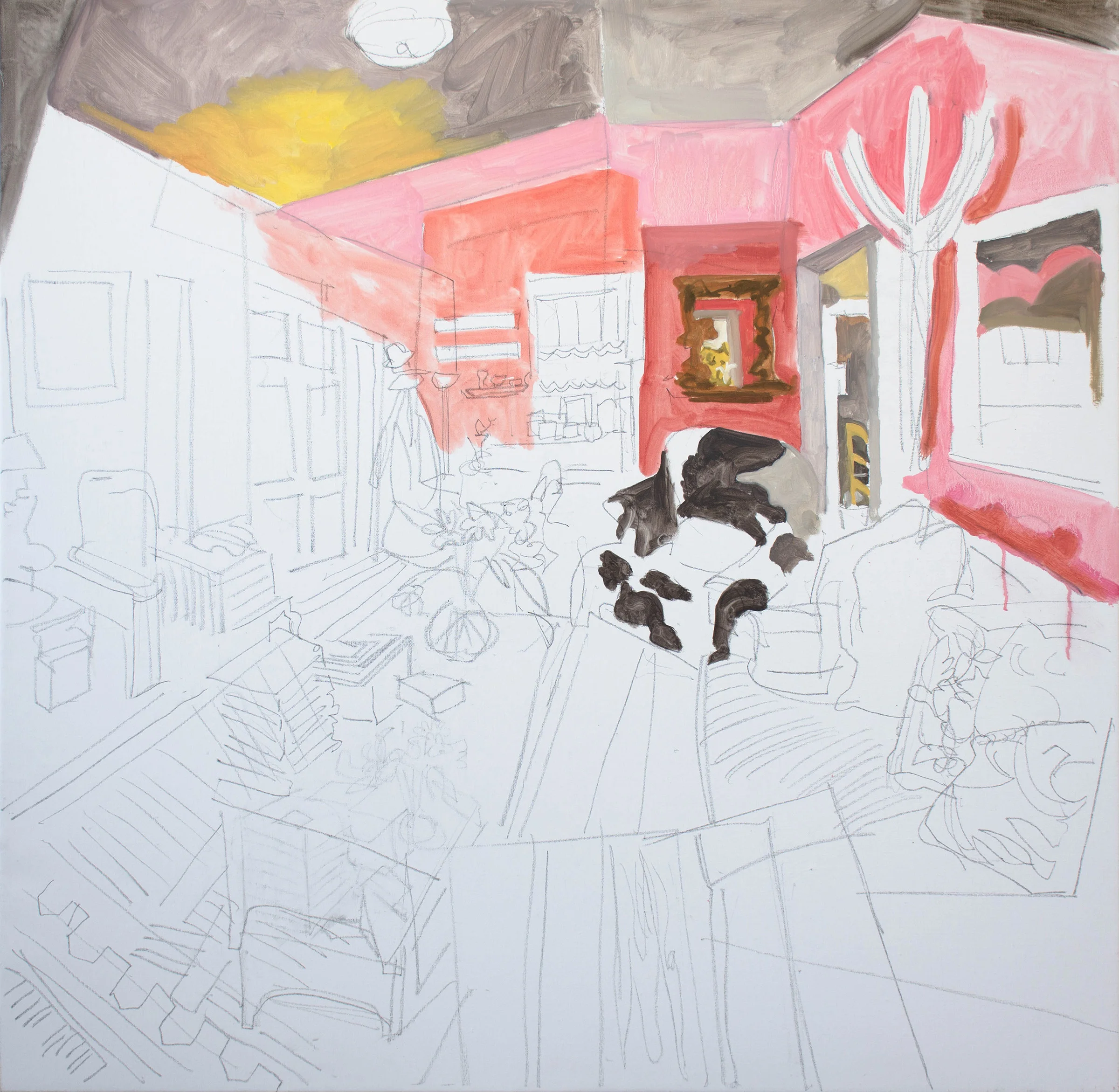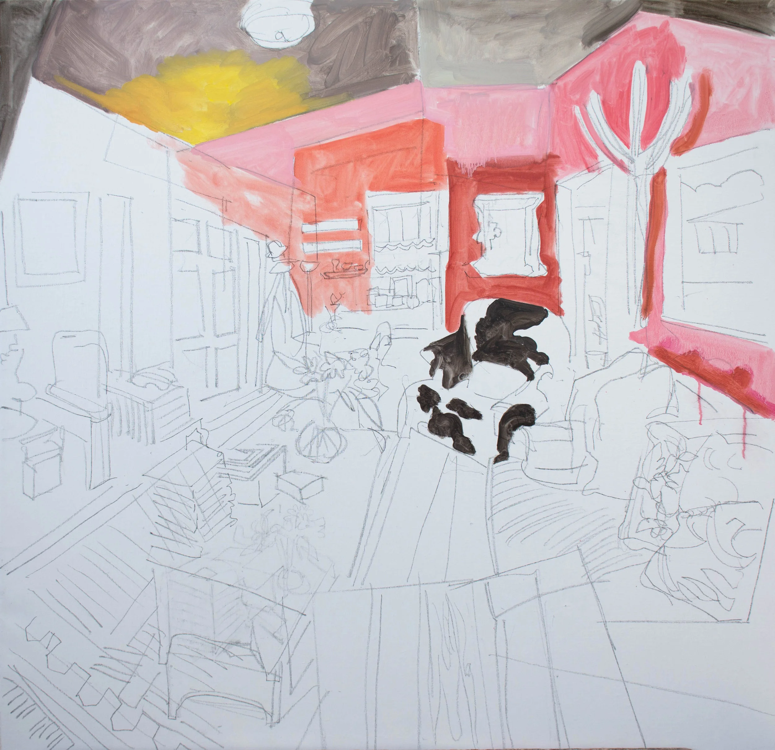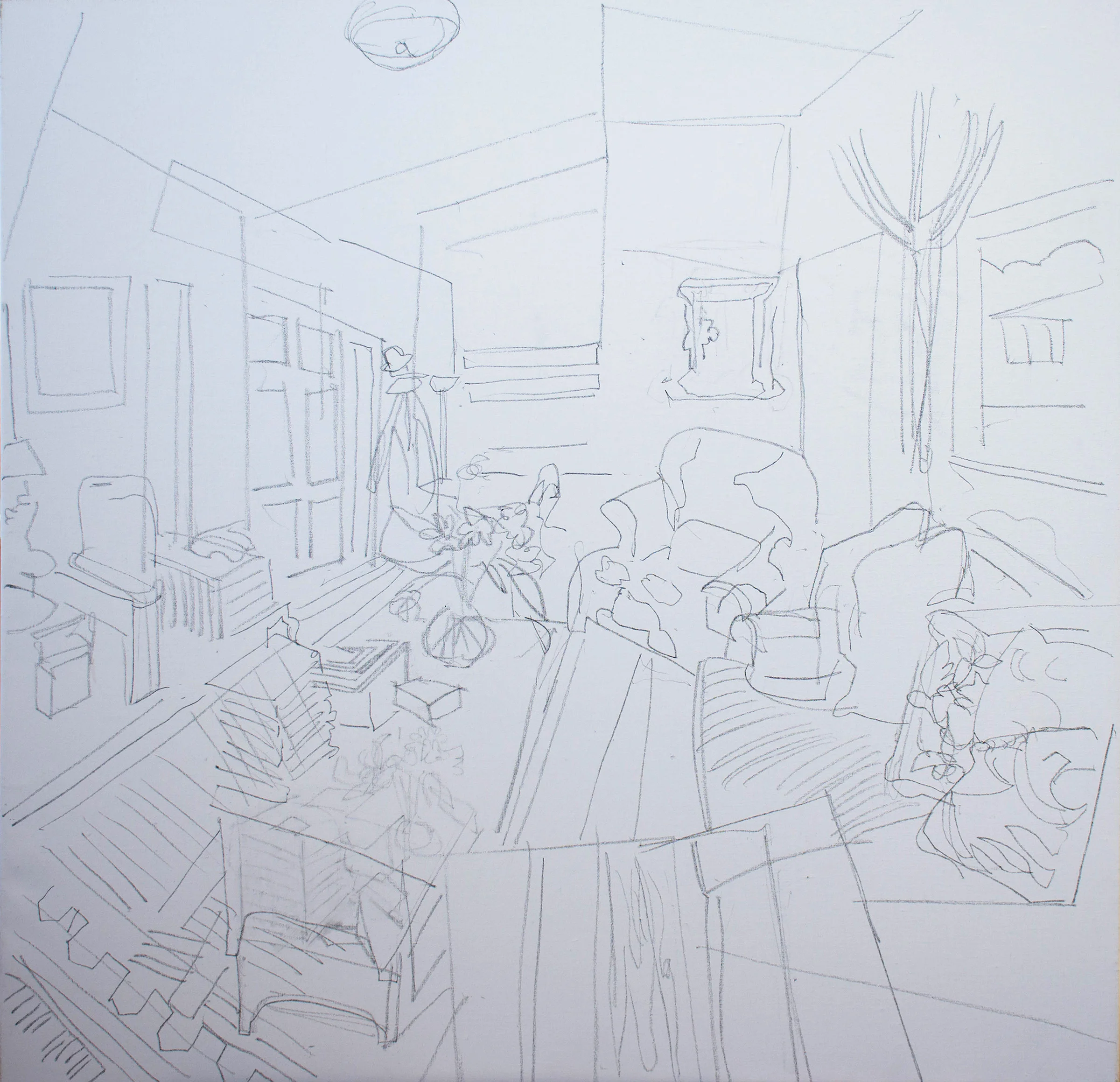 1:26 PM: i'm just completing the drawing for oil interior 6, 32x32" and will start painting shortly.