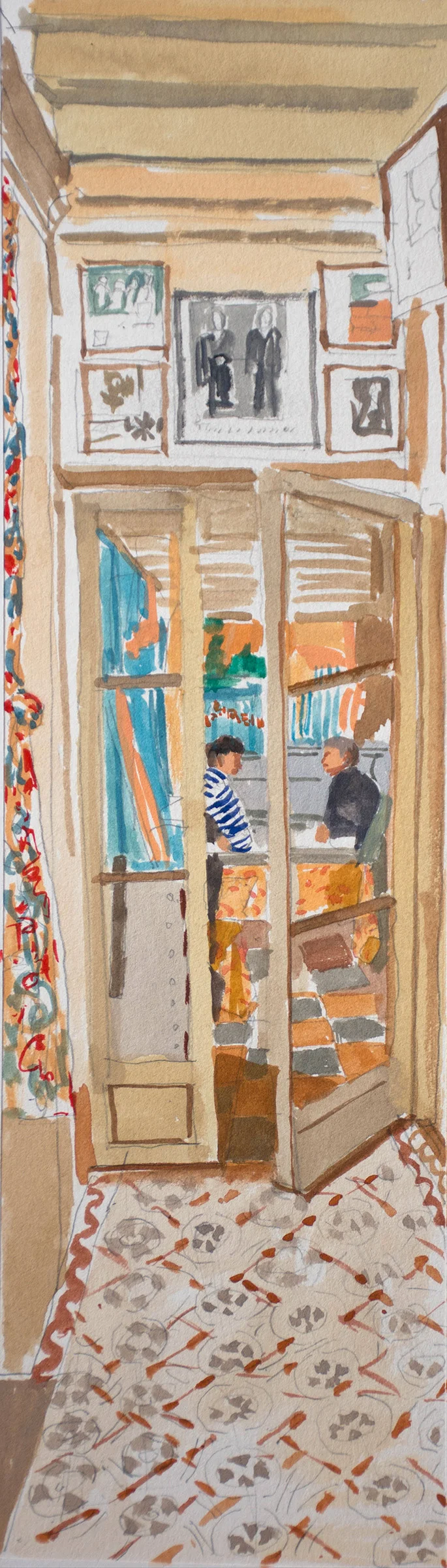 3:42: today i took a break form gaze 37 to paint this small (14x4") gouache based upon a photo collage i made at mount st. michelle, paris in 1994. i've been eyeing this photo collage for quite some time, and decided this morning that it's time had arrived. i may turn this into an oil on portrait linen in the future. i love the intimacy and warmth of this image of 2 diners at a beautiful parisian restaurant. it's dripping with that particular ambiance only the french can create.