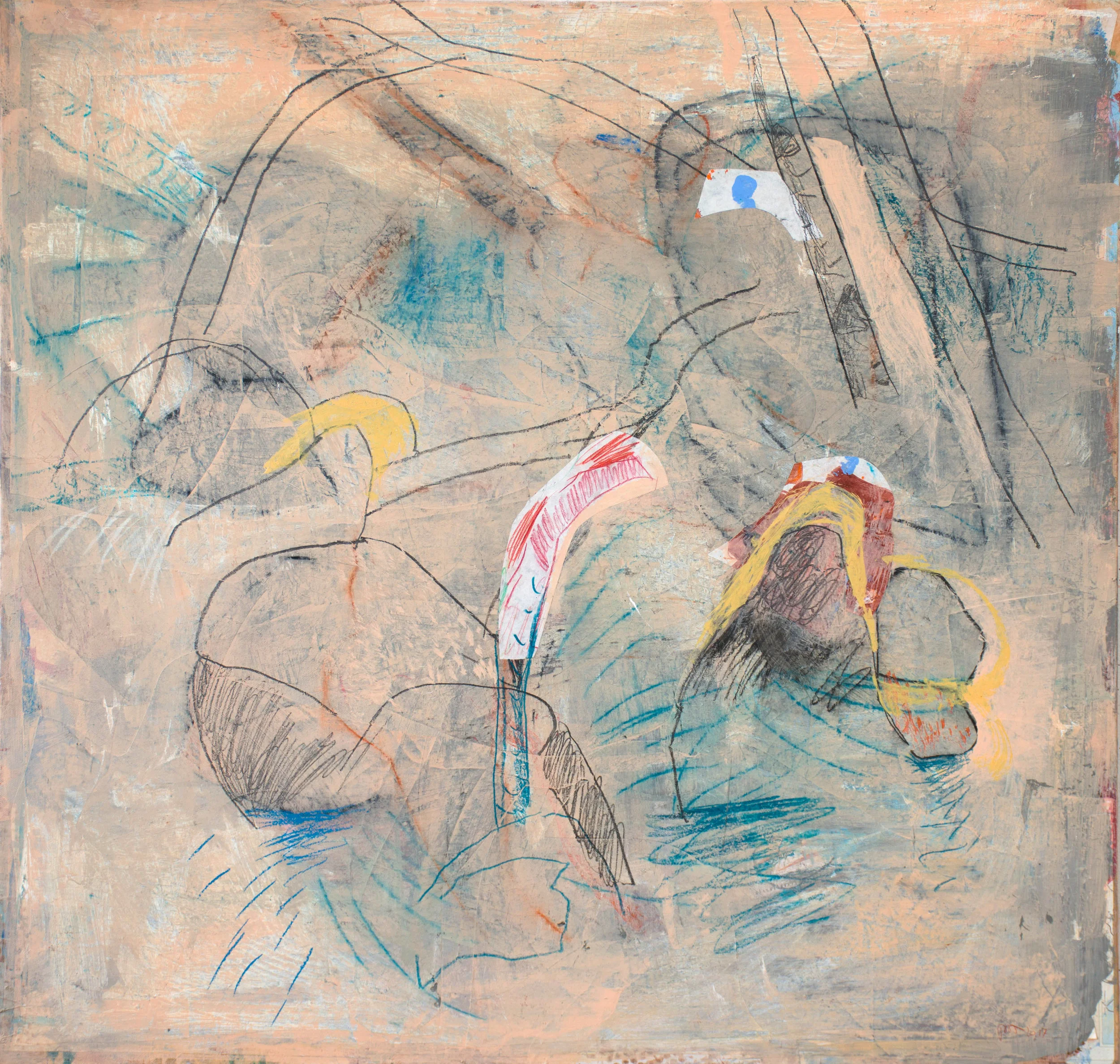 there are enough marks suggesting rocks that the painting can be seen as a creek-scape. but there are also ambiguous elements, which allow the imagination to leap in other directions, mostly connected to the natural world: critters of one sort or another; plant life; even the sky & stars.