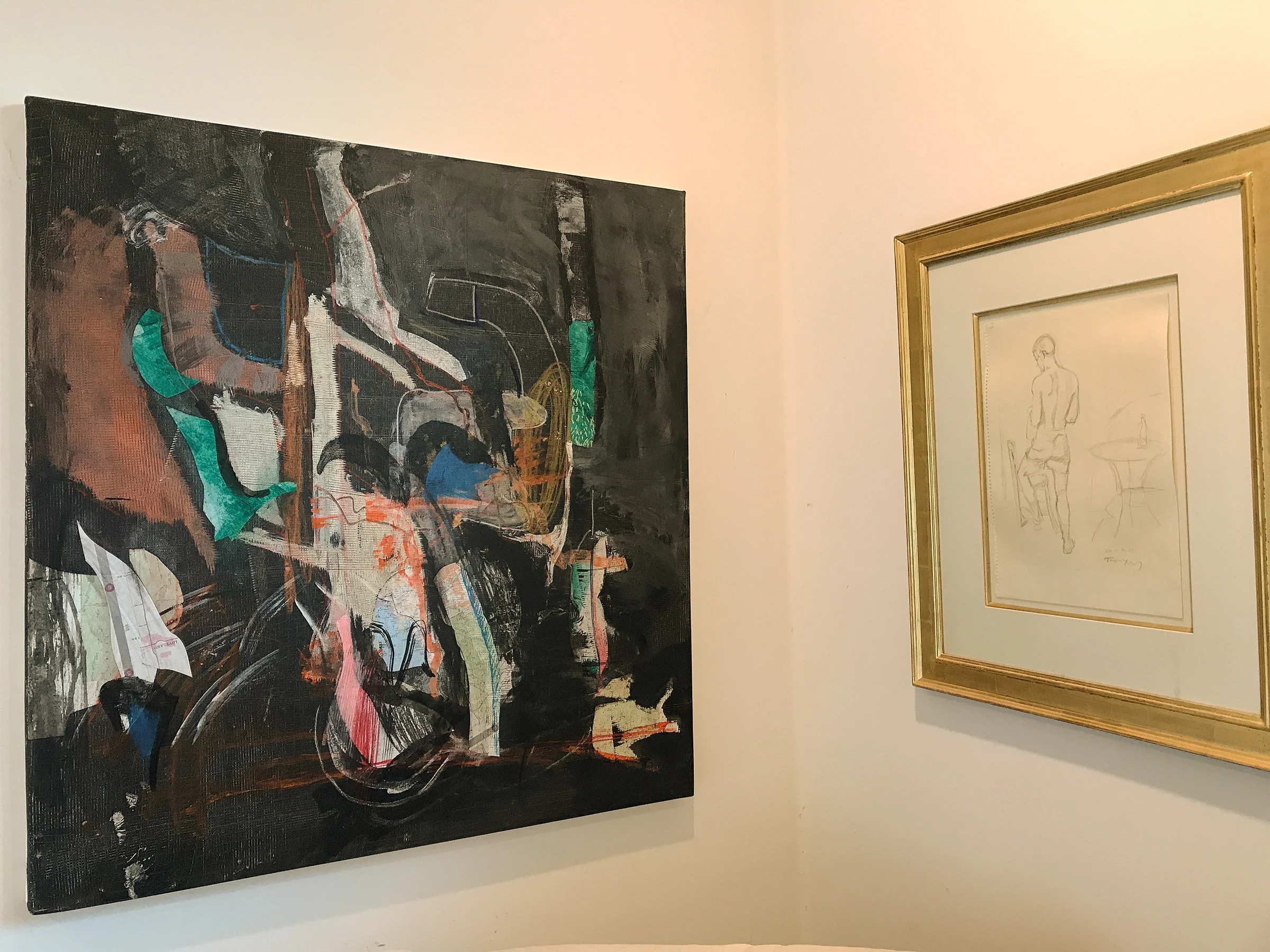 i hung the just completed irma in the house today, next to the drawing tsarouchis gave me. i wanted to see what it looked like in a setting other than the studio. first impression, it looks good! as i said yesterday, looking at this one in the studio hanging next to turtle island, on the LEFT, it became clear that turtle island needs more work. too fuzzy. yhe forms are not as clearly defined as they need to be. so that may be what i'm up to tomorrow.