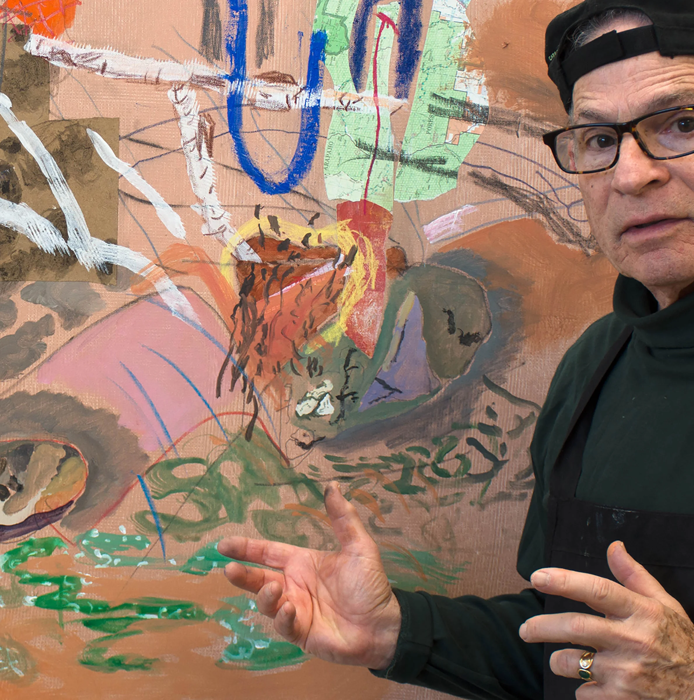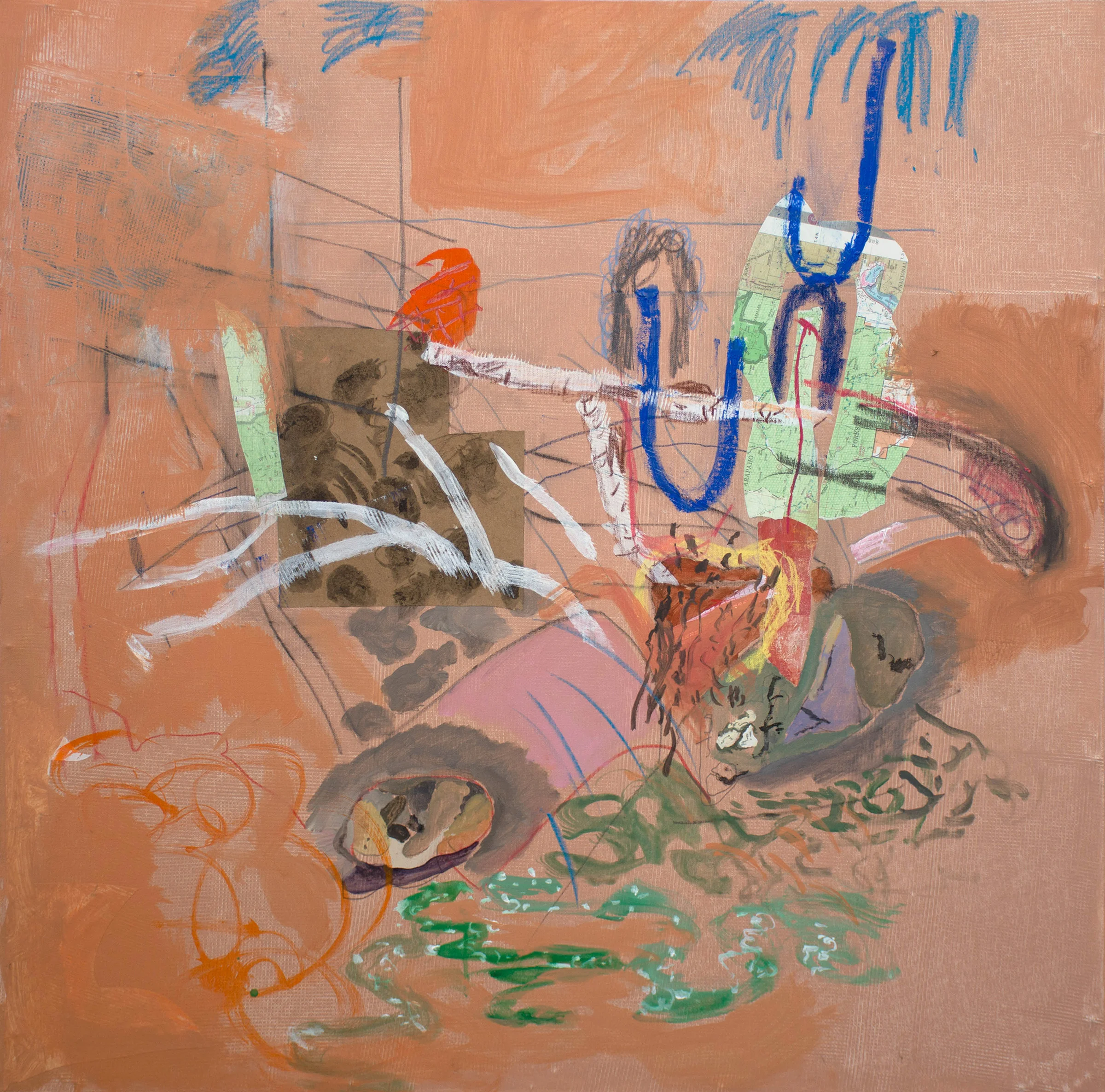 it has some beautiful passages, like the one you see in the photo on the right, and it still needs work. compositionally it's all over the place; doesn't yet know if it wants to be a duck or a kangaroo. the vibrant blue is not acrylic, but an oil stick. many have offered solutions for fixing oil crayons so that they don't come off when you touch them. i just cover them with a thin layer of acrylic mat medium and it seems to solve the problem