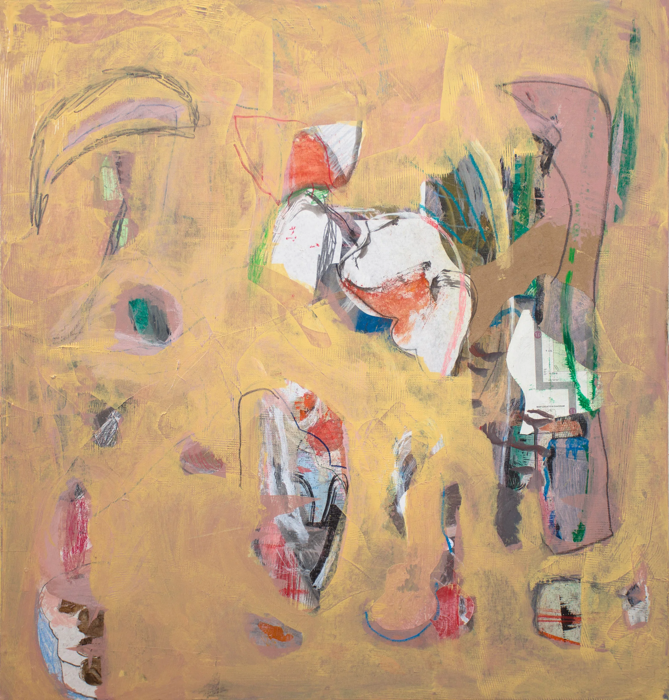 it's a rare dark day, with rain on and off, which will transition to constant rain shortly. so i took advantage of the poor light in my studio to stretch 2 new canvases on stretcher bars with masonite backing, both 38x36". i painted a naples yellow tinted ground on both, and on one, which you see BELOW, left a few windows of white to fool around with once i start painting tomorrow.