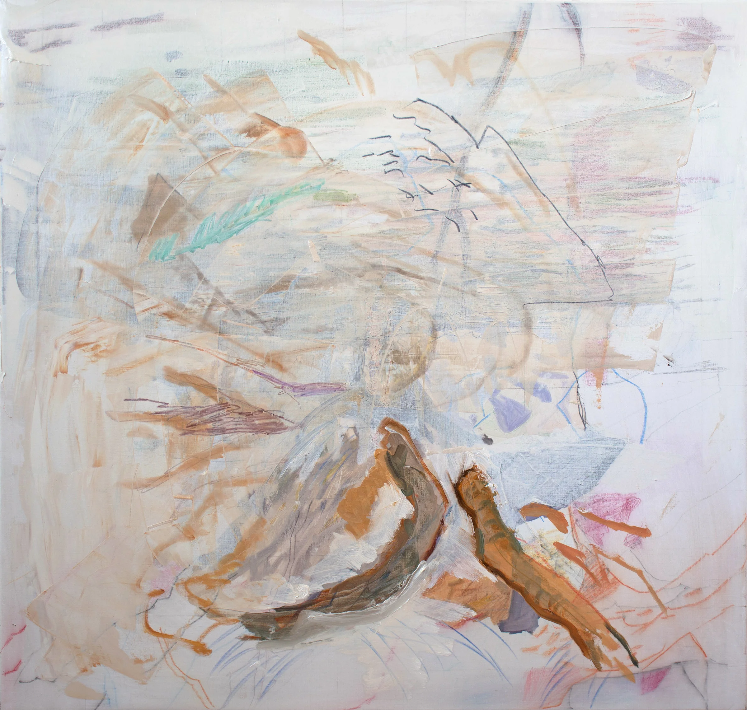 traces of the underlying painting peek through in the current phase, creating a play of lines and colors hinting at the vibrance and aliveness of the creek. as i rubbed over the original woman in landscape, areas that had been drawn in colored pencil, crayon and oil pastel smeared into the white pigment, resulting in a warm glow suffusing the entire image. early philip guston comes to mind, as do certain twombly images. lets see where it wants to go tomorrow. thus far, a constant in this series seems to be a painterly, layered picture plane, conjuring the sensual, roiling vivaciousness of the creek.