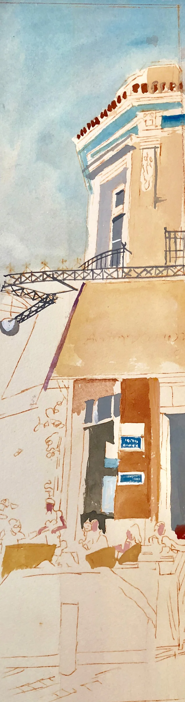 today i began work on a small (15x4.5”) gouache painting] for an exhibition titled athens endochora, opening december 4 in a new venue in the mets neighborhood of athens. the intention is to exhibit paintings by well known greek artists ( and one american) focusing on what is left of neoclassical athens. when i first arrived in 1963, there were still a large number of beautiful neoclassical structures in athens. slowly, they were thoughtlessly demolished, with ugly, characterless cement appartment buildings taking their place. with my then mother-in-law, painter niki karagatsi, wife of the famed author d. karagatsis, we regularly went to neighborhoods in athens & piraeus and made paintings, many of which included these buildings. i was asked by nikos vatopoulos, a well known athenian writer to participate in this show, preferably with a painting made within the last 2 years. so i’m woking on this painting of the athinaion café in the thision neighborhood near the acropolis. i’ll send it off as soon as it’s complete.