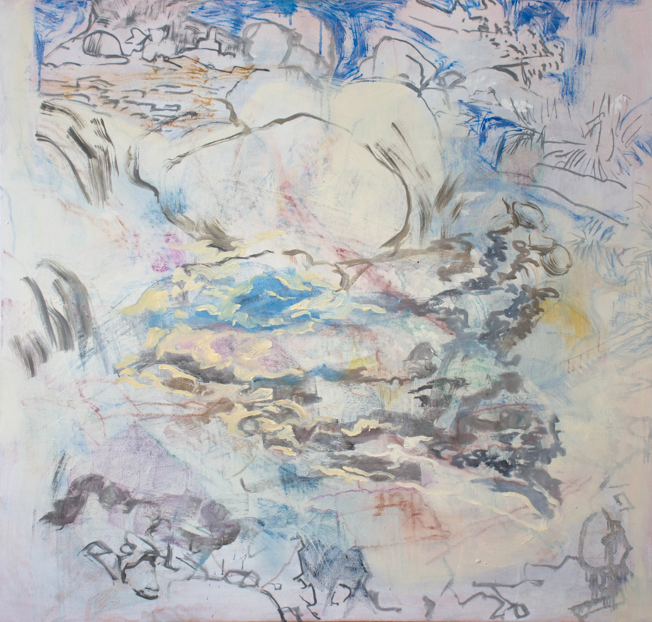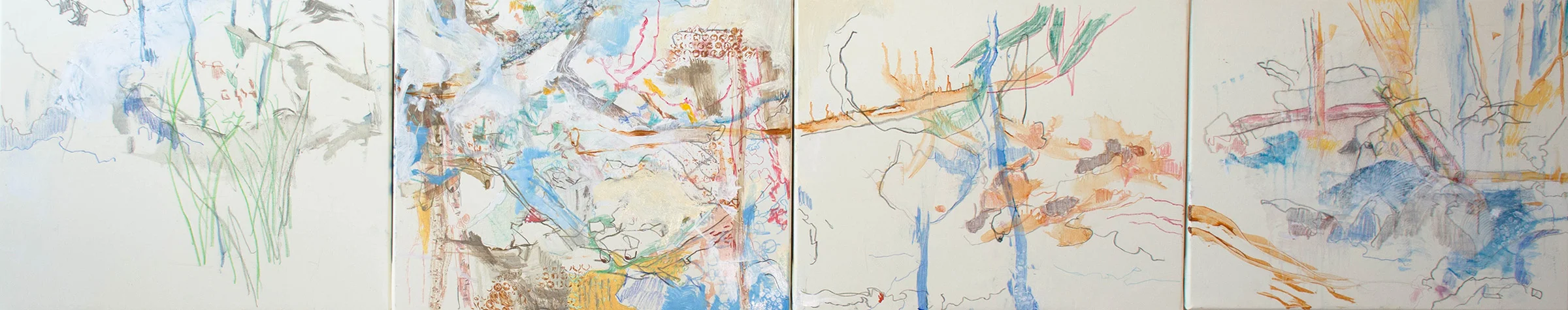 so i got to work earlier & made some important changes to new rules. BELOW is a comparative view, with what i did this morning on top & yesterdays version below. the second canvas from the left has been significantly de-cluttered, and a band of light grey has appeared above & below, allowing the eye to perceive all 4 canvasses, for the first time, as one painting. rock forms have been sketched in across all 4 canvasses, using my fan brushes as a hats off to my ever present 10th century chinese masters of calligraphy & landscape. motion, which is the title of this series, is introduced & the viewer is invited to fill in the blanks, so to speak. it’s what you might call, if you like to invent & play with words as i do, a kinetic-frizz-about-