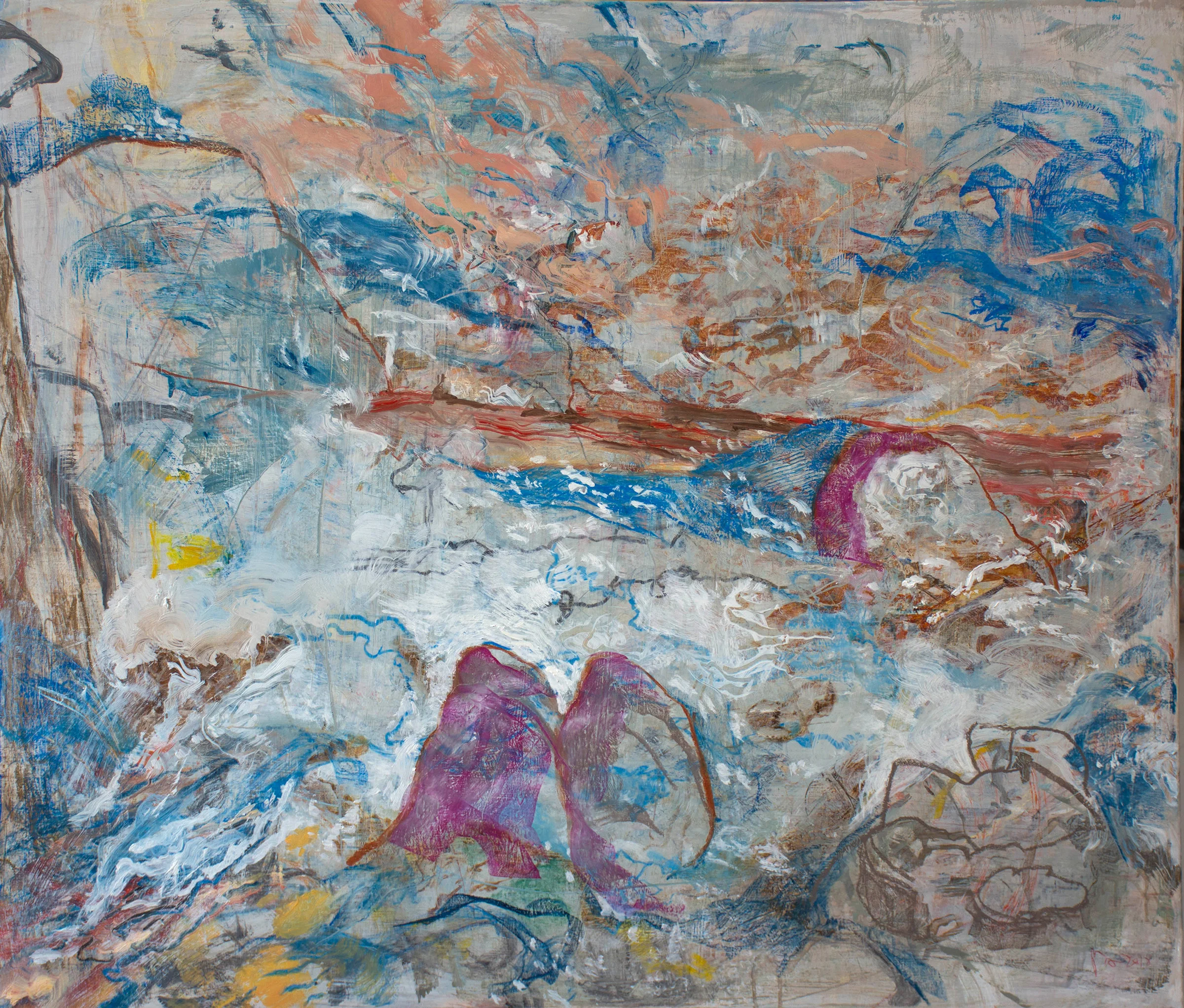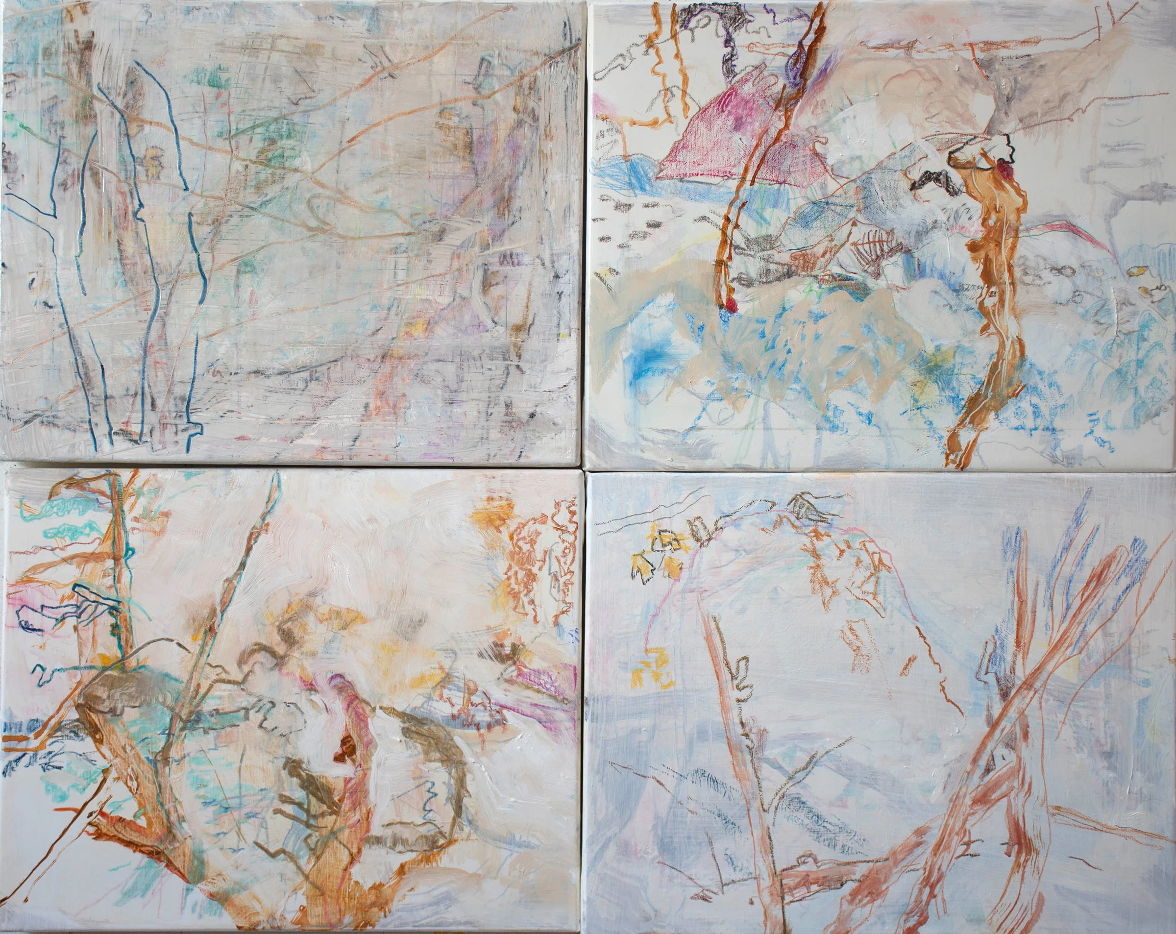 3:53 PM: i worked on canvasses 3 & 4 of 4, which are meant to be hung in 2 rows of two. at the end of my painting day, i lightened the lower left corner of resting tree, which, after glancing at it repeatedly during the day, seemed a bit too heavy.