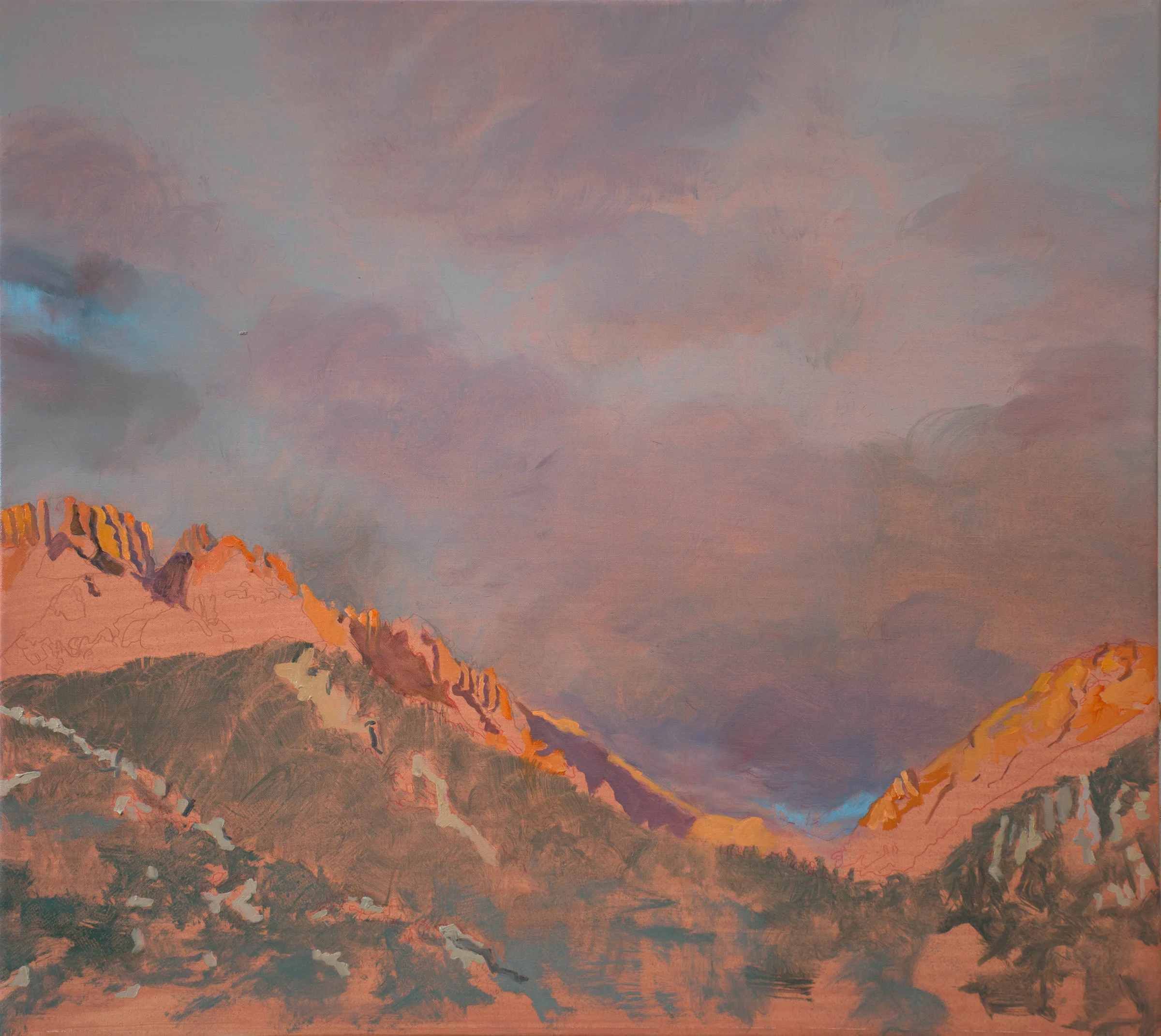 12:27 PM: after preparing a siena tinted ground yesterday afternoon on this & one other 32x36” linen canvas, i began work this morning on 9/1/16 6:47pm. thus far, i’ve done most of the drawing on the mountains, on the lower portion of the composition. not without fear & trepidation, i launched into the very subtly toned grey/purple/orange sky, which allows only small areas of blue to emerge from the clouds. so now i’ll proceed to the lower portion, once again with fear and trepidation. did lucien freud feel this way every time he prepared to work on a portrait? hockney’s portrait, for example? in the photo of the 2 of them together in freud’s studio, hockney has a quizzical look, and freud, brush in hand and apron on, has an enigmatic one, hard to read.