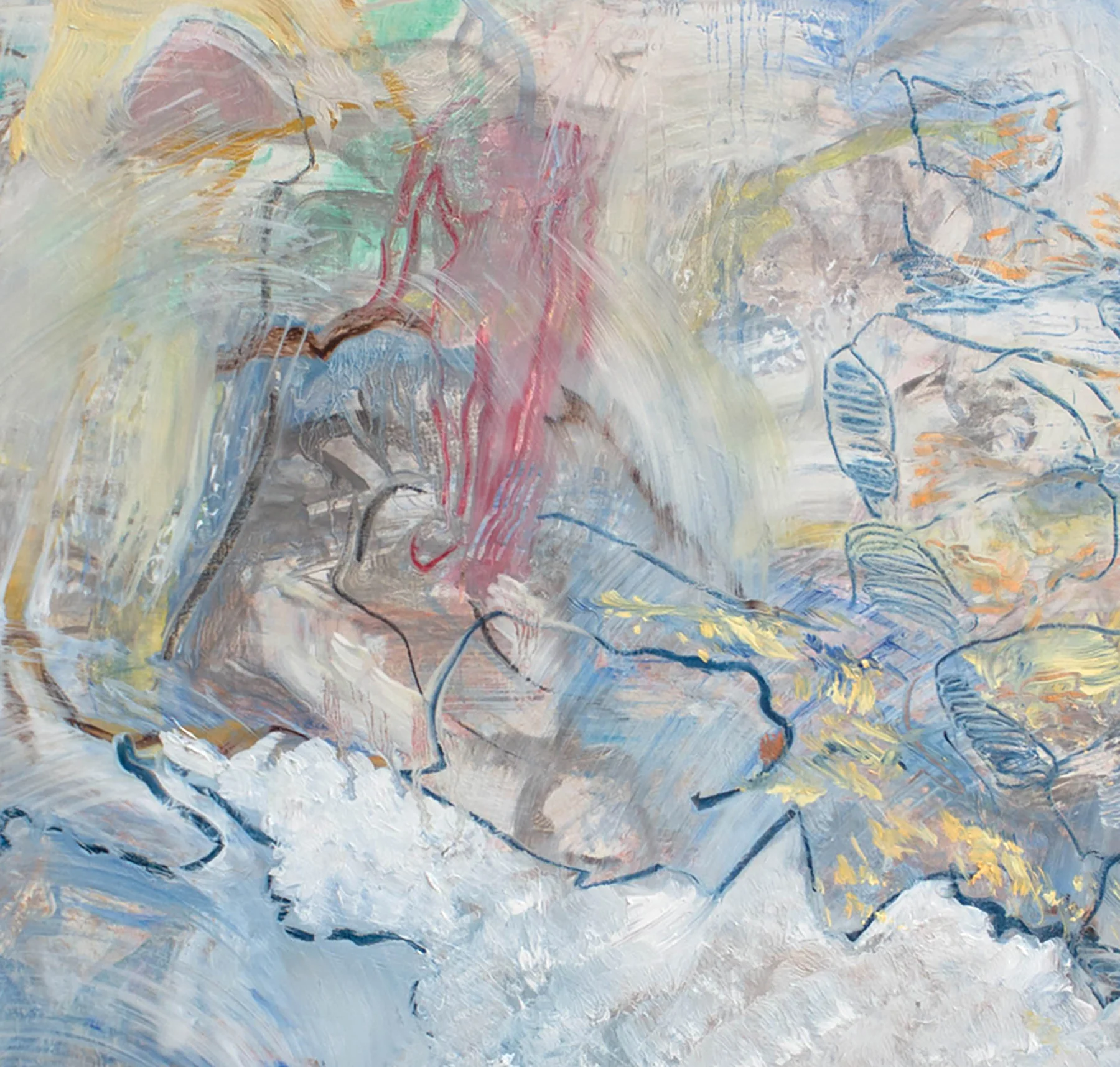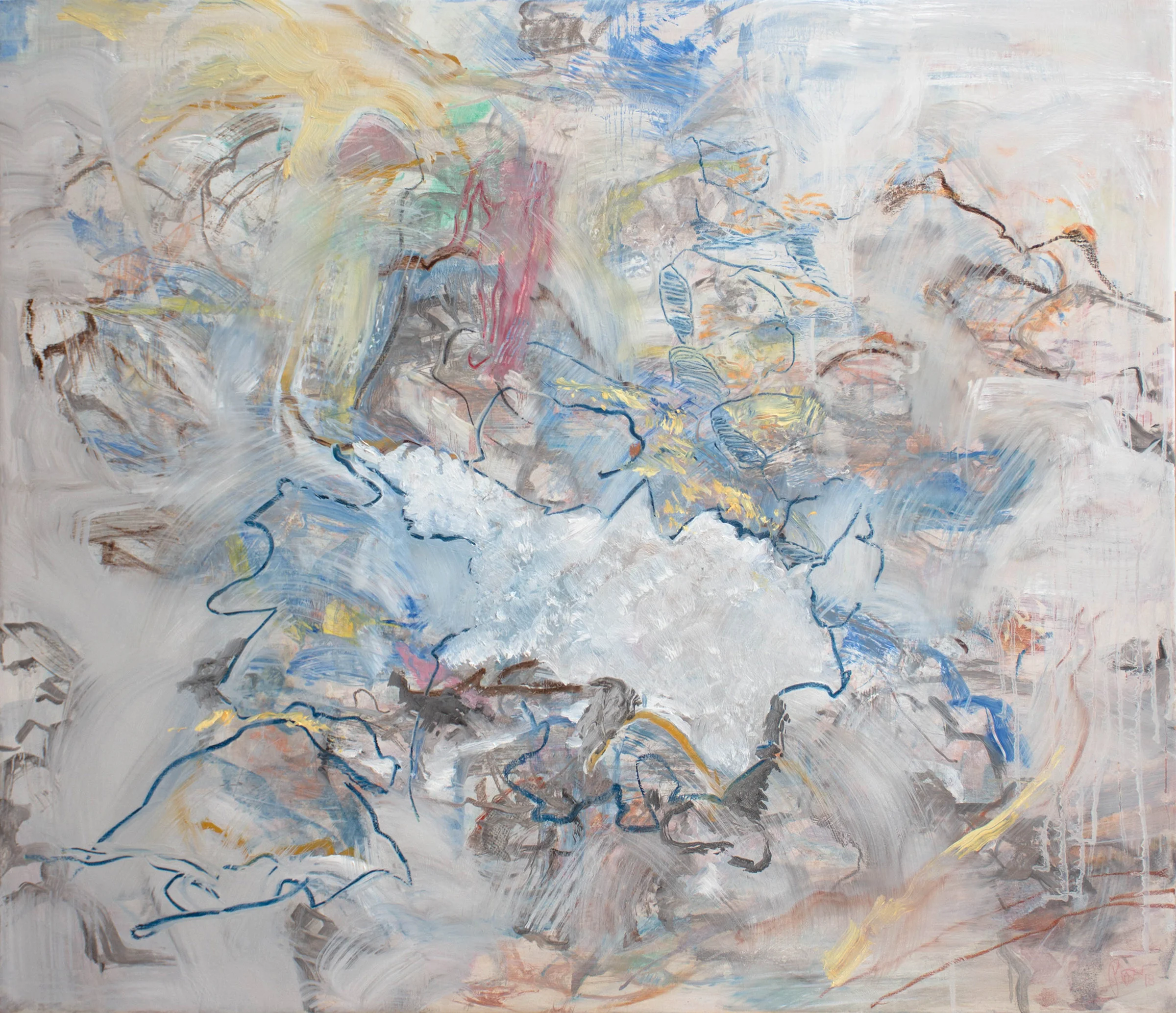 2 PM: this one is more of an odyssey than any of the others. it doesn’t really bother my; I love odysseys! i introduced a female figure standing on the rocks, which i photographed at fish creek in early fall. you can see her mid left, her head facing the left edge of the canvas. she’s naked, which of course she wasn’t in the photo. i’m going to continue working for another hour or so & see where it goes next.