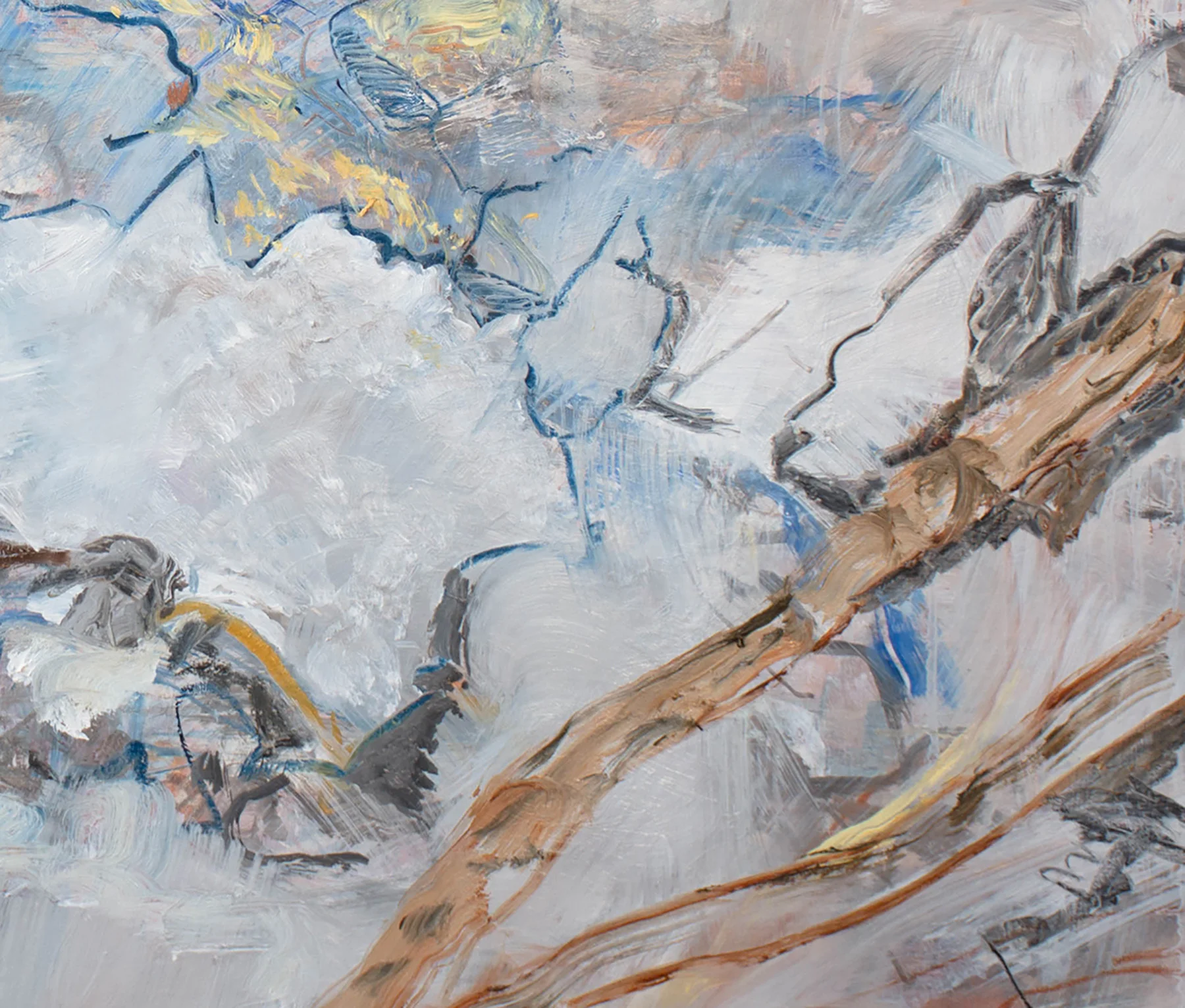 3:32 PM: here’s where tree resting is at right now.once again, extraneous, unnecessary marks have been painted over. The ice floe retains the dominant space in the composition, with the mysterious femail figure seeming to approach it. two branches have been reintroduced. cleanup time.