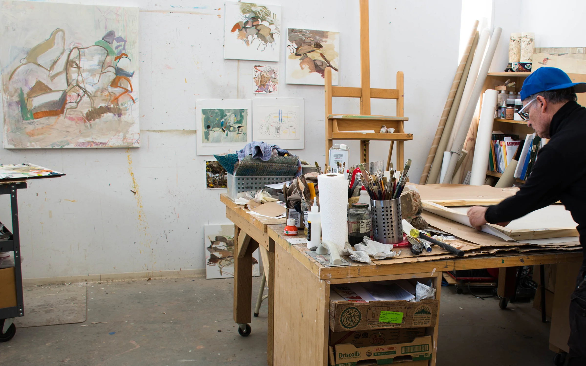 12:24 PM: today i'm preparing a new 38x32" canvas for landscape series 9. i don't kinow yet which images i'm going to draw on. that decision will come as soon as i'm done stretching the portrait linen. on the wall & to the left you can see the now completed landscape series 8, which will head over to the house as soon as it dries a bit more.