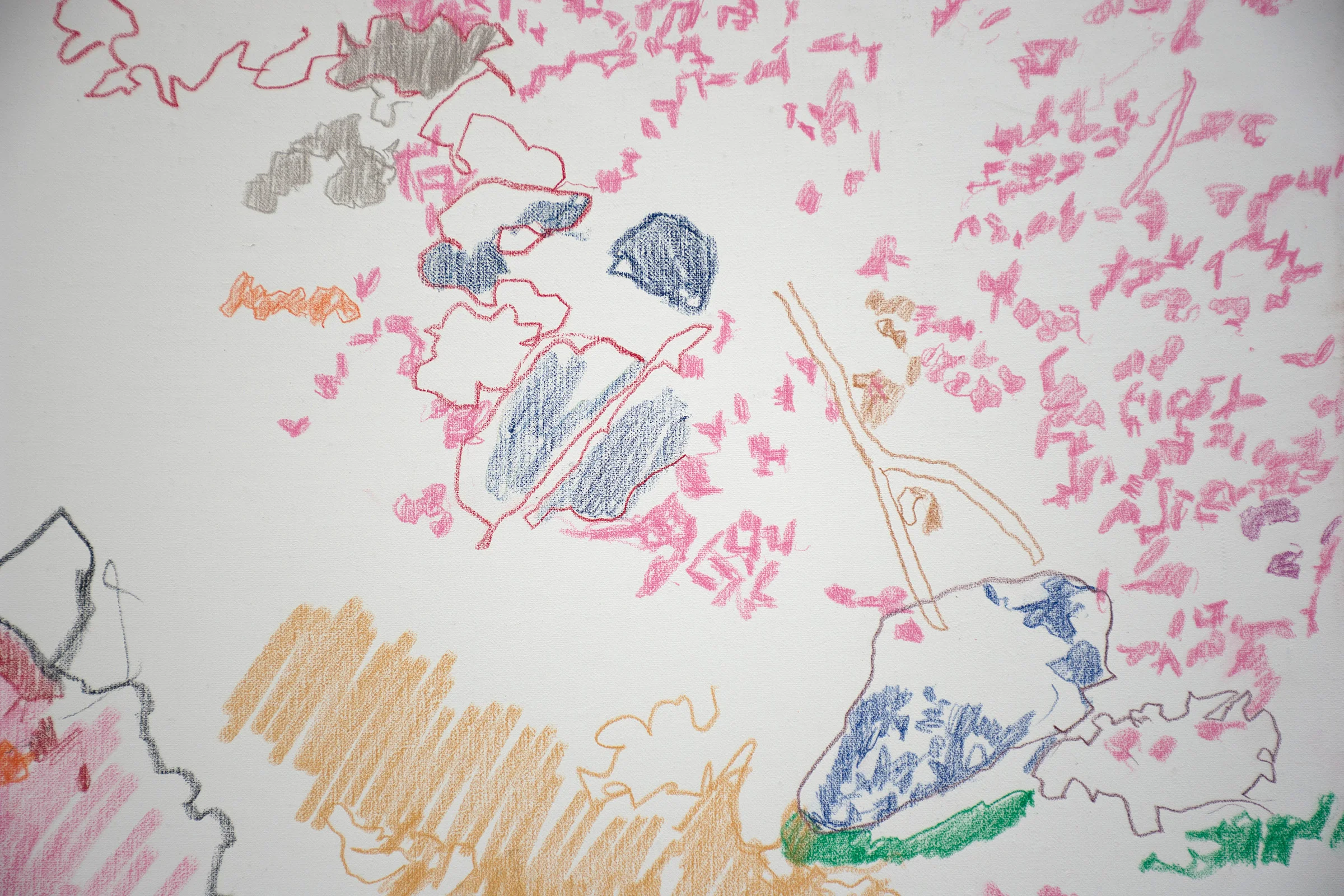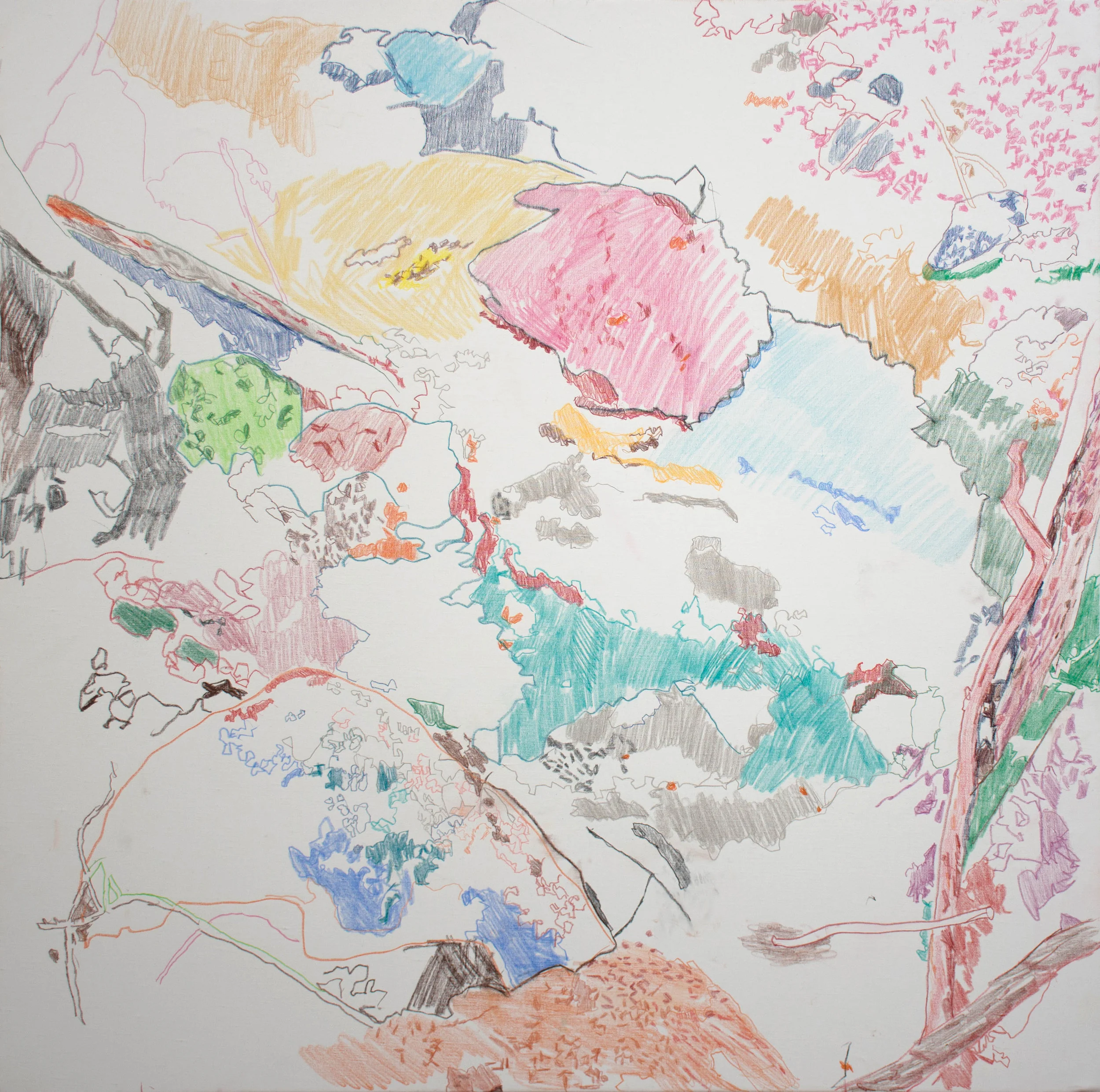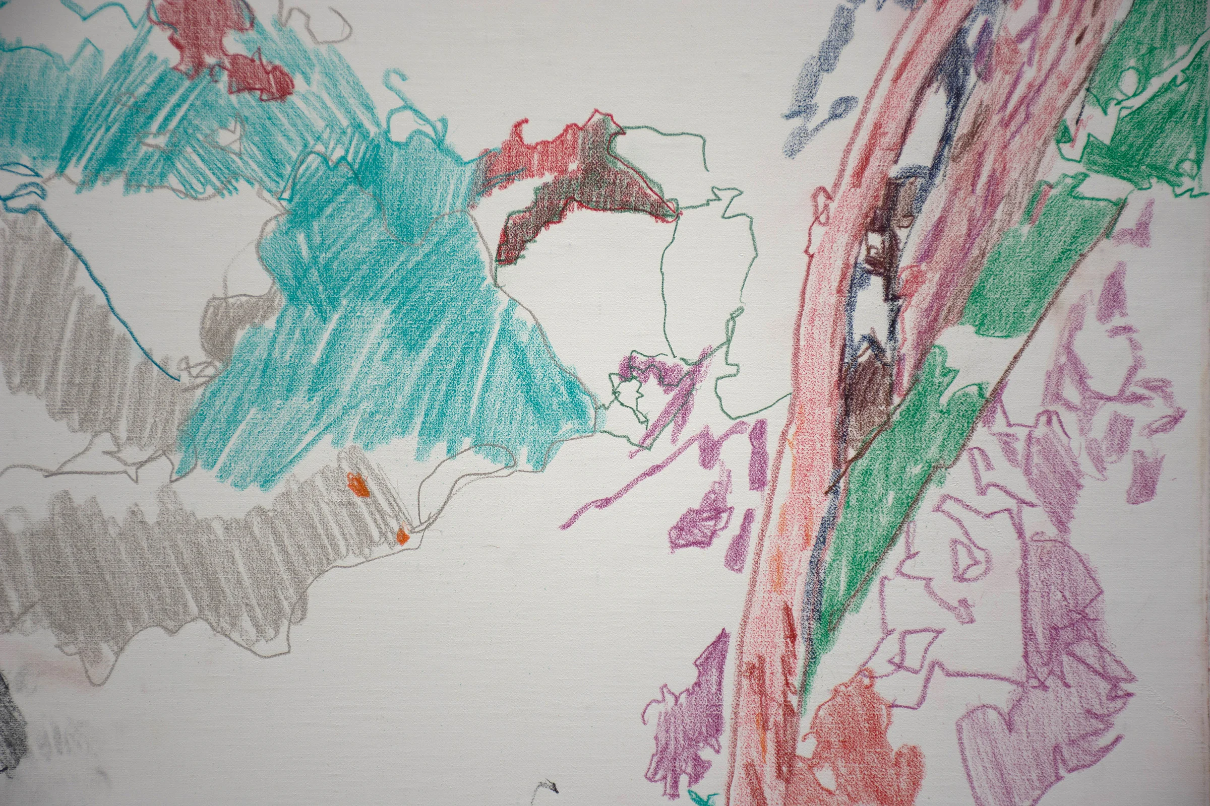 2:57 PM: the drawing progressed further. i haven't yet put brush or oil to canvas, and am engrossed at the developing patterns of blues, pinks, and greens emerging from the grey/blue/tan rocks. as long as i'm having fun with the process, the under-drawing will continue using just colored pencils and, occasionally, crayons.