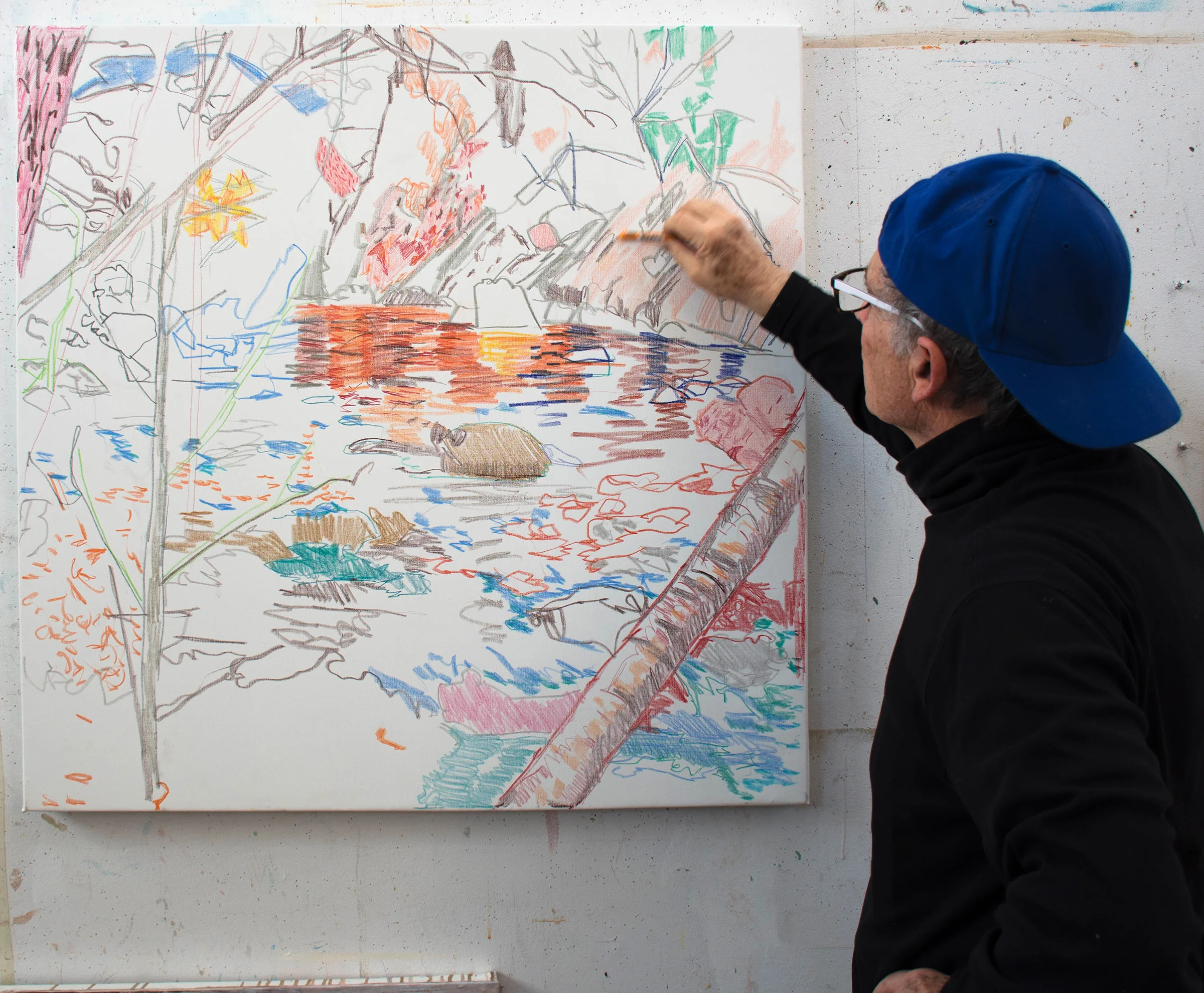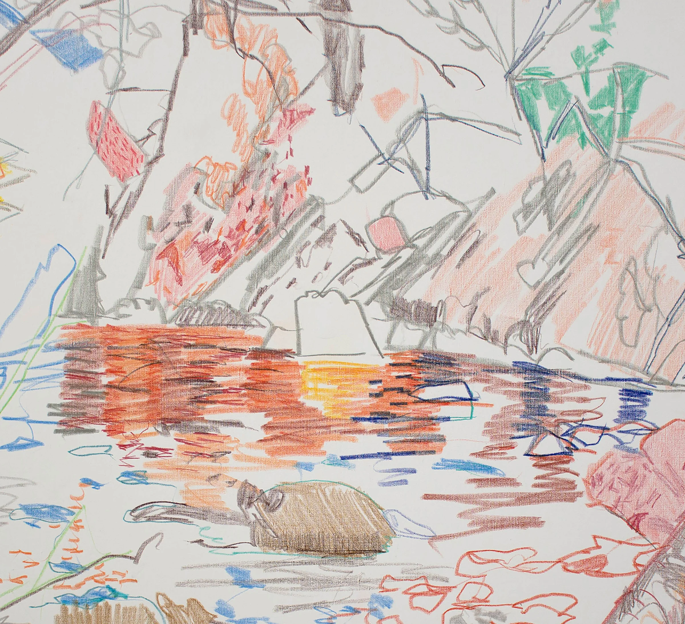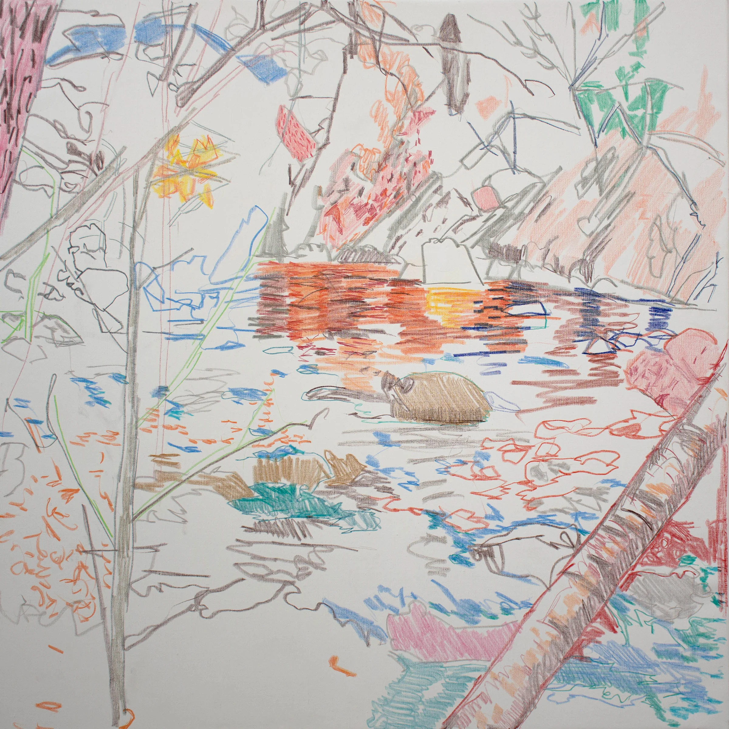 3:19 PM: today i took the under-drawing for motion 13 further, using colored pencils and mostly crayon, with a little oil pastel as well. this drawing can barely restrain itself from dancing right off the canvas. it's a great example of how sometimes departing from naturalistic colors can actually enhanse the sensation of the actual landscape as it appeared that day last november. as with all the previous under-drawings, it's difficult to bring myself to paint over it, obscuring most of the passages partially or totally. i'm in no rush however, and we'll see how i feel in the morning.