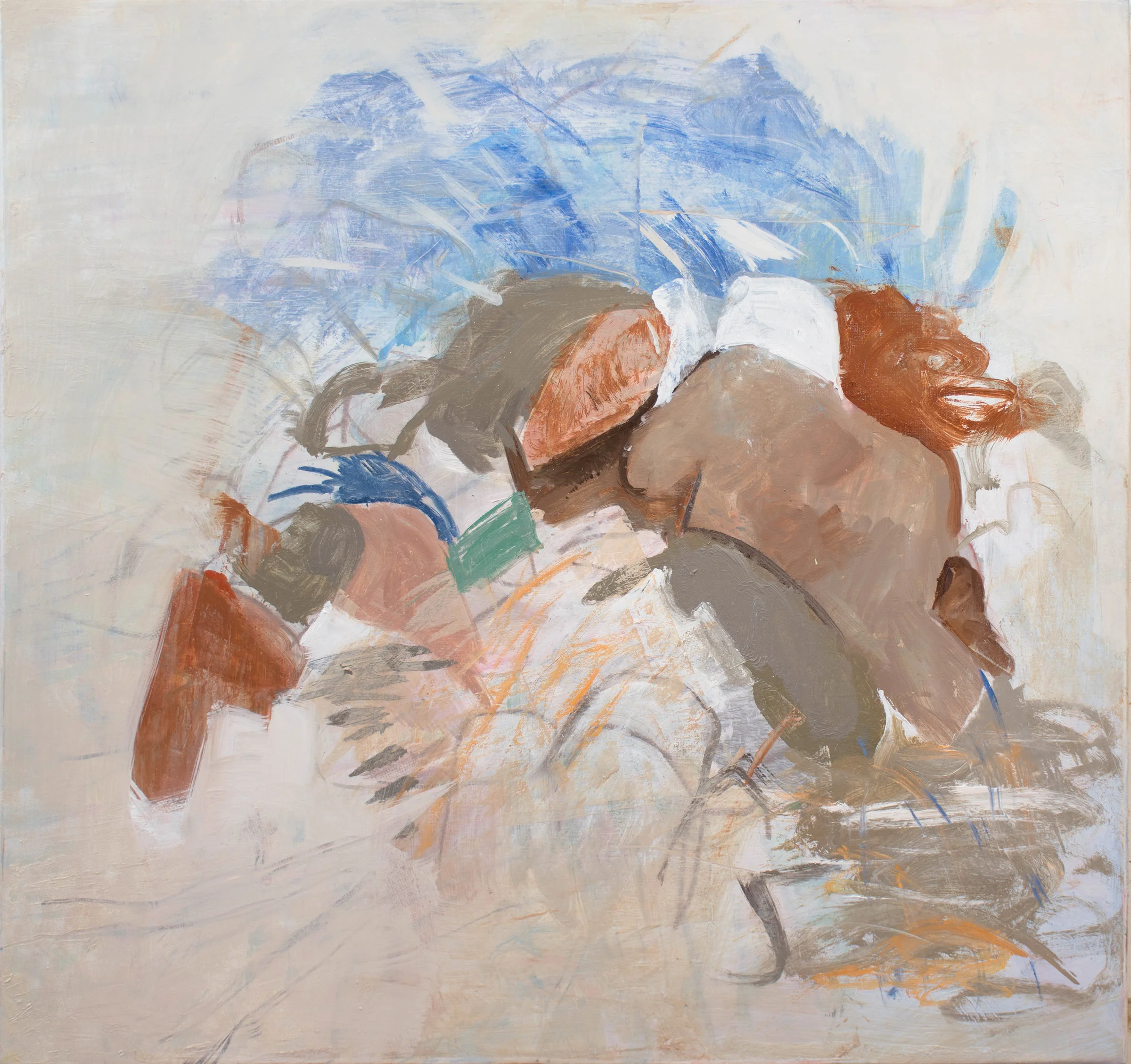 the inverted reddish V shape pn the left was the first to go; a rather awkward shape asking to leave. what i call "kneeling elephant, on the mid right, also left the picture. the blue on top was interrupted by an area of while with the red outline of a couple of rocks, borrowed form one of the more successful plein air oils painted in 2104.