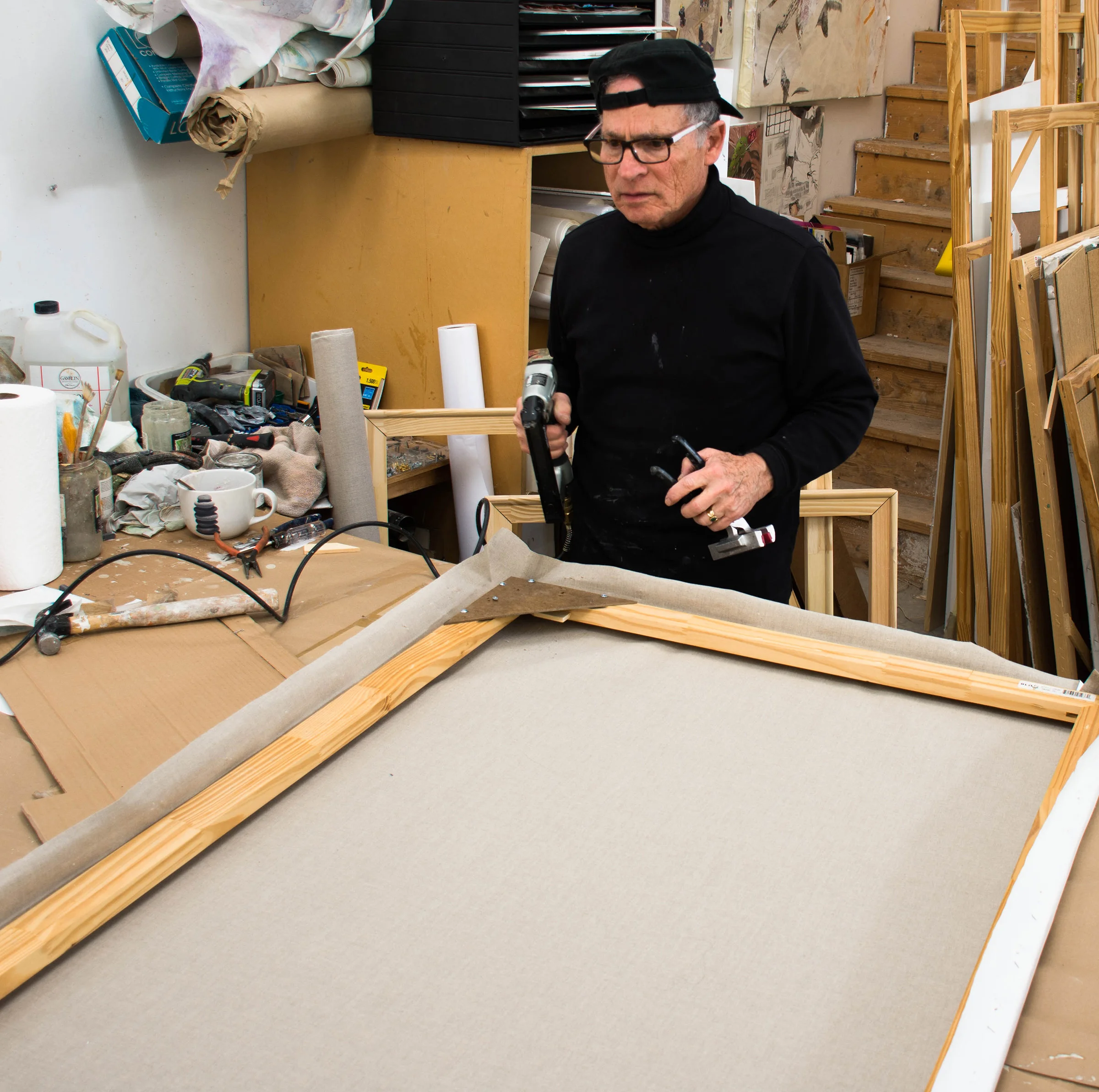 12:15 re-stretching the canvas for motion 20. yesterdays stretching was flawed so i had to remove all the staples & start over.