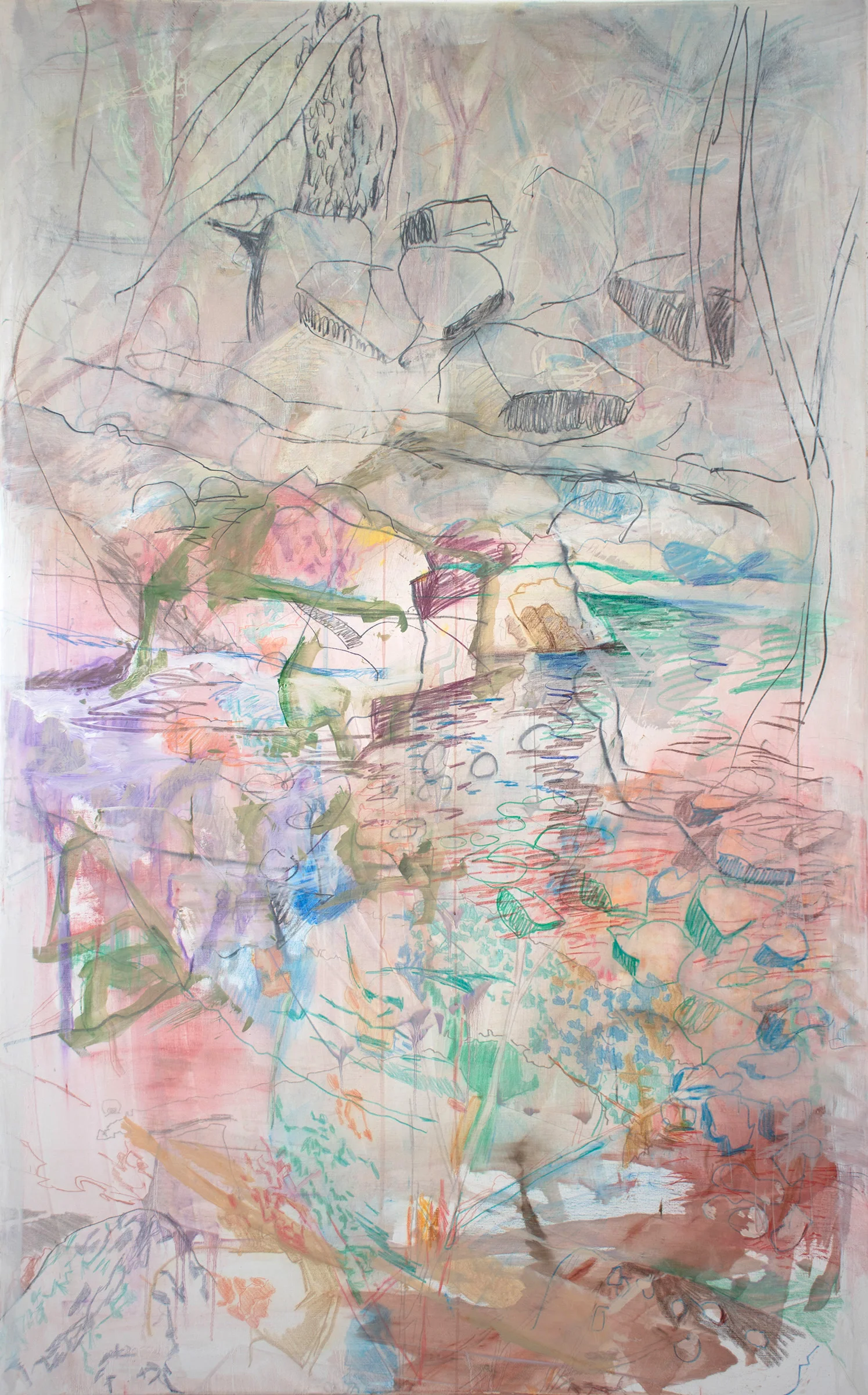 12:25 PM: after a brief studio visit by mikela, i made some minor but all important changes to motion 20. i say all important because, as you can discern form the comparative shots from yesterdays version, the entire composition snapped into focus by what i did. firstly, you will notice that the black & white upper portion of the painting now unites with the lower portion by the simple extension of the b&w tree trunk lines on the far right from the upper extending now into the lower, colored area. next, the white border i had created yesterday running down both sides of the painting has been interrupted in some spots, allowing the pastel colors to extend in those areas to the edge of the composition.