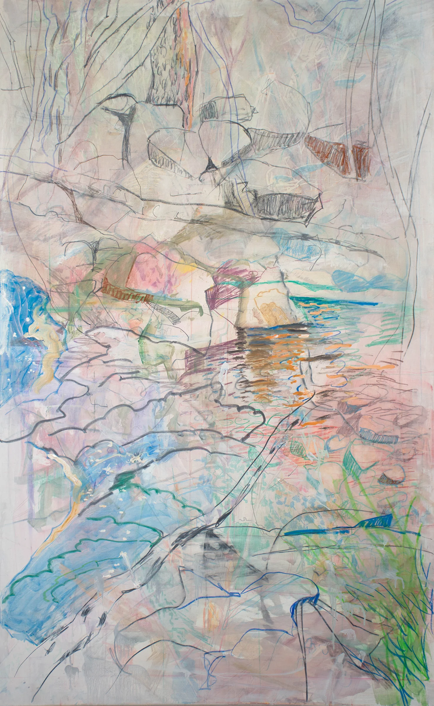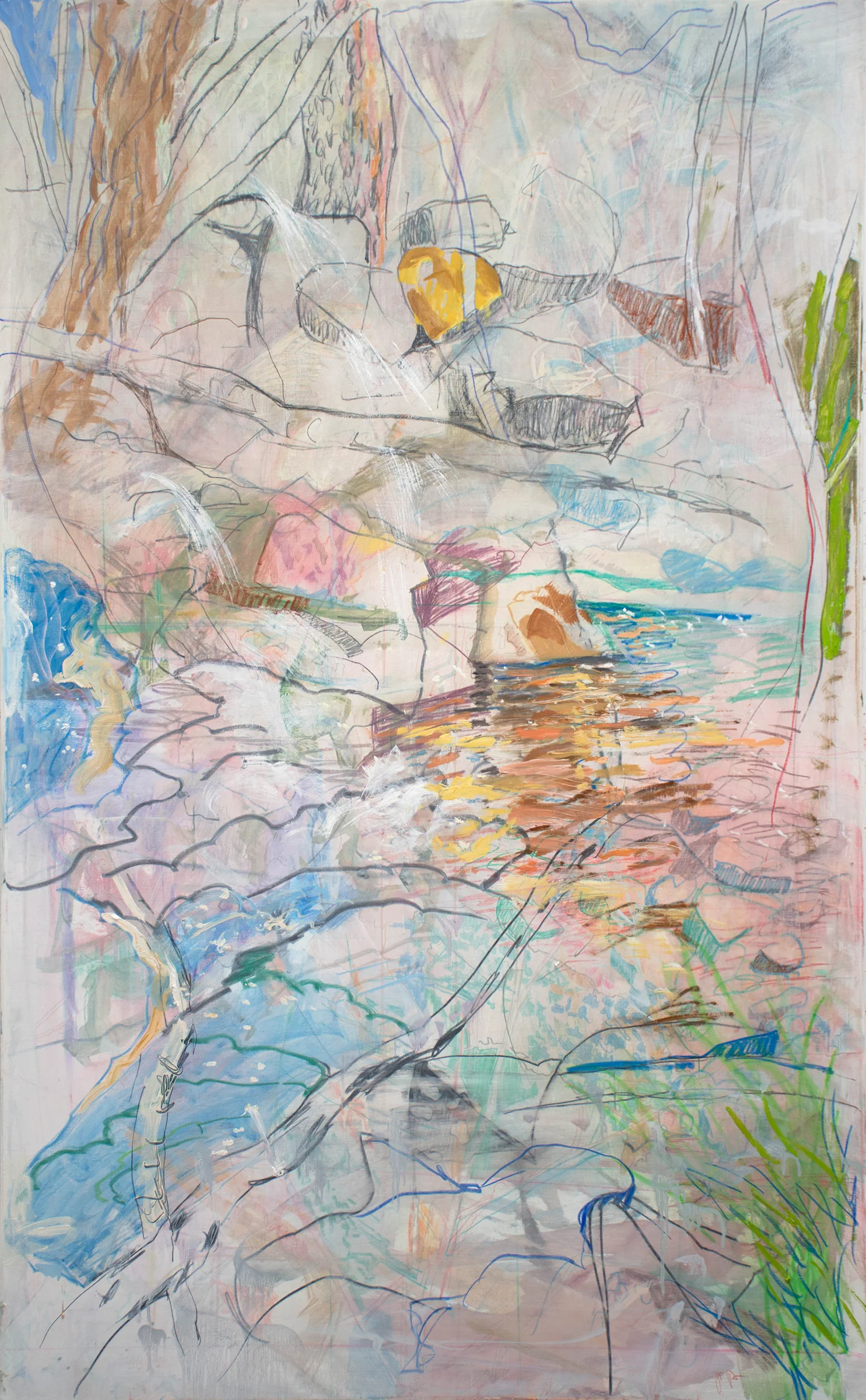 you'll notice, in comparing todays version with yesyterdays, above, that i added i added green on the upper right, as well as the naples yellow rock in the upper center & more richness to the reflections in the water below the rock in the center. as well, the blue on the lower left needed to be broken up, some white splashes of creek water have appeared, as well as the little white bubbles. the tree trunk on the upper left now has some patterning.