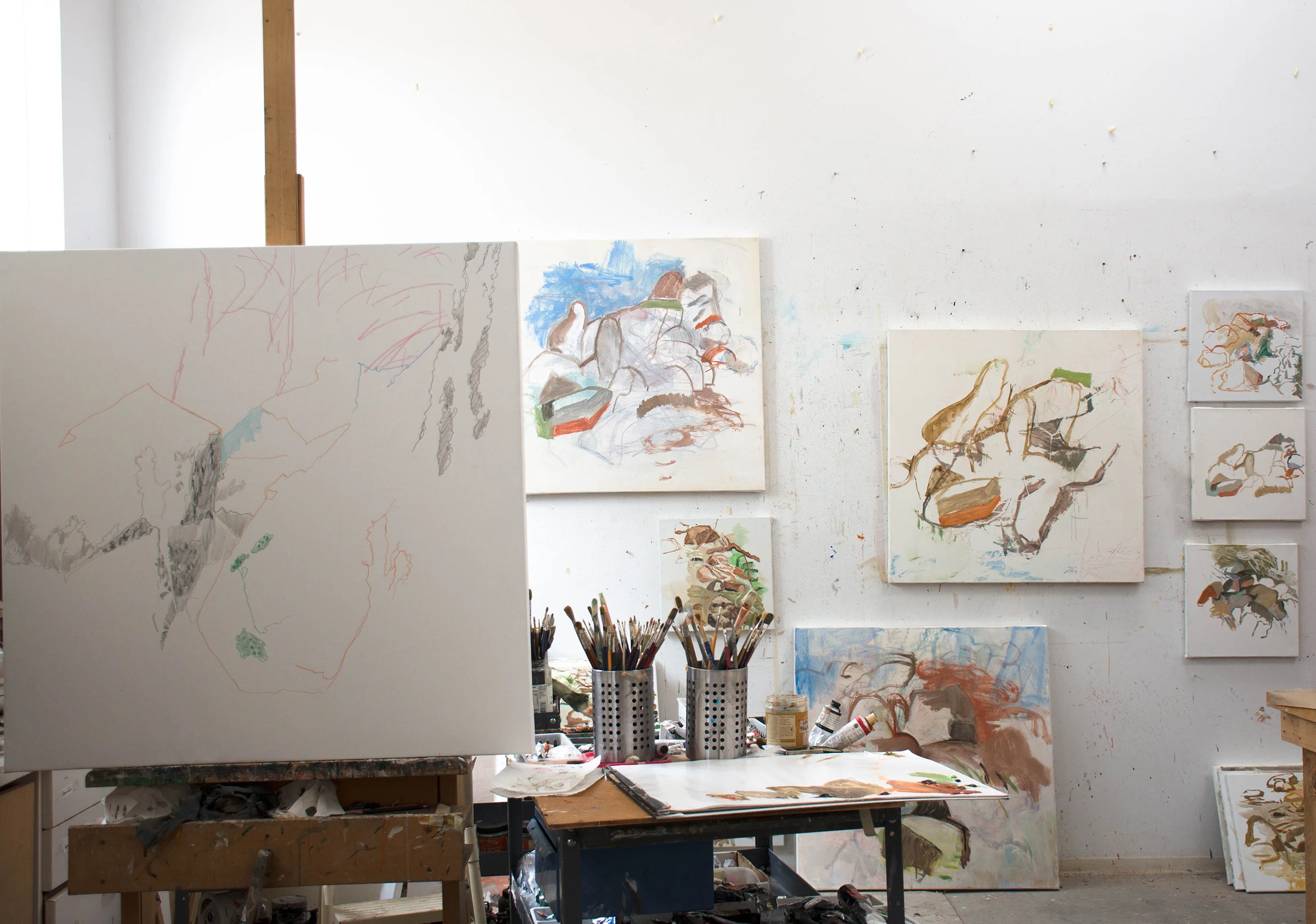 studio interior at 2 pm, an early stage of the motion 17 under-drawing on the easel . on the wall the just completed motion 16