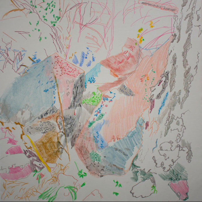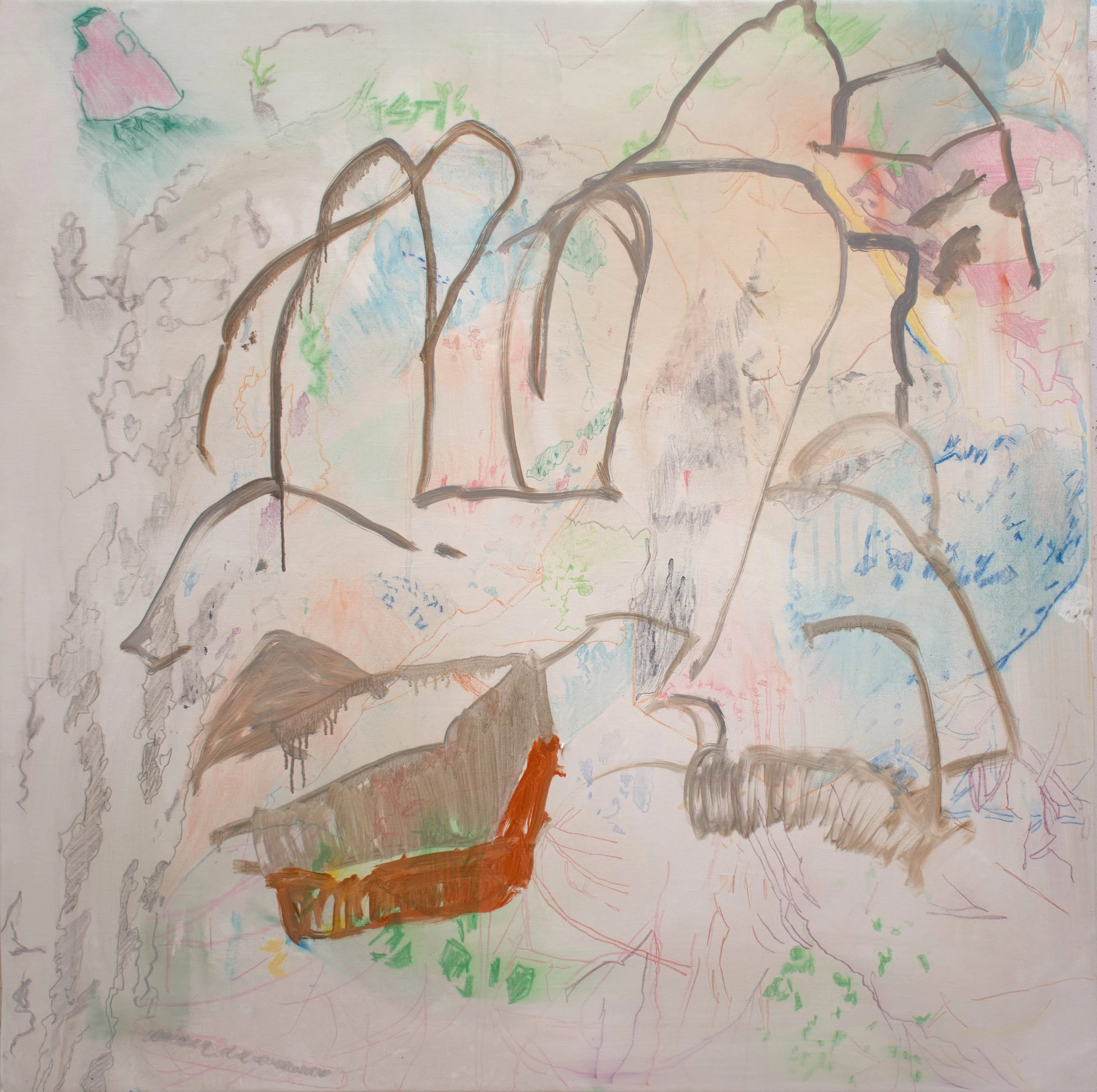 2:16 PM: i began the painting based upon one of my most loved plein air oils. then i scraped & wiped it out completely, leaving beneath traces of the under-drawing, over which i made this drawing in diluted oils. i may stop here for the day. i like what's happening, how familiar rock forms are distilling down into essence, with their own calligraphic logic, which is more than ever reminiscent of human & animal forms.