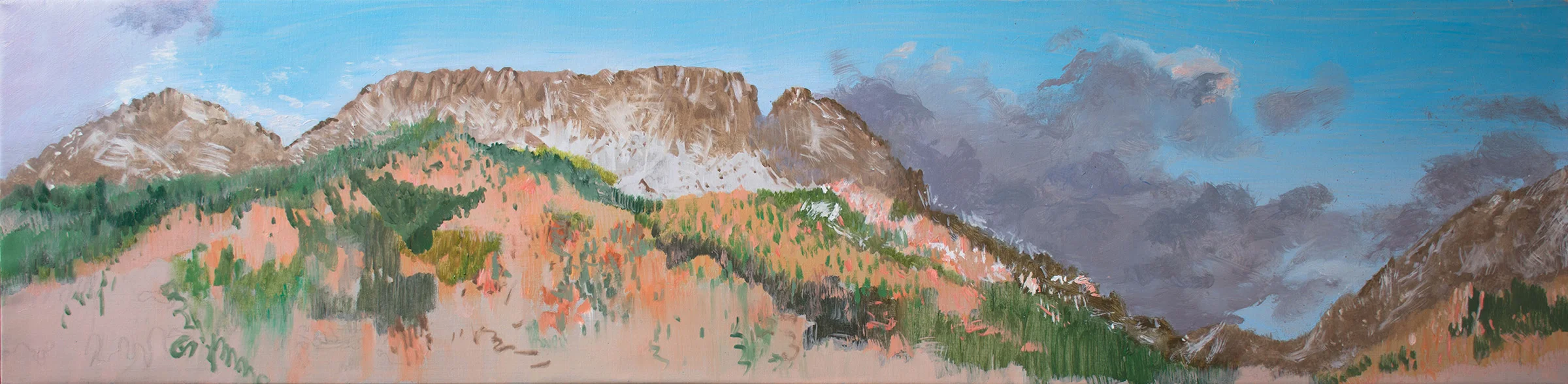 sangres with purple clouds at 1pm the painting is in oil on linen and measures 12x48"