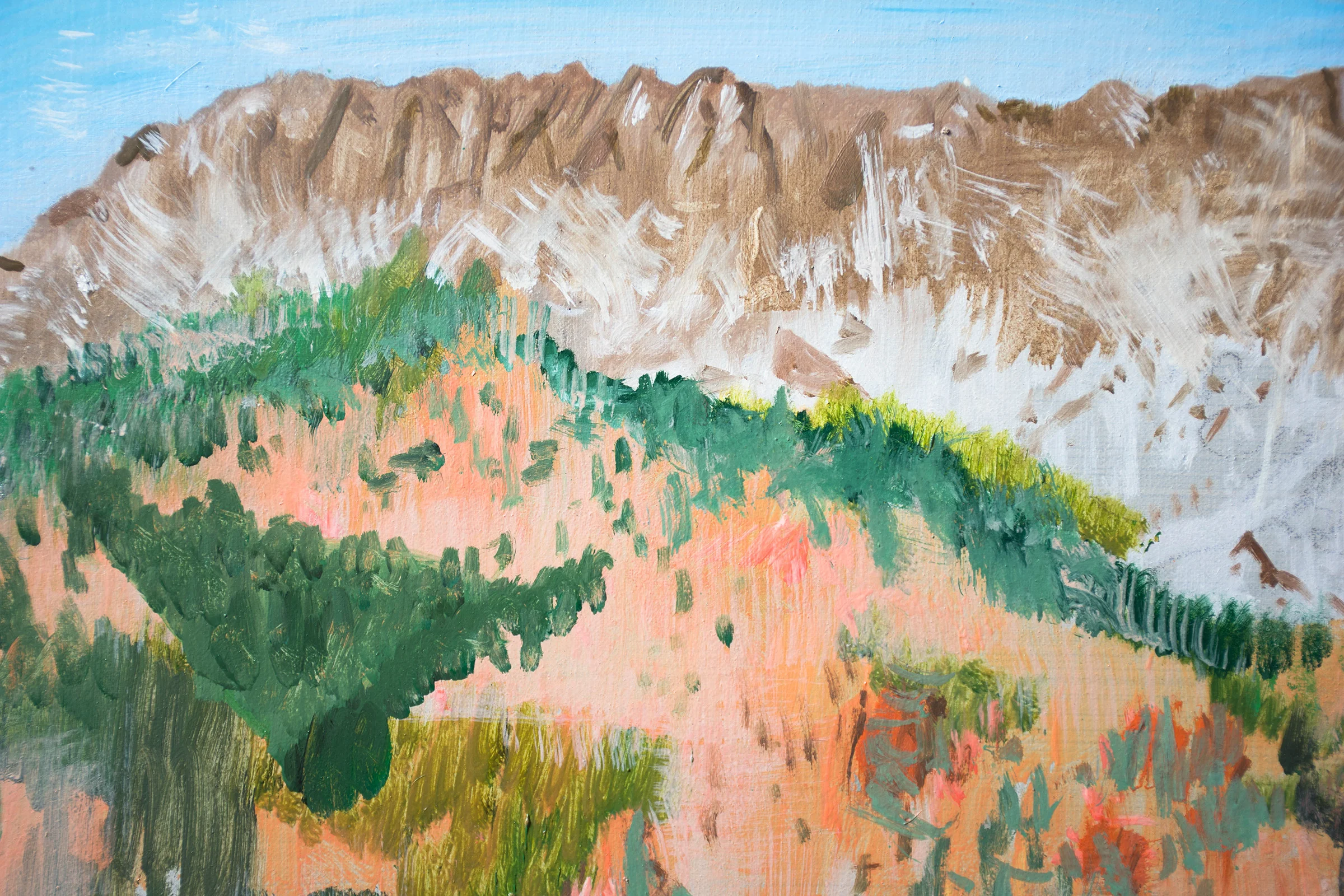 noon: a system is moving through the valley yesterday & today bring some snow, albeit light, & colder temperatures. i am continuing work on sangres with purple clouds, moving closer to resolution. this is a delicately balanced composition, & every flick of my fan brushes, which is what i'm mostly using on this one, contributes to the illusion of the mountain, with it's piñon pines, rugged rocks & traces of recent snowfall. as i have mentioned before, i'm drawing some of my inspiration form the 19th c. plein air painters, largely italian & french, who left many of their small plein air sketches in an "unfinished" state because they knew they couldn't count on the same weather & lighting conditions the next day if they returned the following day.
