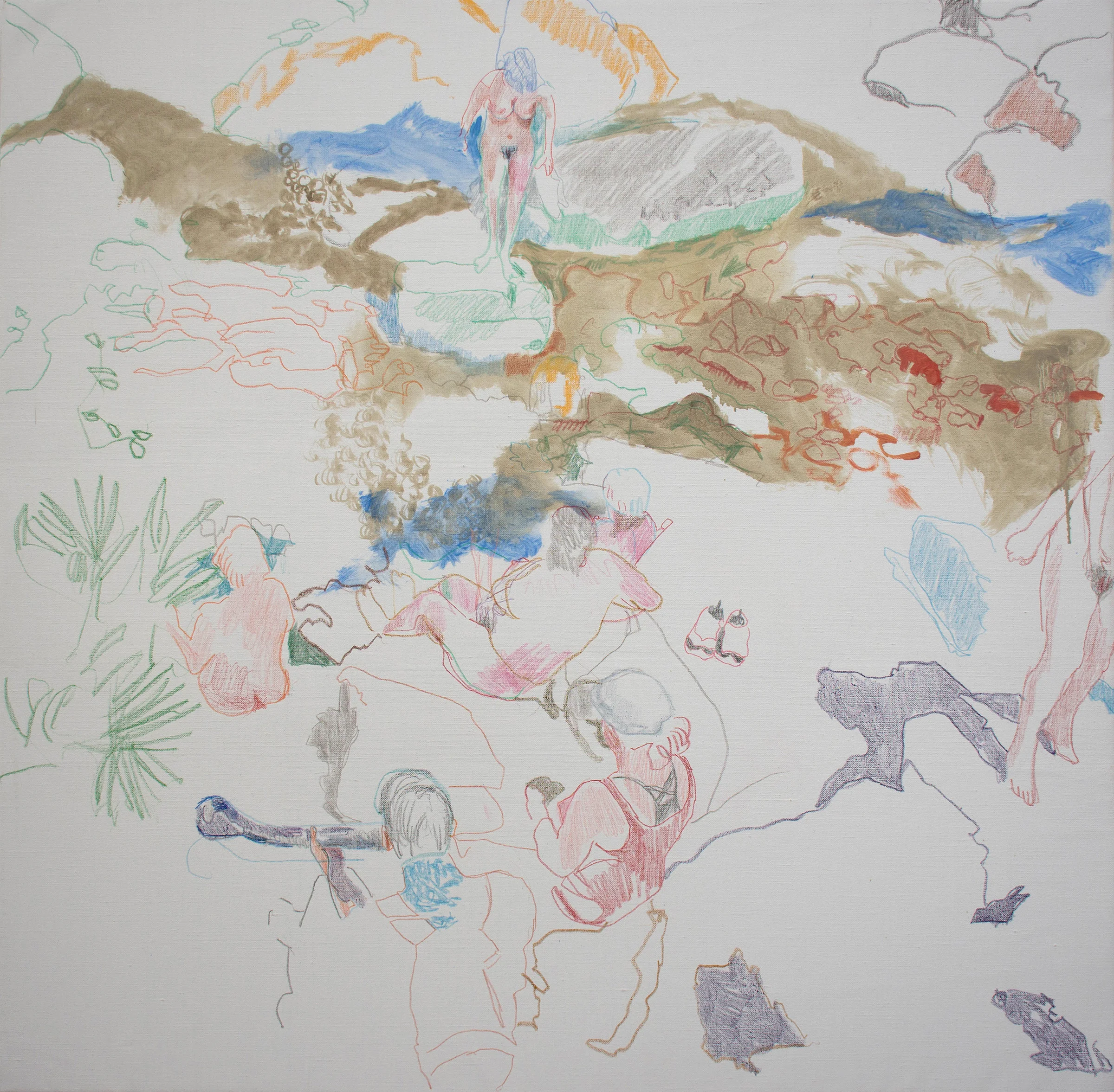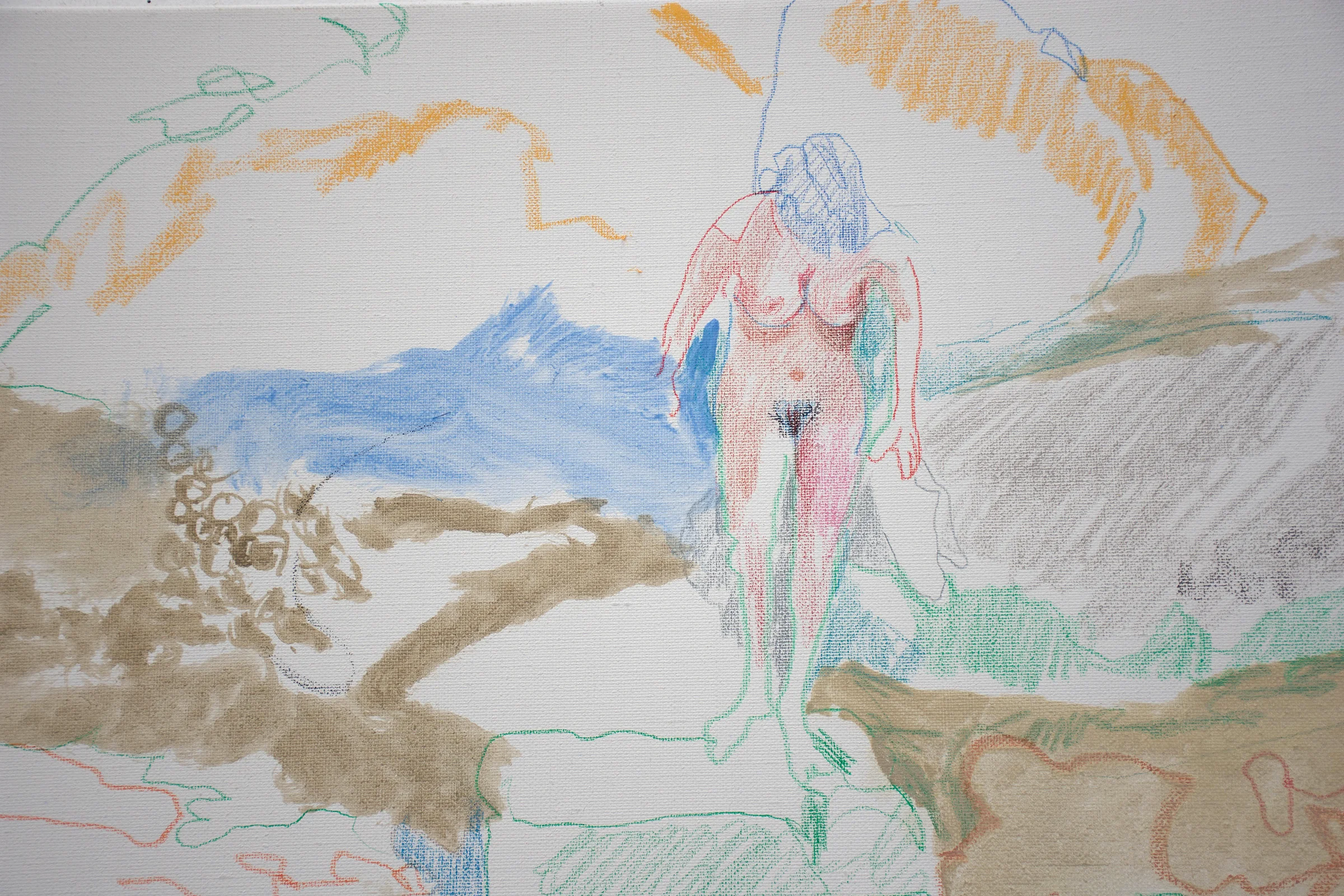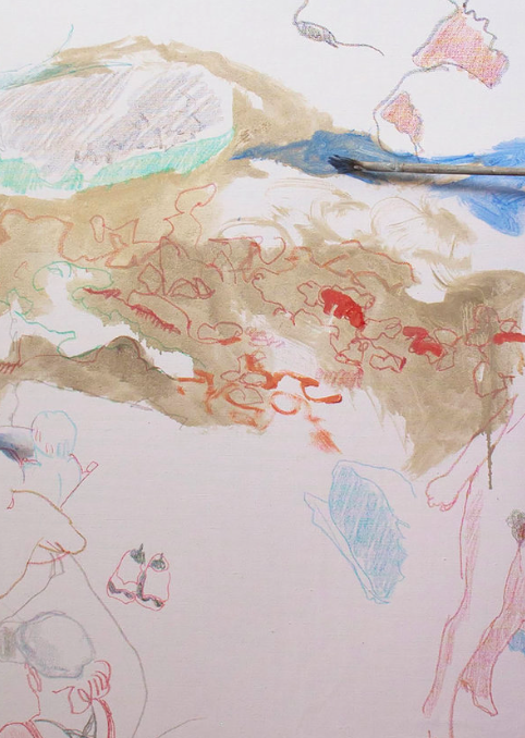 4:37 PM: the introduction of figures is new in my motion series. what will become of them as i continue work tomorrow is up in the air. right now, 19th c. french painting springs to mind, when figures in the landscape were a thing. when i encountered all the visitors at fish creek falls neat steamboat springs a few days ago, i was struck by their relationship to the rocks and water, and shot lots of photos with my phone. the guy in the lower left with the blue shirt is playing a digereedo. none of the figures were nude, but it seemed to me they should have been. whereas at first i was shocked by how many visitors there were, i soon began to see them enriching the landscape, and knew i'd be painting them. BELOW: 3 details: