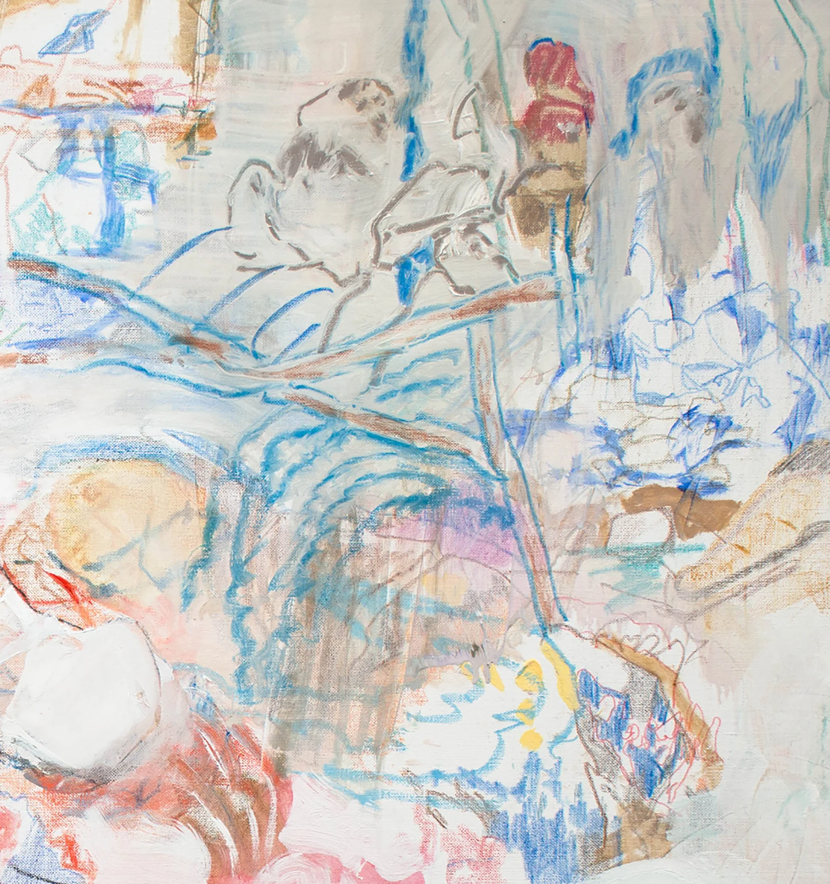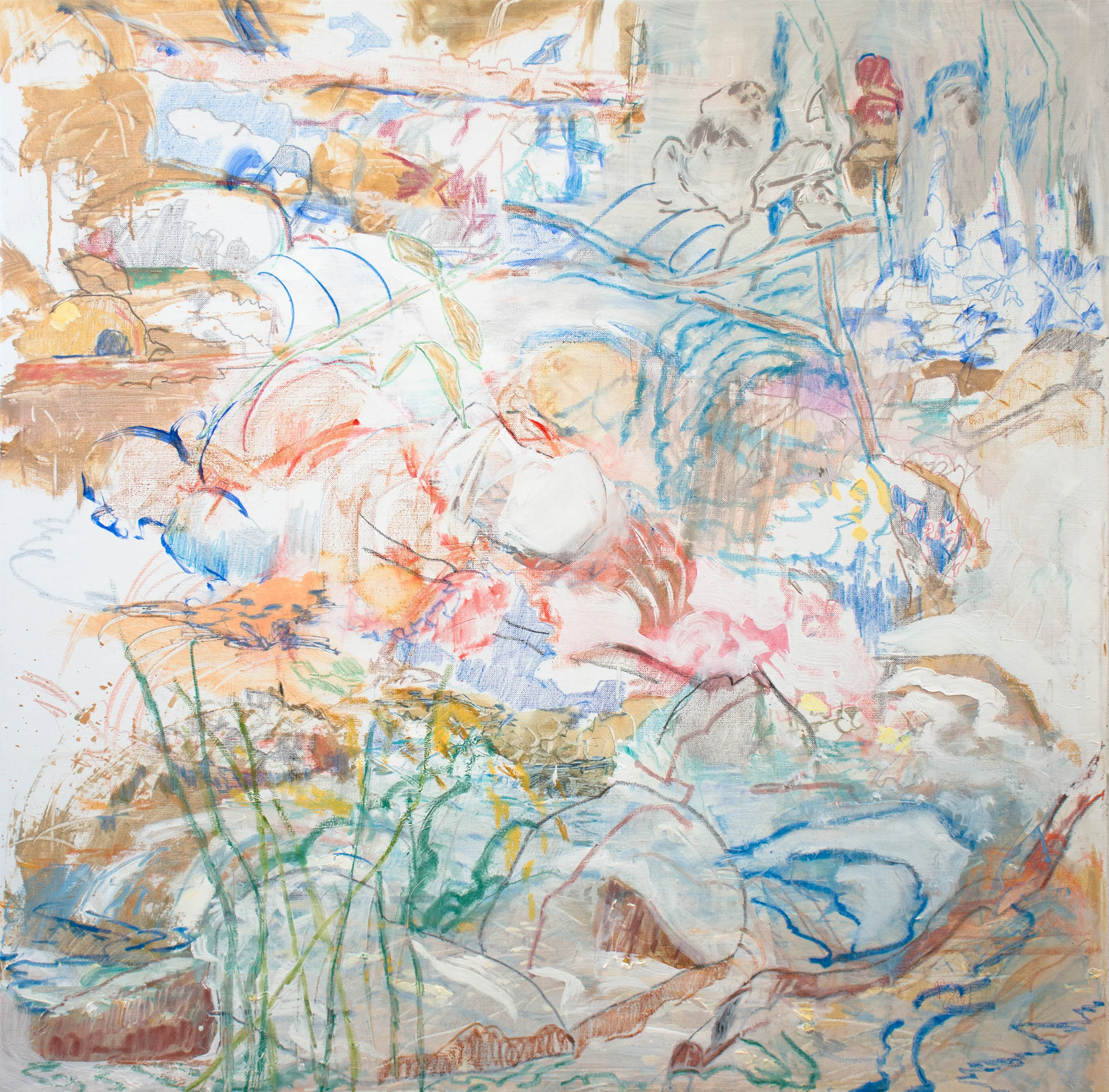 12:39 PM: this morning upon entering my studio, i felt motion 29 needed work, so that's how i spent my morning. i feel good about the changes, which created a more consistent movement in the composition, eliminating some elements of the previous composition, especially in the lower third of the canvas, which drew your eye to the detriment of the top 2/3. as well, i felt there wasn't enoush breathing space, so the painting seemed busy & separated into distinct elements, with no unifying sweep for the eye to move over the surface.